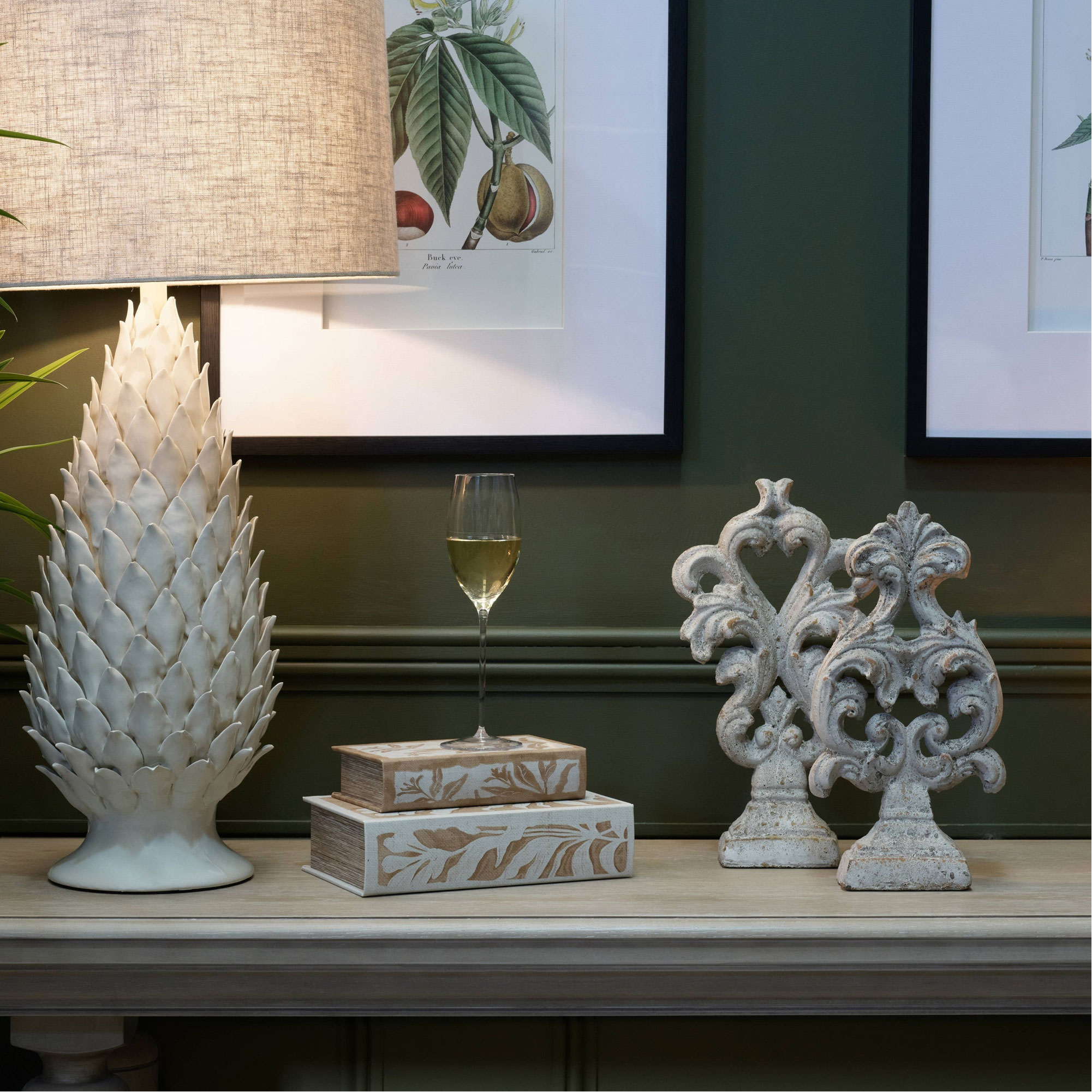 The Roman Finial from Mindy Brownes is a decorative piece inspired by classical architectural motifs. Its ornate openwork design features flowing curves and intricate detailing that recall the elegance of historic European stone carvings. The soft antiqued finish enhances its character, giving the finial a sense of heritage and quiet grandeur. Placed on a console table, mantelpiece, or bookshelf, the Roman Finial adds height, structure, and refinement to any space.