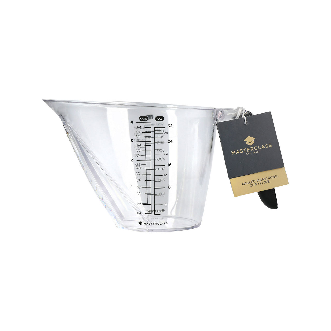 Take precise volume measurements in a fraction of the time with this angled 1L measuring jug from MasterClass. This ingenious kitchen gadget features a sloped front edge with printed measurements, so you can fill the jug from above and see exactly how much liquid is inside. This means you don’t have to waste time filling, checking and adjusting. Just like traditional measuring jugs, the sides are printed too, in a clear, easy-to-read black typeface against perfectly transparent plastic. It also features a non-slip, comfortable handle and anti-drip pouring spout, so you’ll never waste a drop.