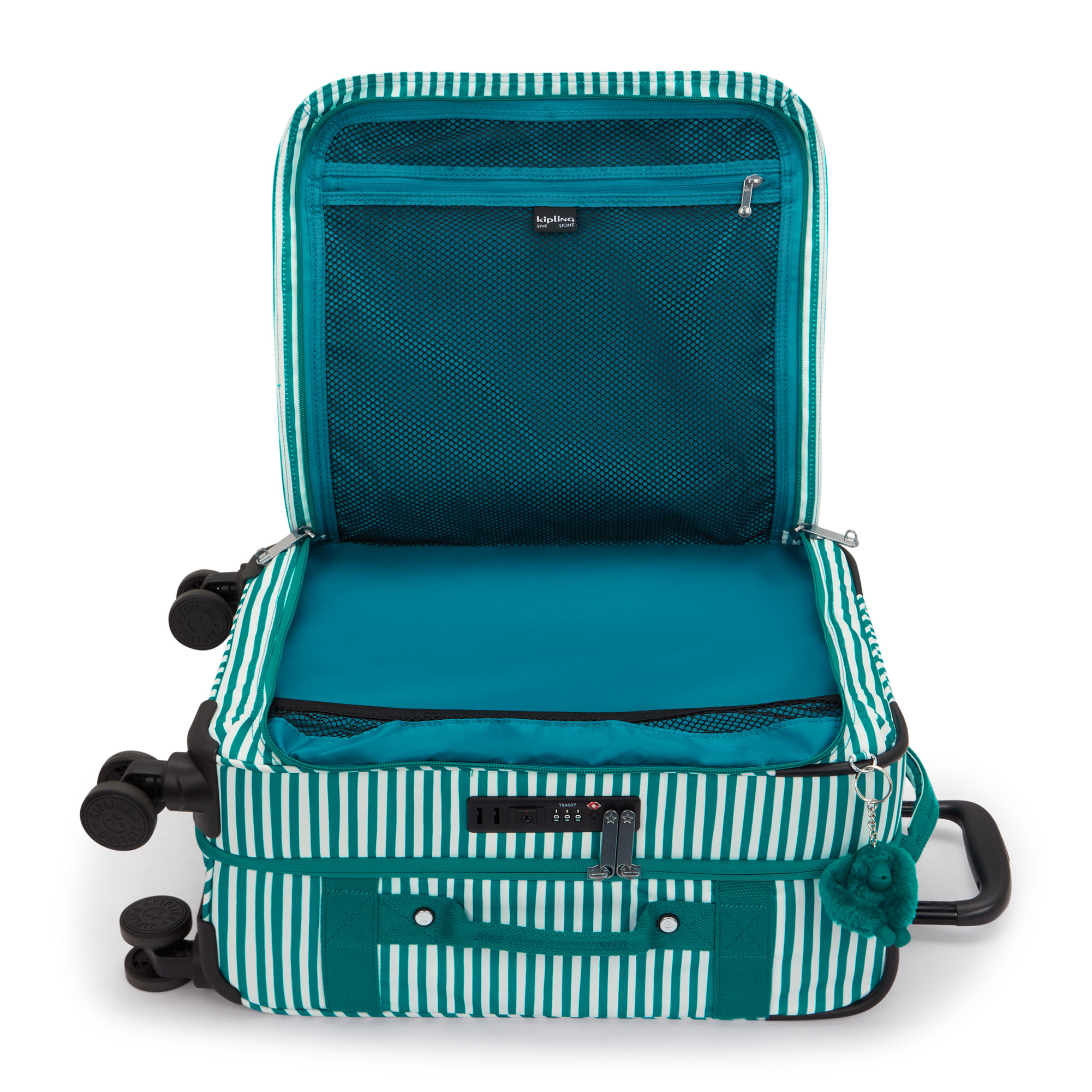 - Features: Interior: Zipped main compartment, zipped mesh inside pocket, cinch straps. Exterior: Two zipped front pockets, cinch straps, four dual 360° rotating wheels, top carry handle, side and front carry handles, double TSA lock