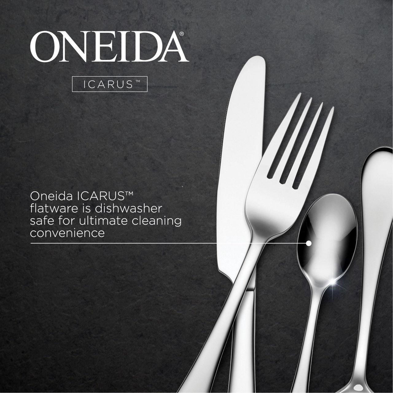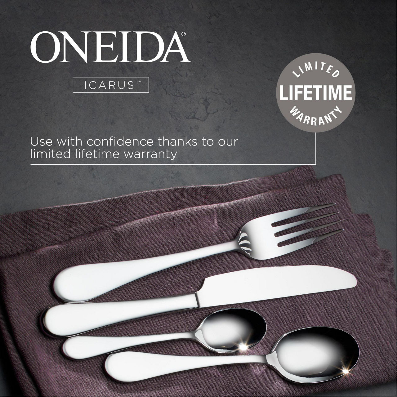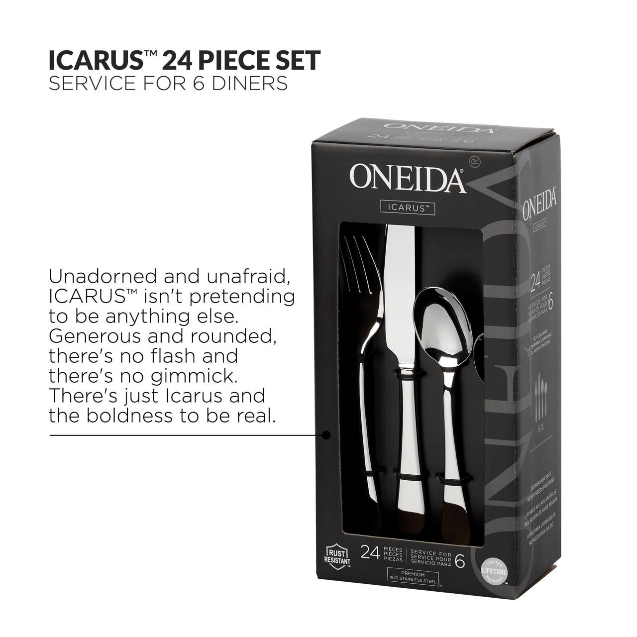 Icarus 24pce cutlery set is generous and rounded in design, there's no flash and there's no gimmick, just really comfortable cutlery. The set includes 6 table knives, 6 table forks, 6 dessert spoons and 6 teaspoons. Oneida has generations of expertise in cutlery - this is a range you can count on for years to come!