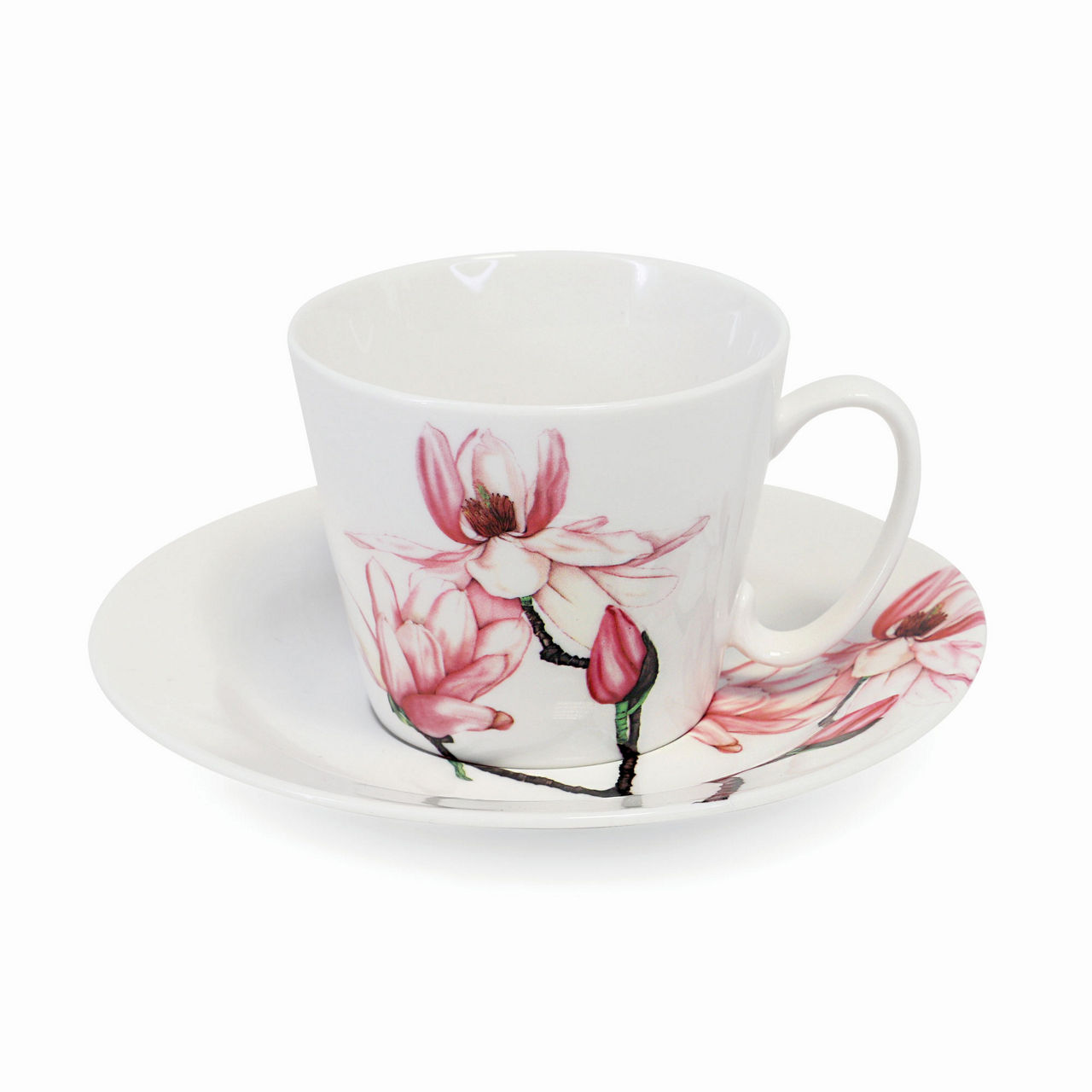 A Lynne Stringer set of two Cappuccino Cups and Saucers with Magnolia and Sweet Pea designs on a clean white base.