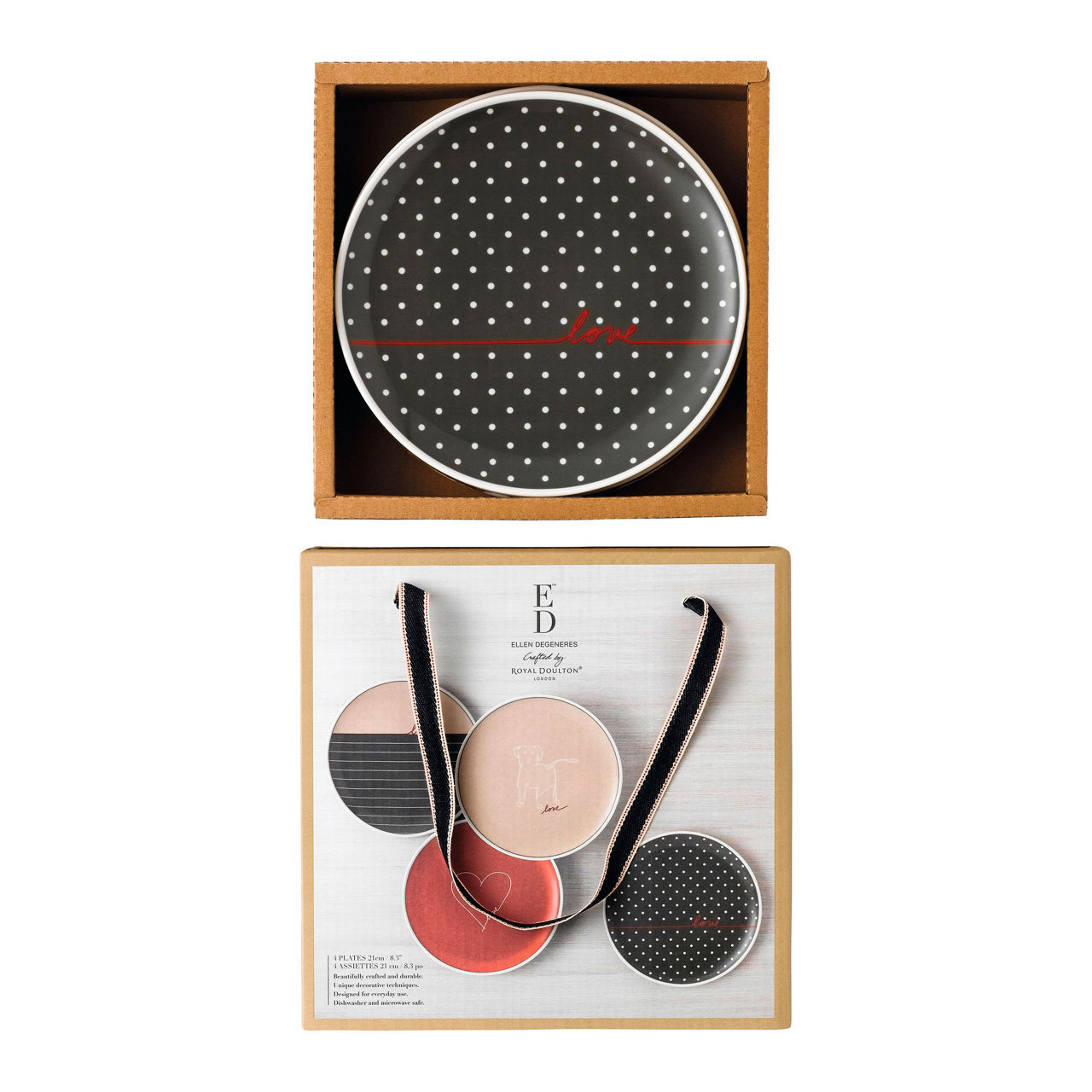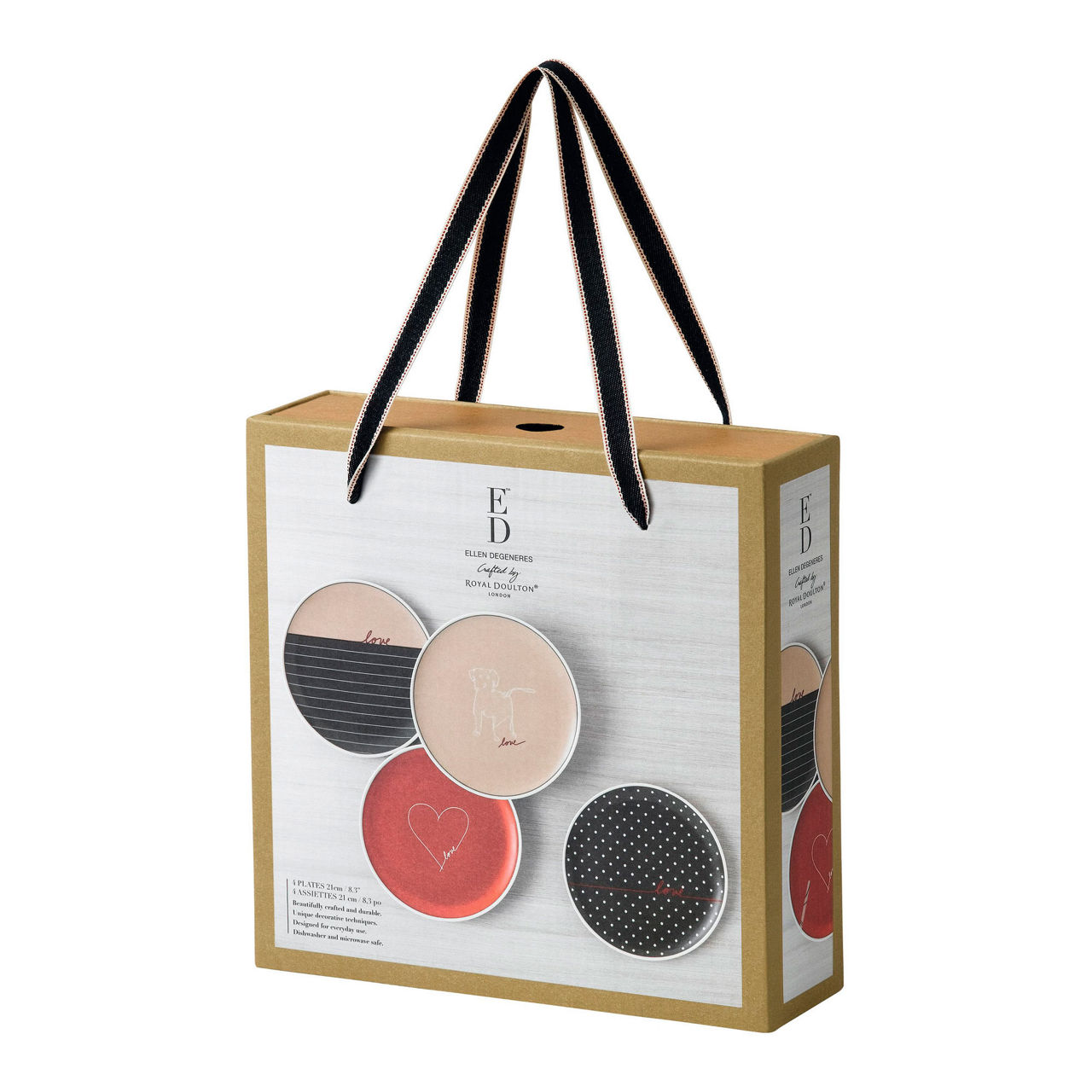 <p>The ED Ellen DeGeneres Crafted by Royal Doulton collection Love Signature Gift Sets feature hand drawn graphic details in red, taupe, grey and white. There are polka dot and stripe motifs inspired by Ellen’s bed linen patterns, the quirky dog showing her love of animals and a heart, her favourite symbol. Ellen’s distinctive love signature on each piece also reflects her warm personality. Designed as playful, colourful accents used together or layered with the wider collection these original ‘signature’ additions perfectly complement Royal Doulton’s casual mix and match tableware style.</p>
