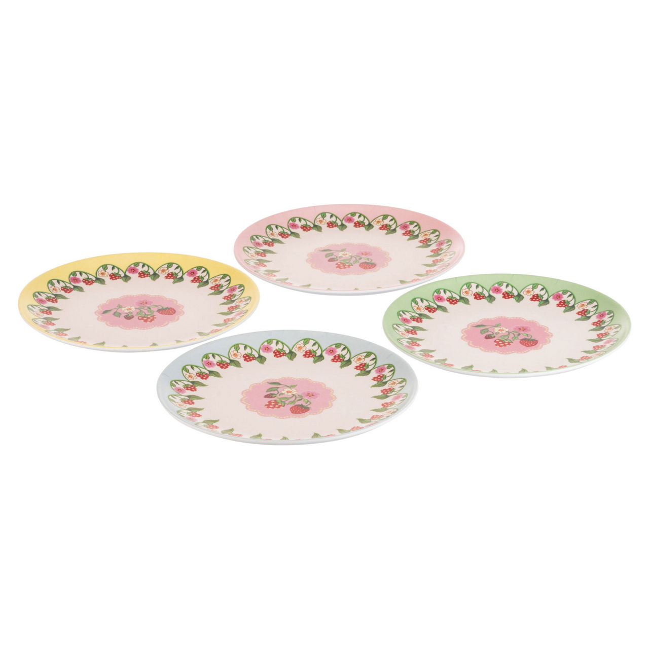 - Pack of four, assorted colours, strawberry print, lightweight, chip-resistant