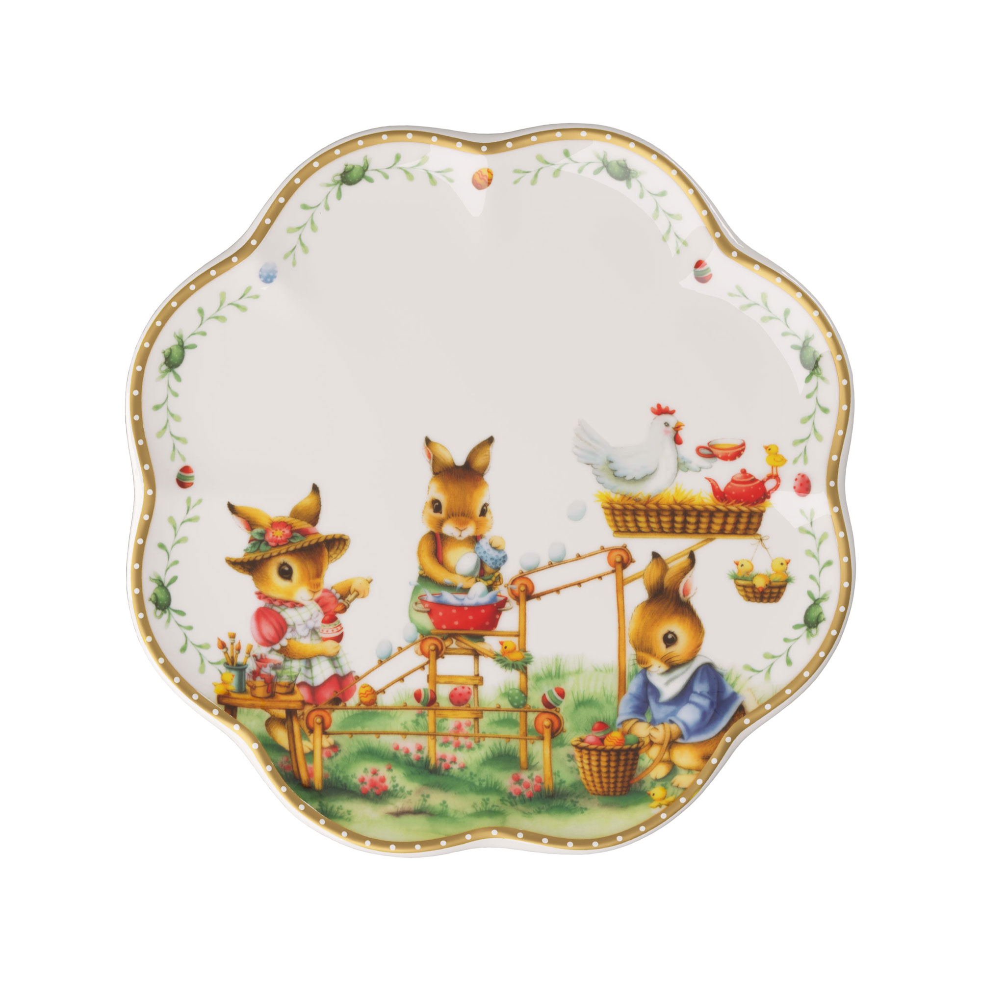 Villeroy & Boch Annual Easter Edition 2026 – annual plate: the soft floral shape focuses attention on the detailed pattern of the bunny children at the egg-painting machine. Delicate gold accents add a beautiful touch to the decor and give the premium porcelain a gentle sheen.