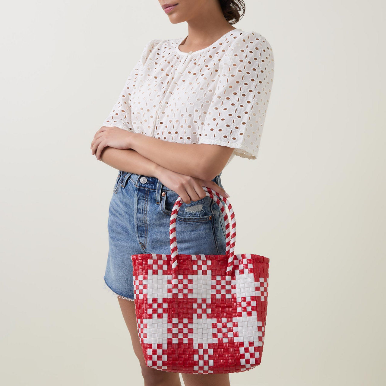 Handmade by skilled weavers in the Oaxaca region of Mexico, the Lily bag from Lalo takes approximately five hours to make. Woven from recycled plastic in a checkerboard pattern, the simple design is carried by two tonal top handles that open to reveal a spacious interior for all your essentials — and some groceries too.