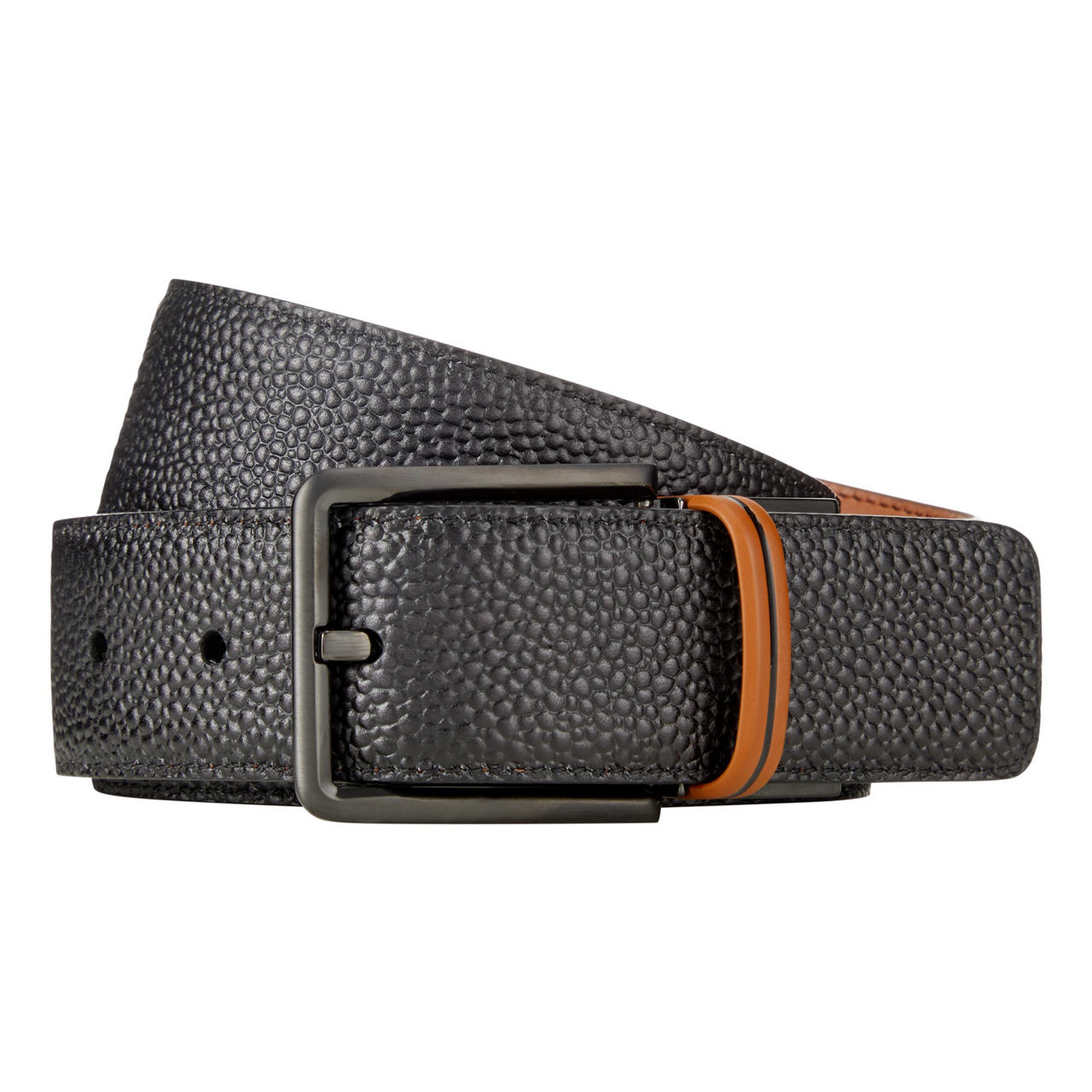 - Buckle fastening, reversible design, adjustable, square tip, grained leather finish