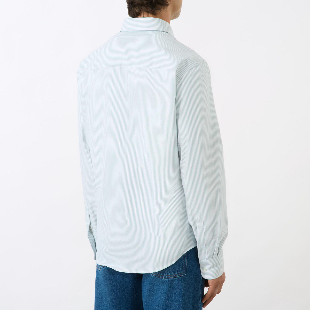 - Long sleeves, button-down collar, logo embroidery, all-over striped pattern, button fastening, tonal stitching, single-button cuffs, curved hemline, smooth fabric