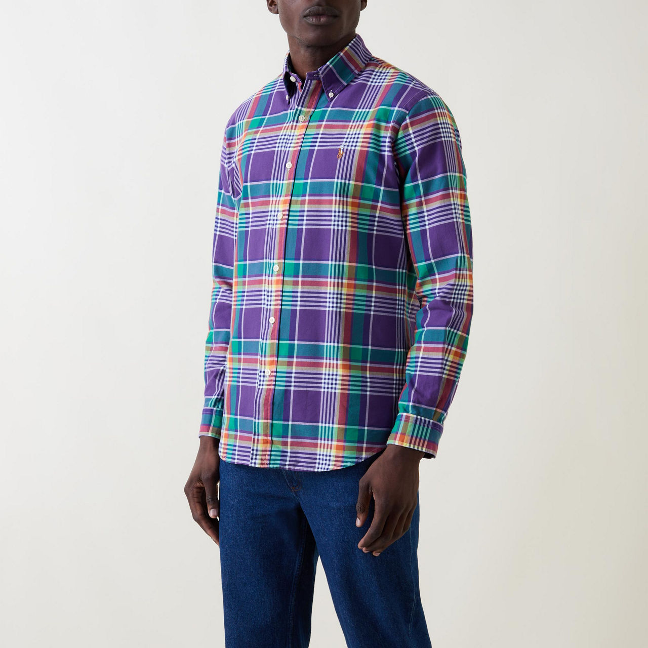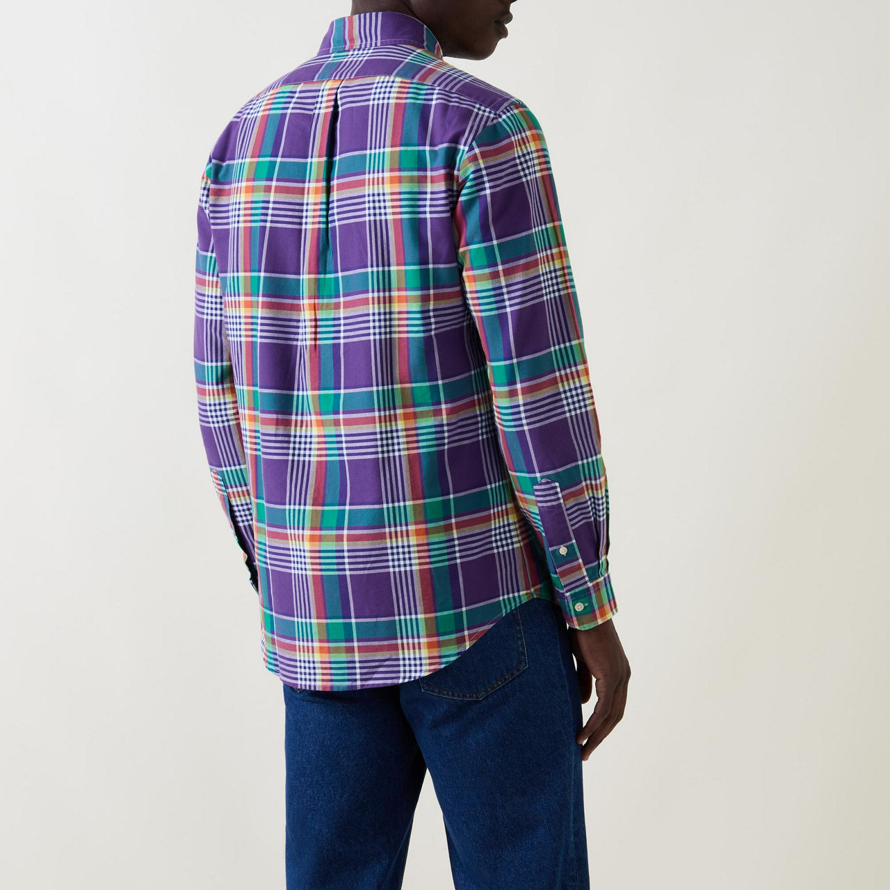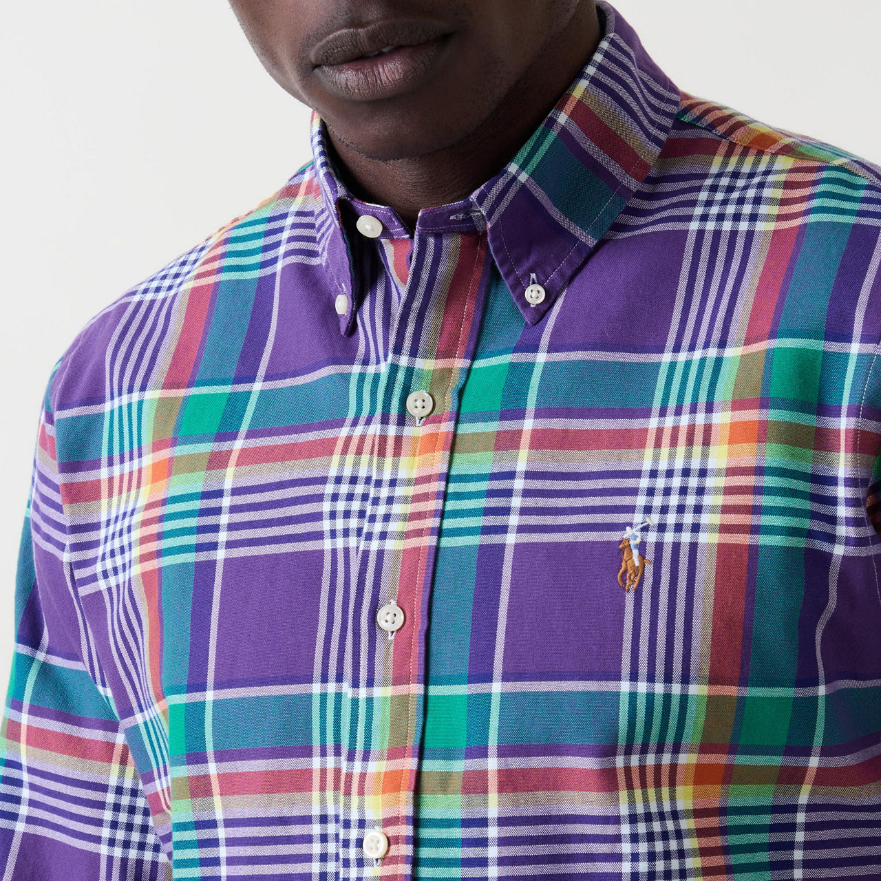- Button -down collar, curved hemline, check pattern, button fastening, box pleat at rear, embroidered logo detail