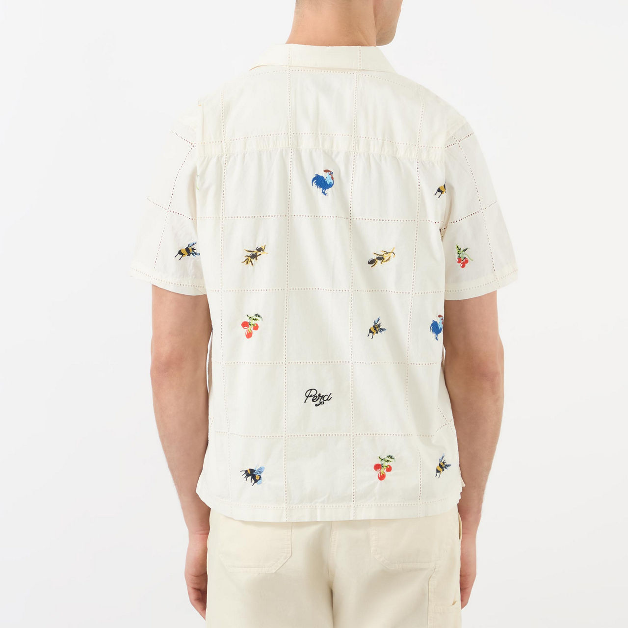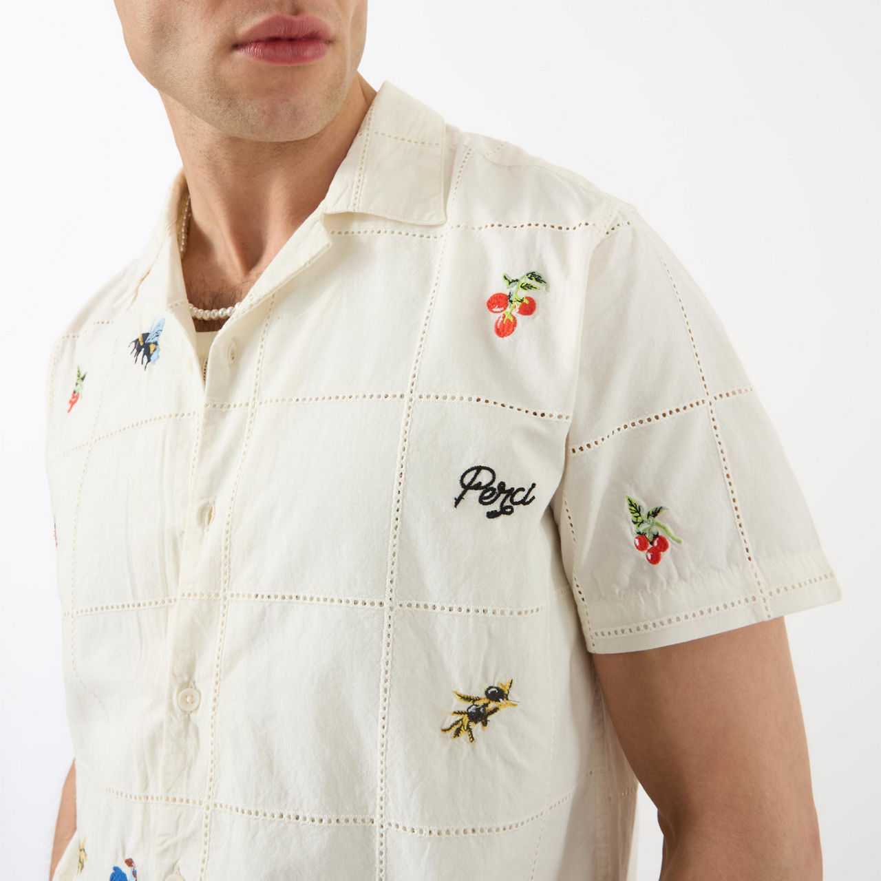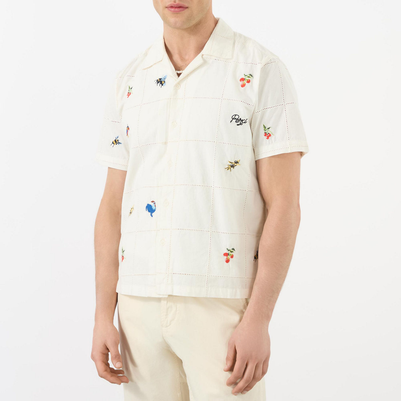 - Short sleeves, slightly cropped, olive embroidery, button fastenings, patch chest pocket, boxy fit