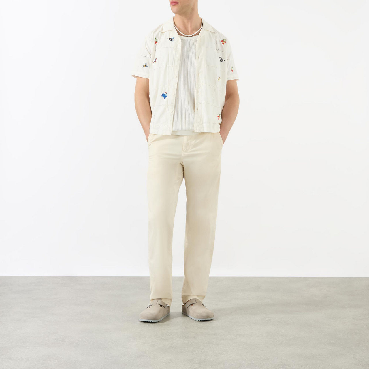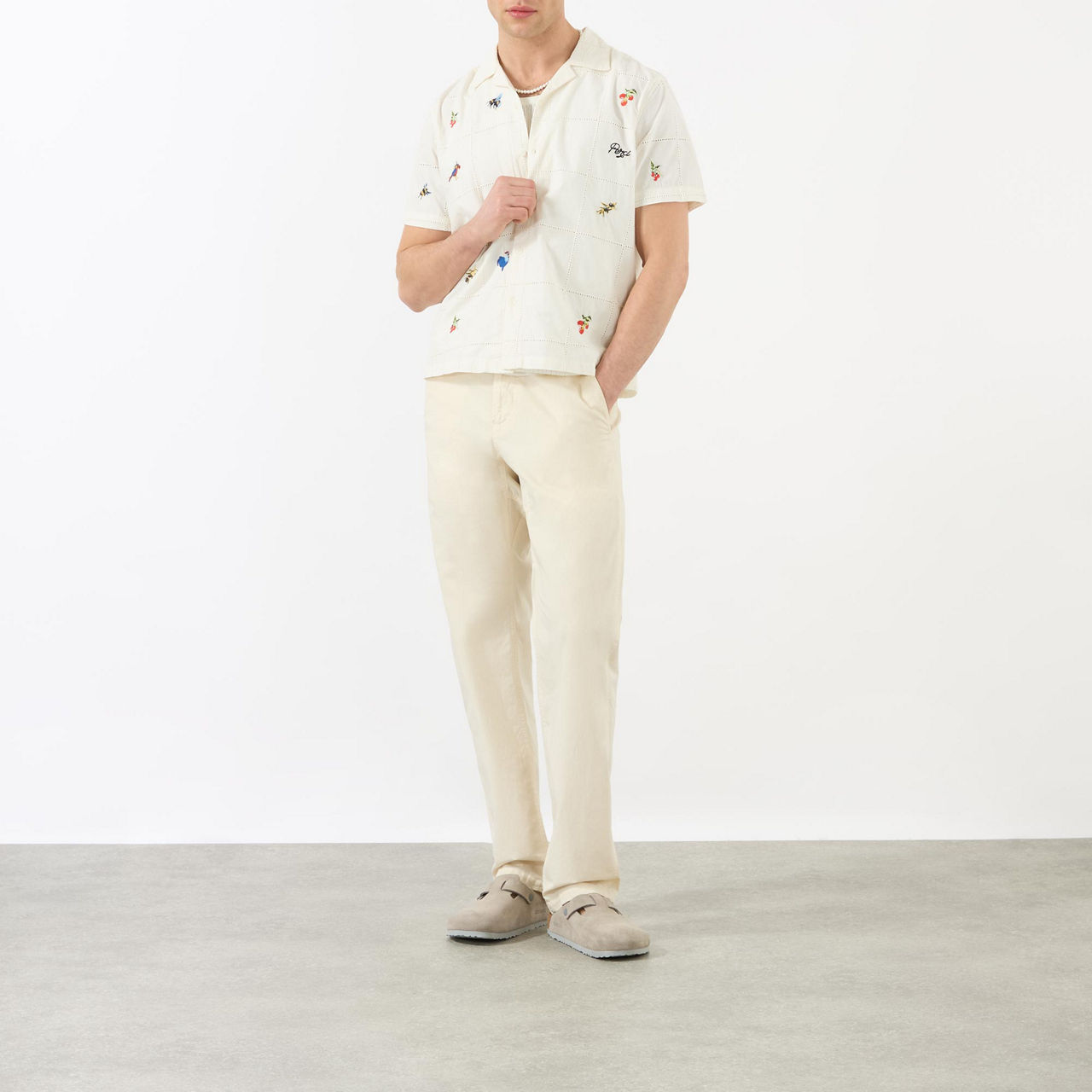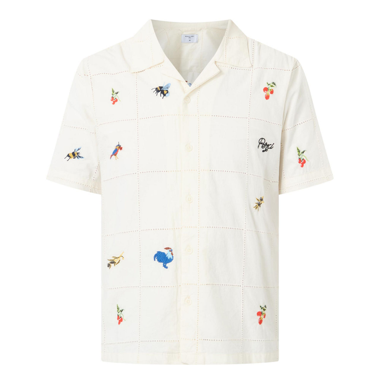 - Short sleeves, slightly cropped, olive embroidery, button fastenings, patch chest pocket, boxy fit