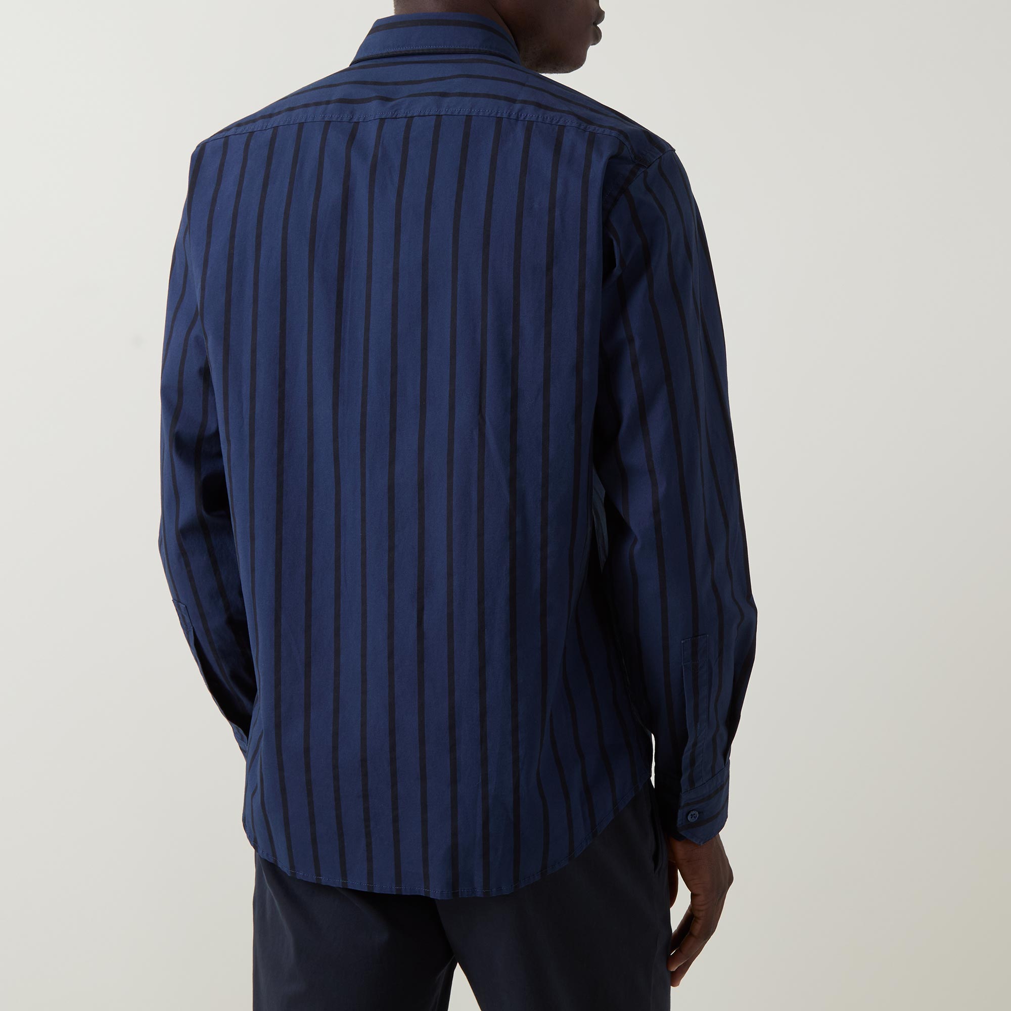 - Striped design, long sleeves, pointed collar, logo detail, button fastenings, curved hemline