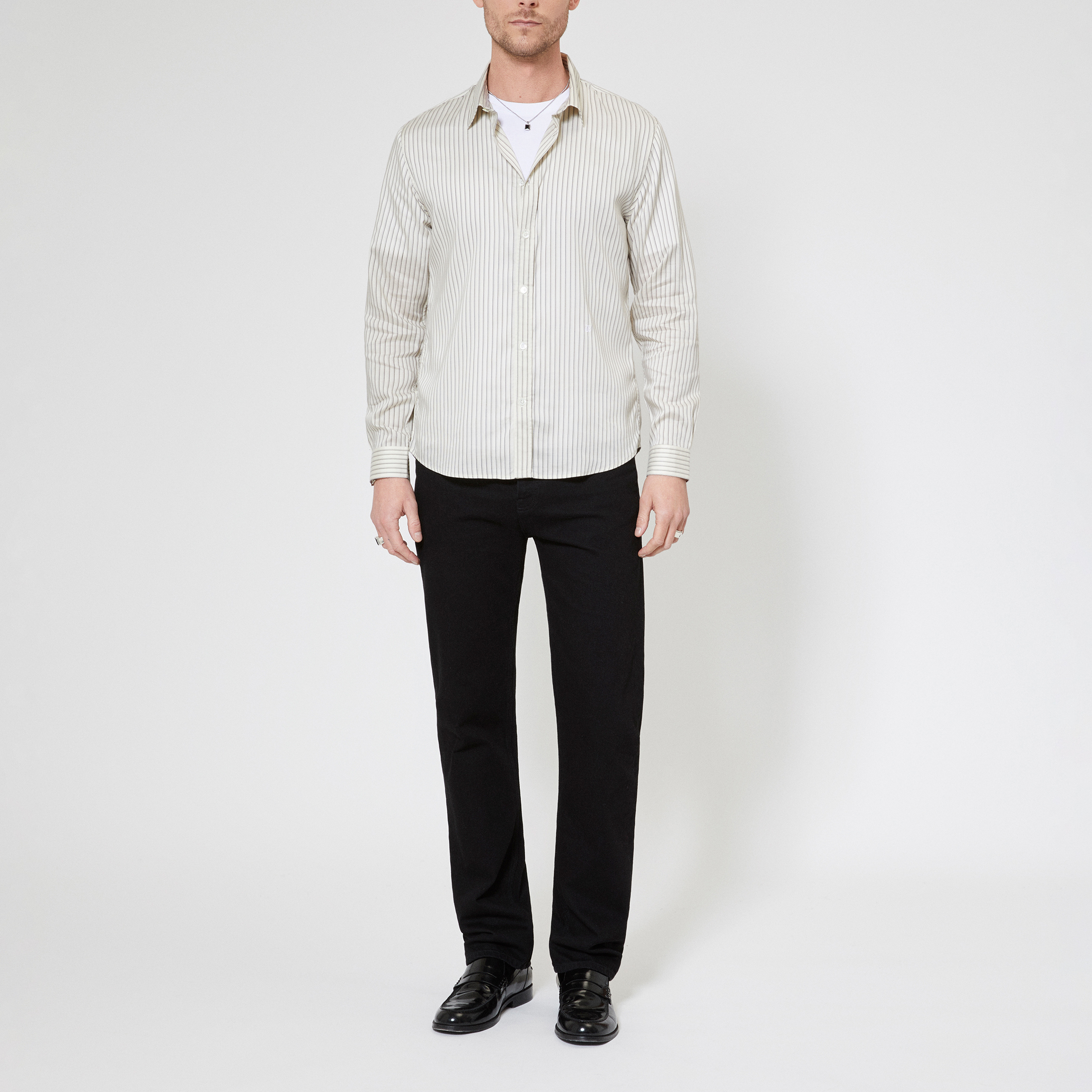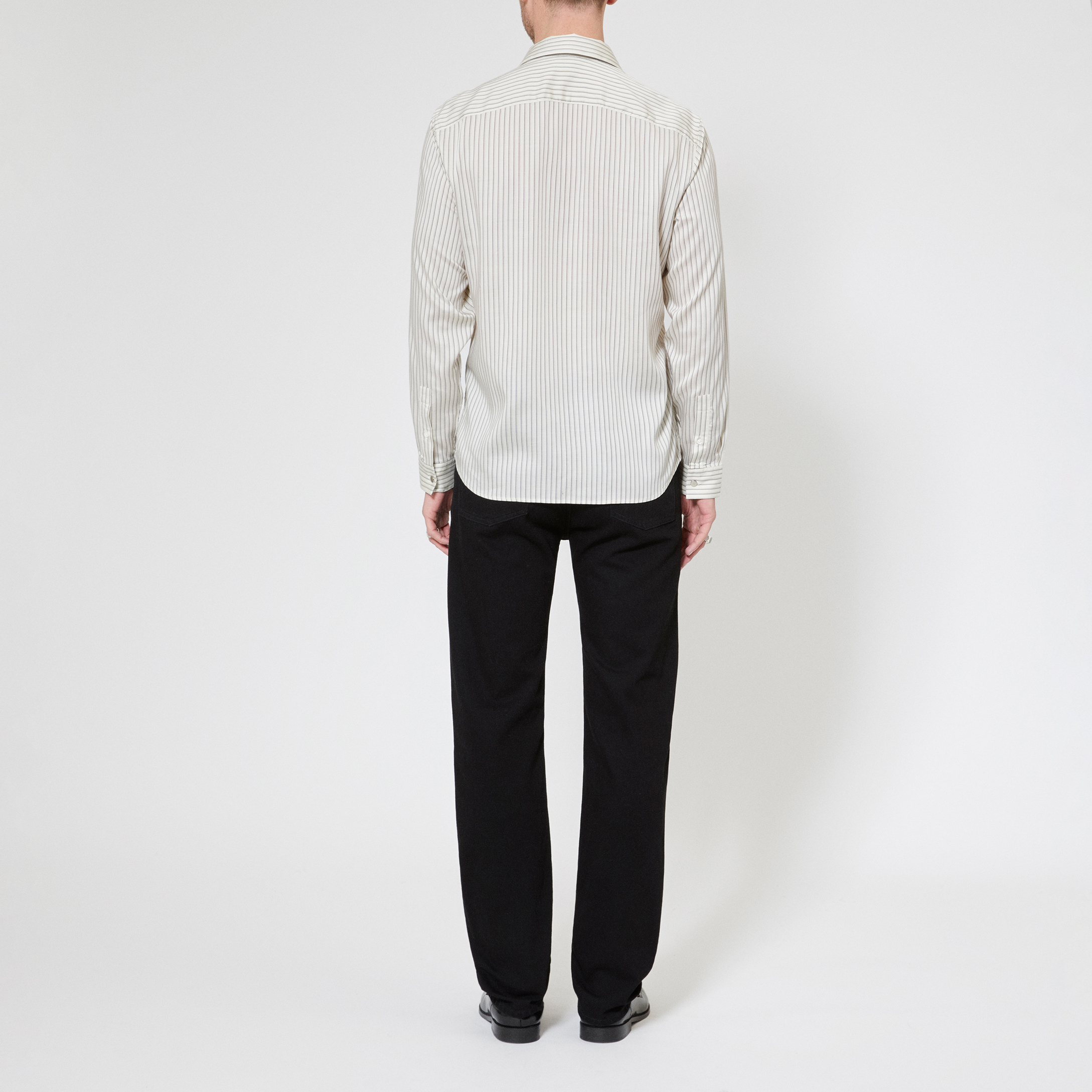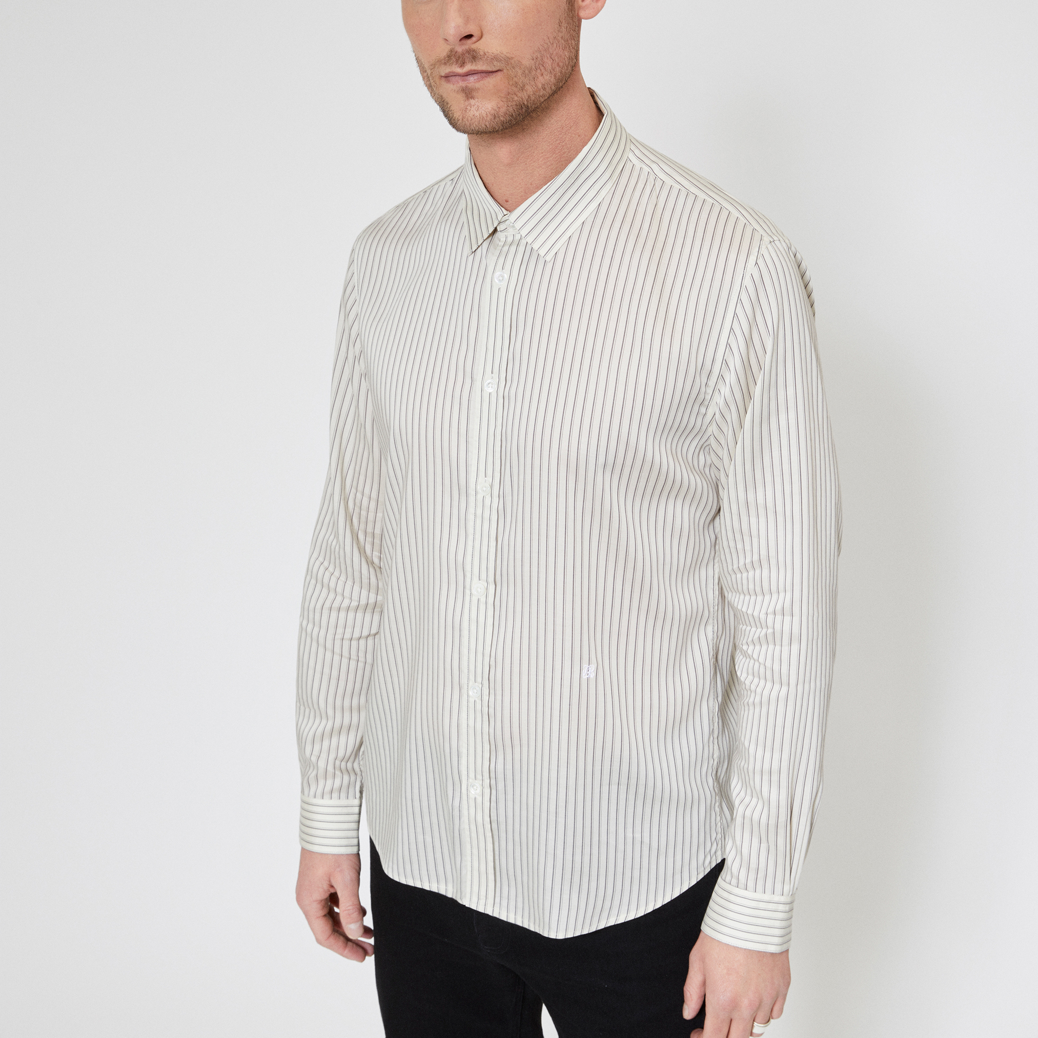 - Fitted cut, classic collar, long sleeves, tone-on-tone buttons, rivets at cuffs, tone-on-tone logo embroidery