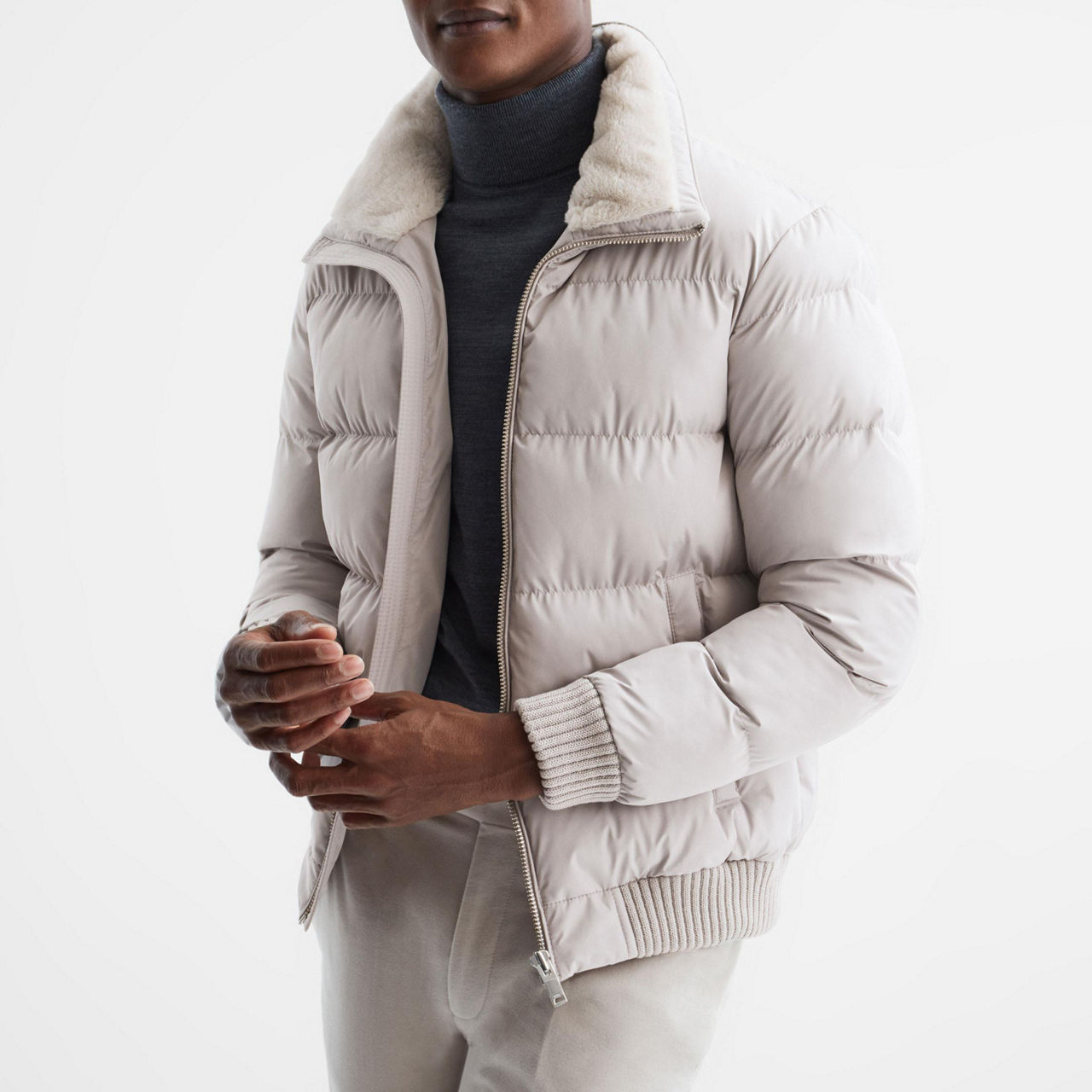 Layer up in style with the Frost Puffer Coat from Reiss. Padded for extra insulation, it's both practical and cool with its faux fur collar and ribbed trims. Wear it over all your winter knits for a cosy, casual feel.