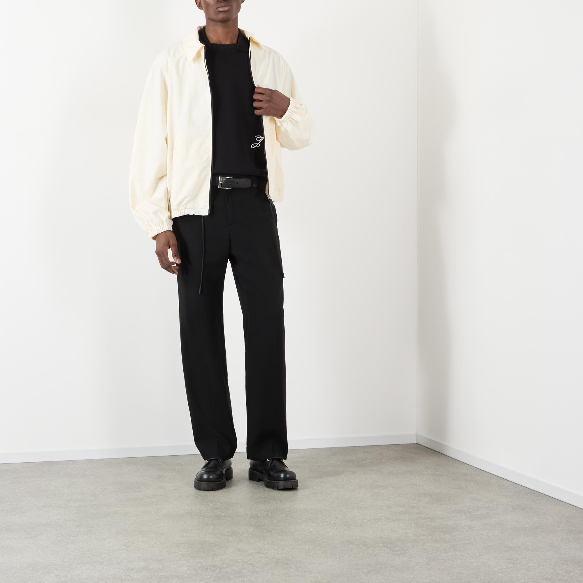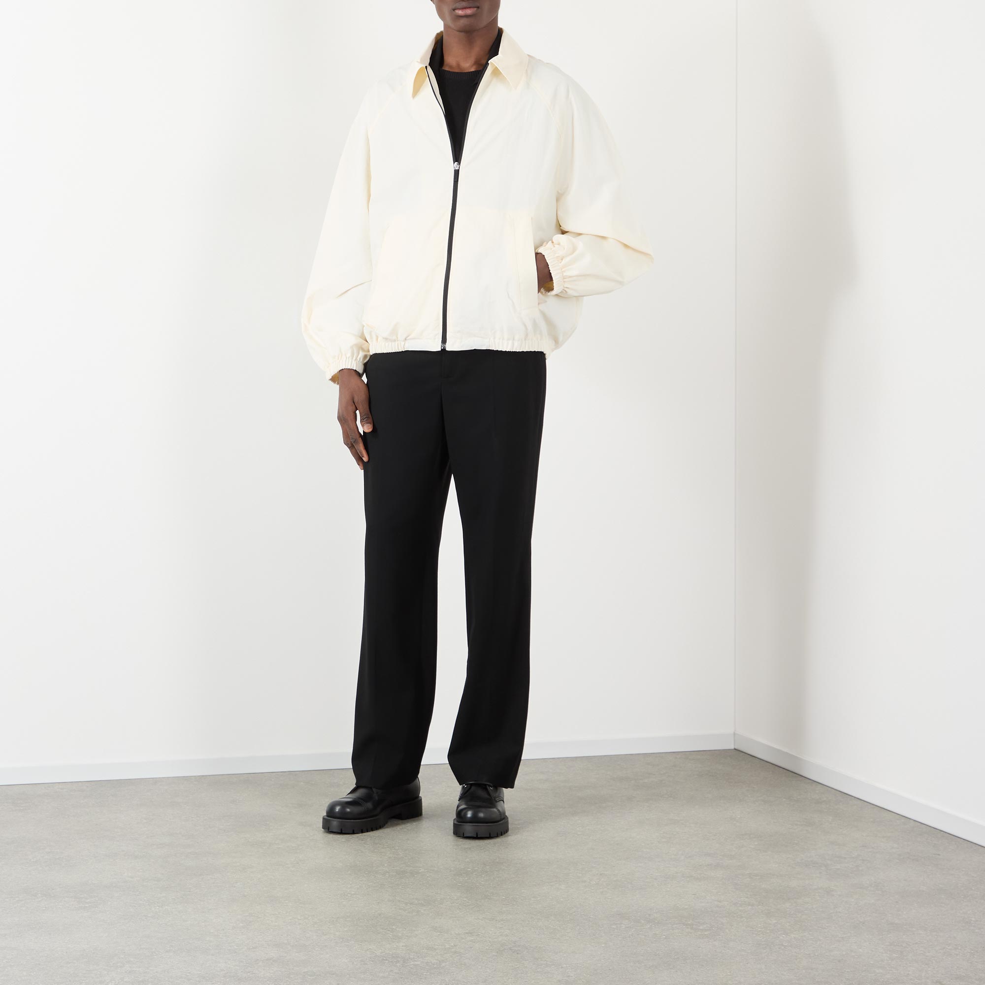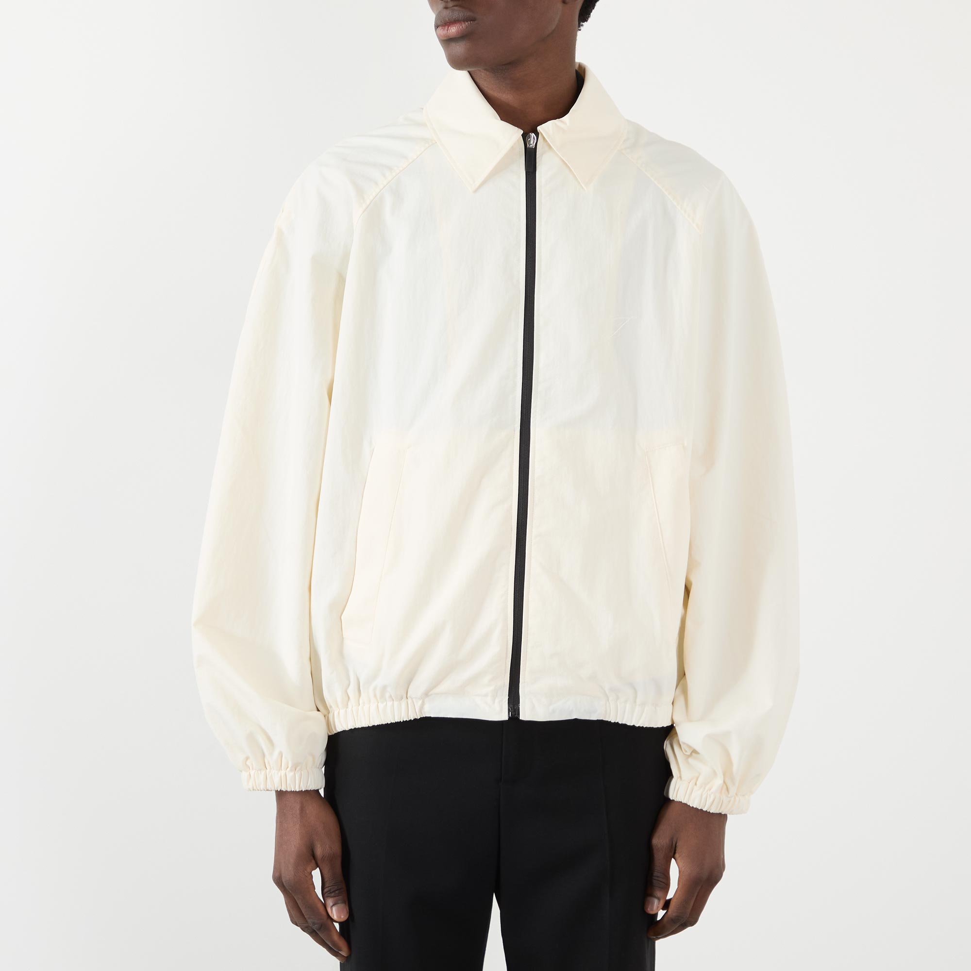 • Point collar, dropped shoulders, long sleeves, front zip fastening, two side entry pockets, straight hem, elasticated trims, rear tonal logo detail