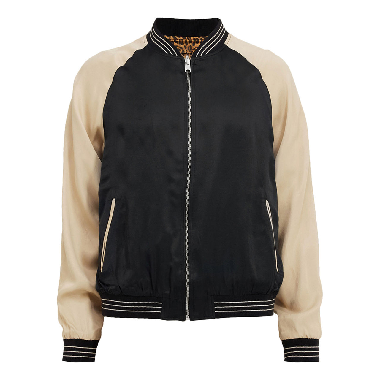 - Reversible design, leopard print on one side, black with ecru design on the other, varsity-inspired style, bomber collar, long sleeves, front zip fastening, two side slit pockets, striped rib-knit trim, satin finish