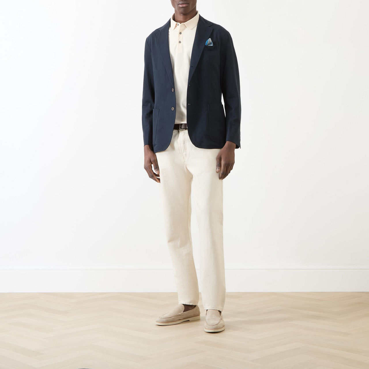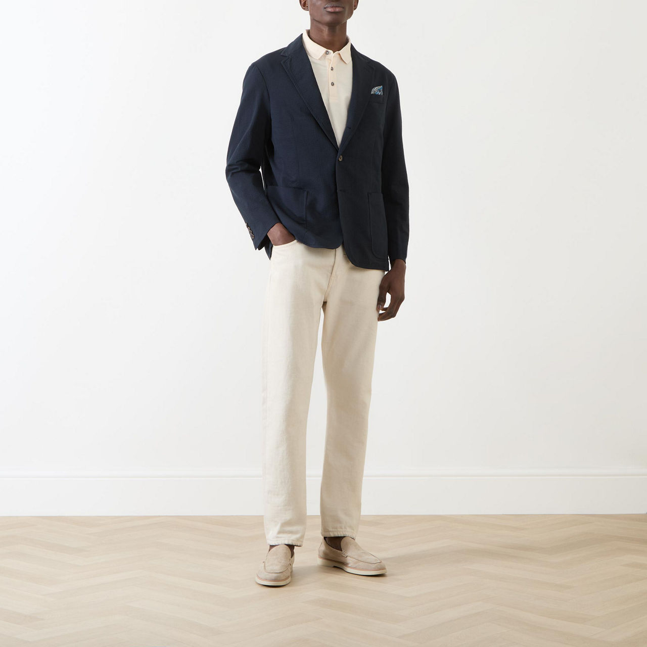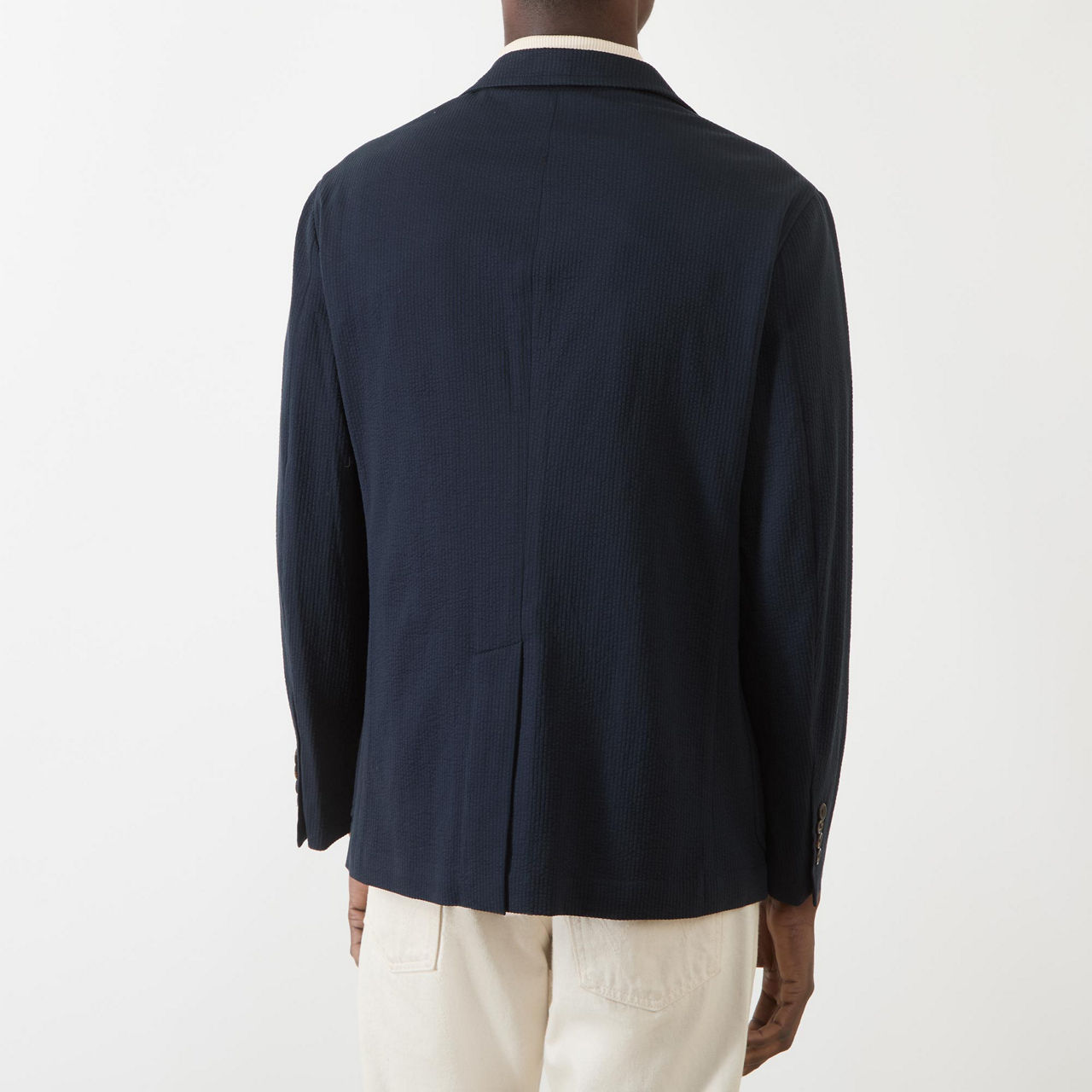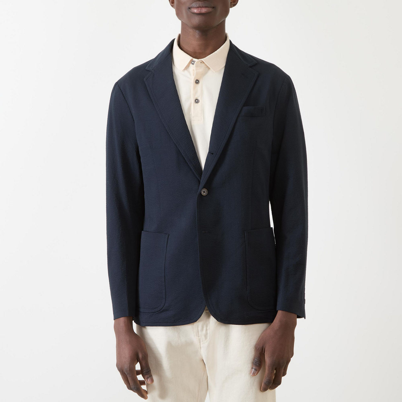 - Single-breasted front, long sleeves, notched lapels, button fastening, chest welt pocket, two side patch pockets, buttoned cuffs, back hem vent, seersucker fabric