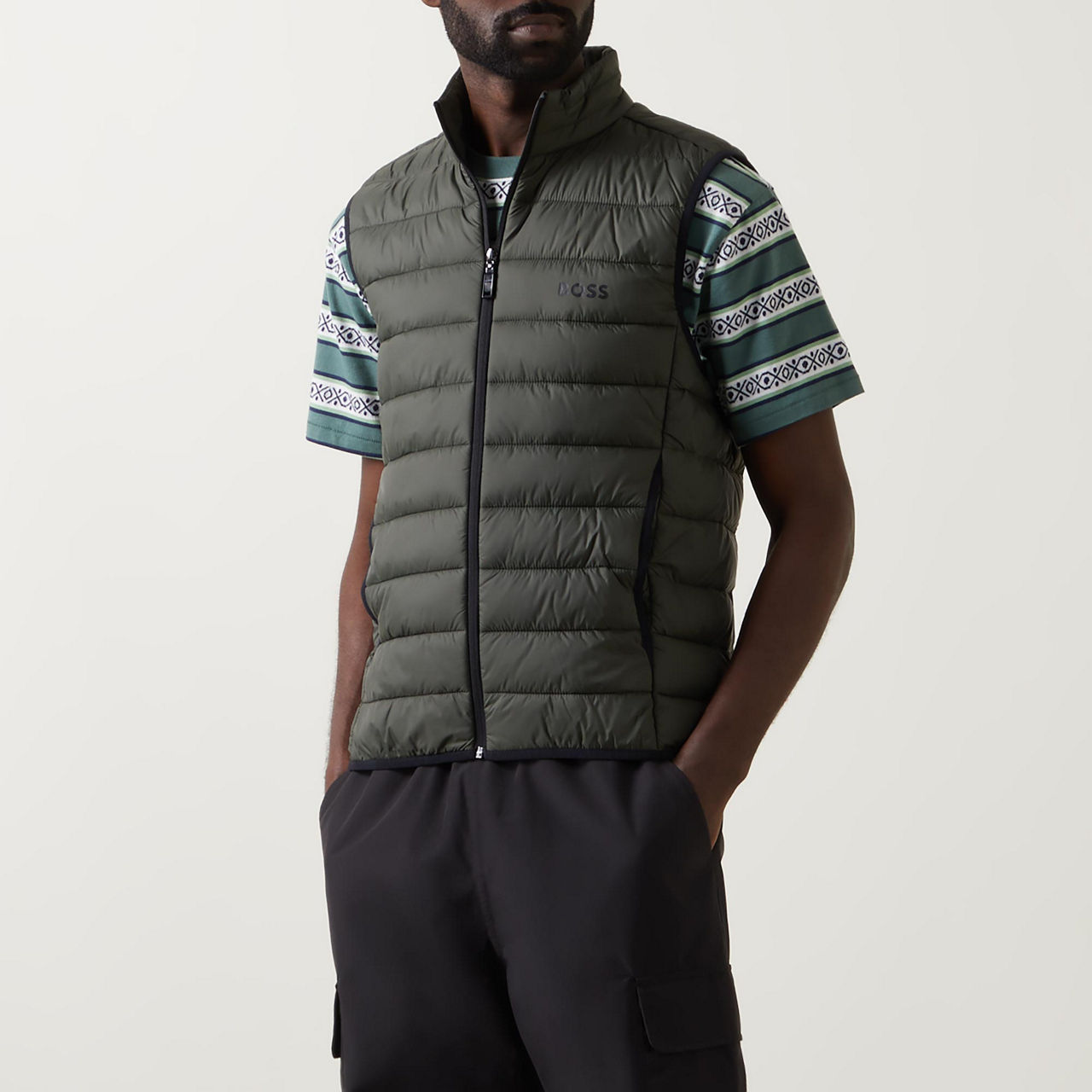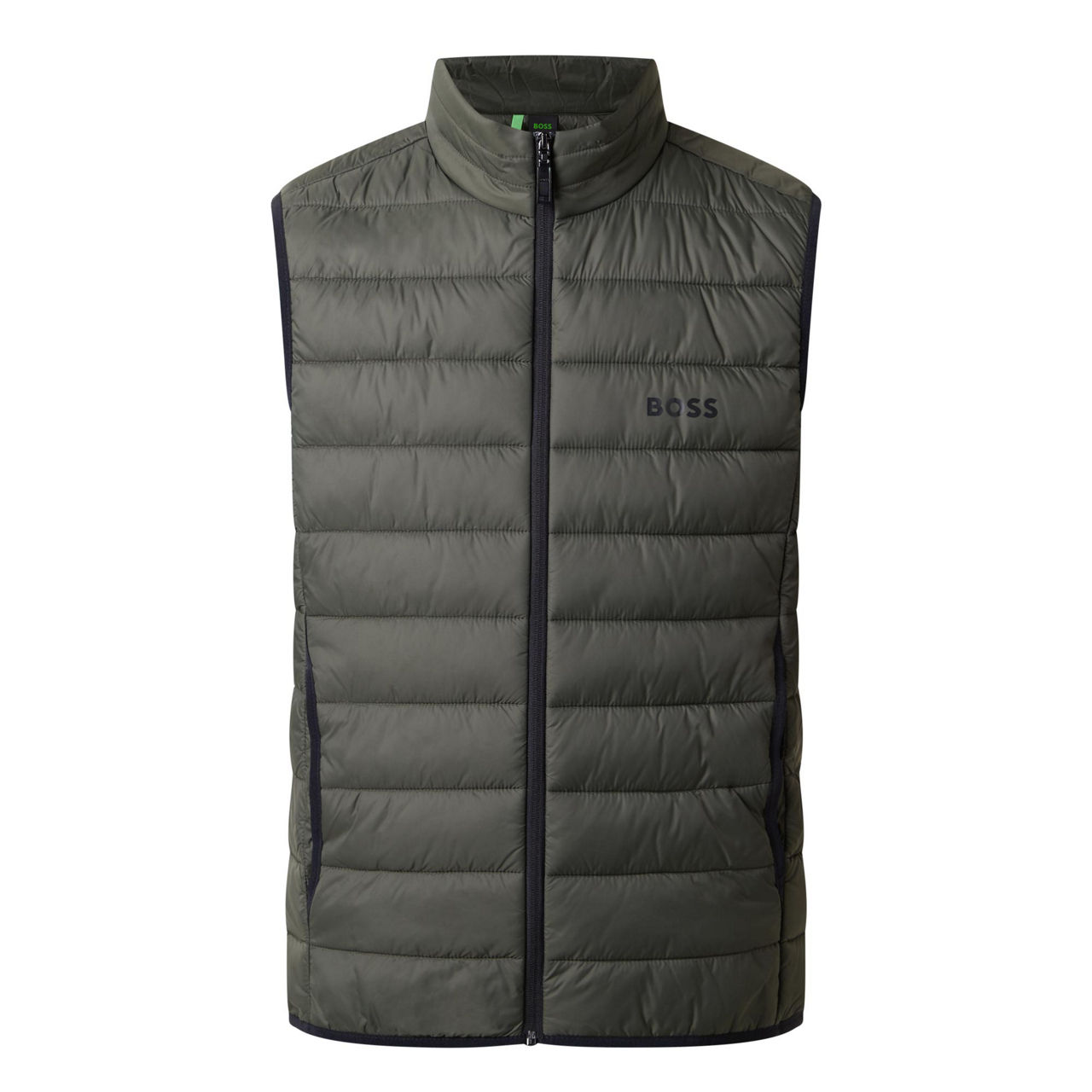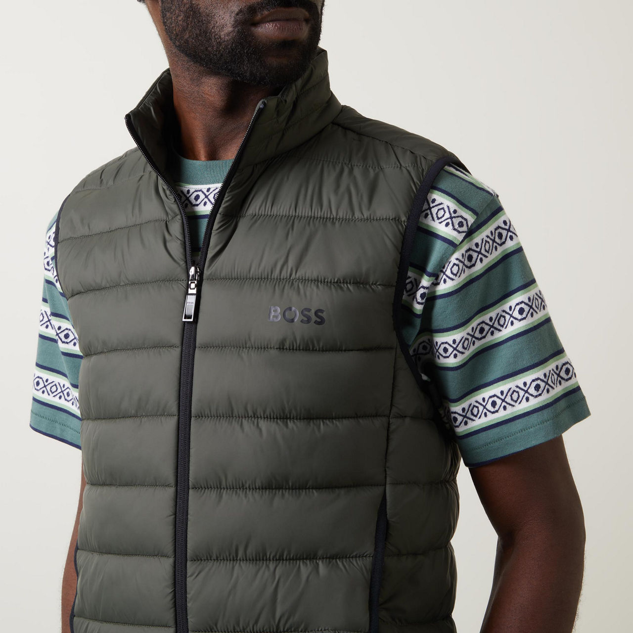 - Padded, sleeveless, logo detail, stand-up collar, straight hemline, side pockets
