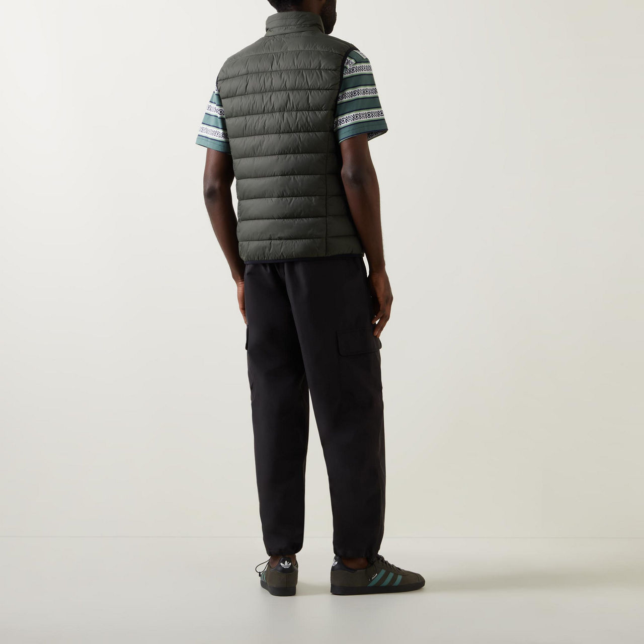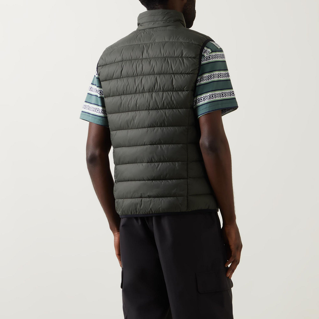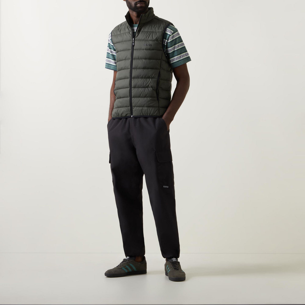 - Padded, sleeveless, logo detail, stand-up collar, straight hemline, side pockets