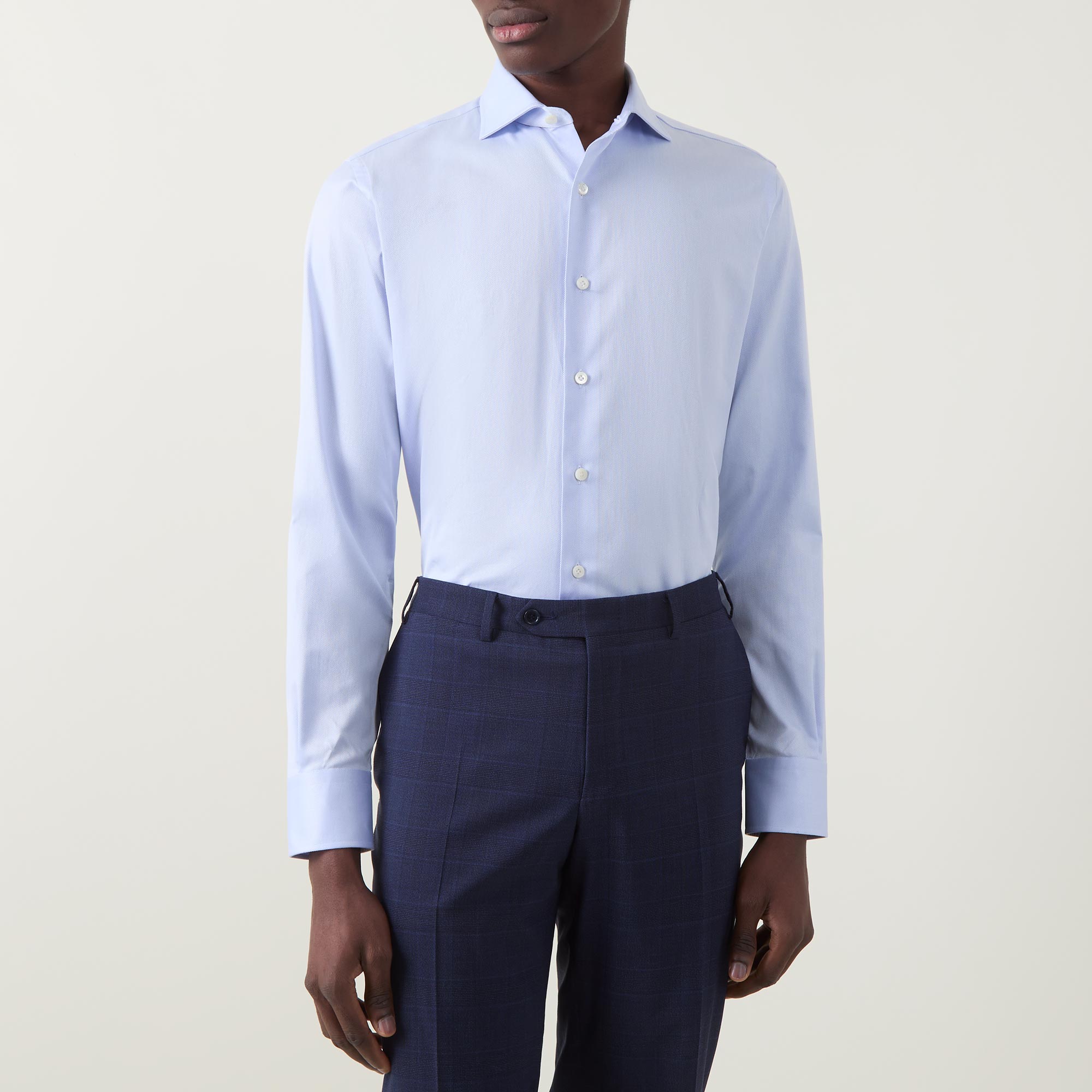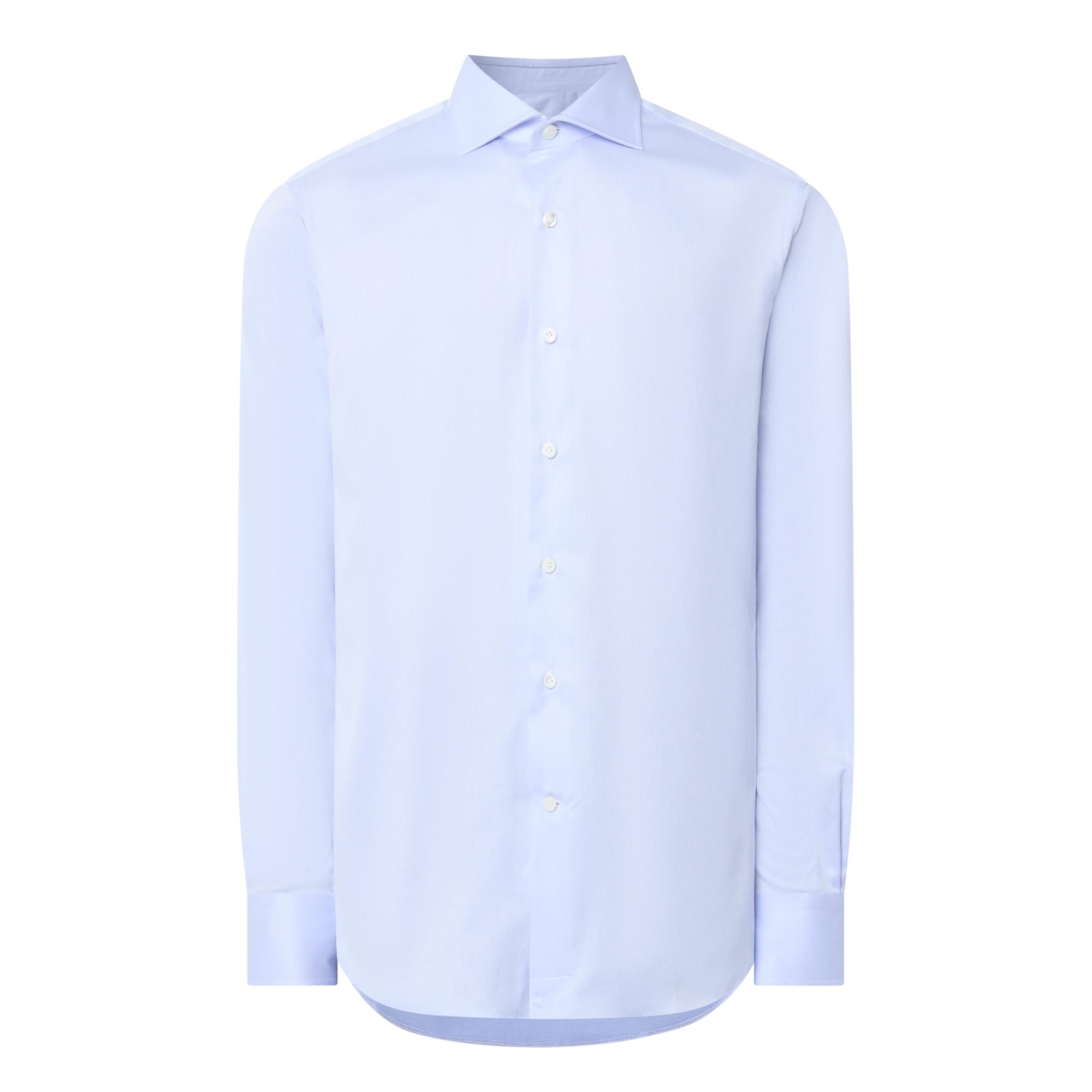 • Point collar, long sleeves, buttoned cuffs, front button fastening, curved hem, smooth finish