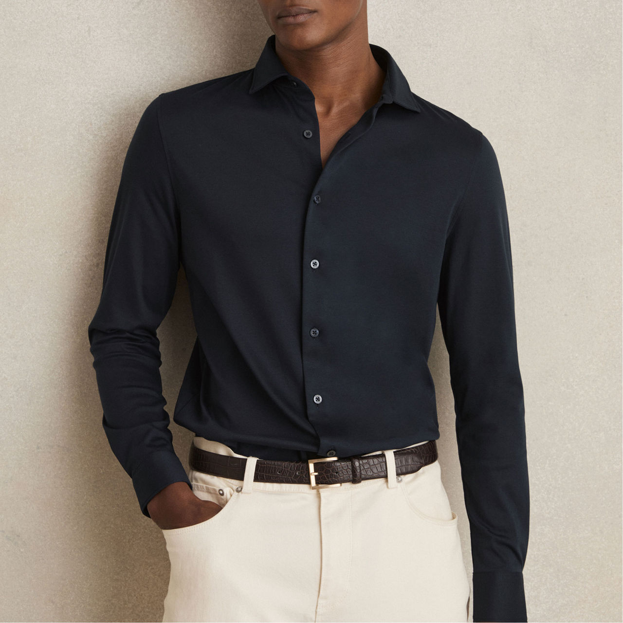 - Spread collar, button cuffs, French button placket, regular length, cutaway collar, full-length sleeves