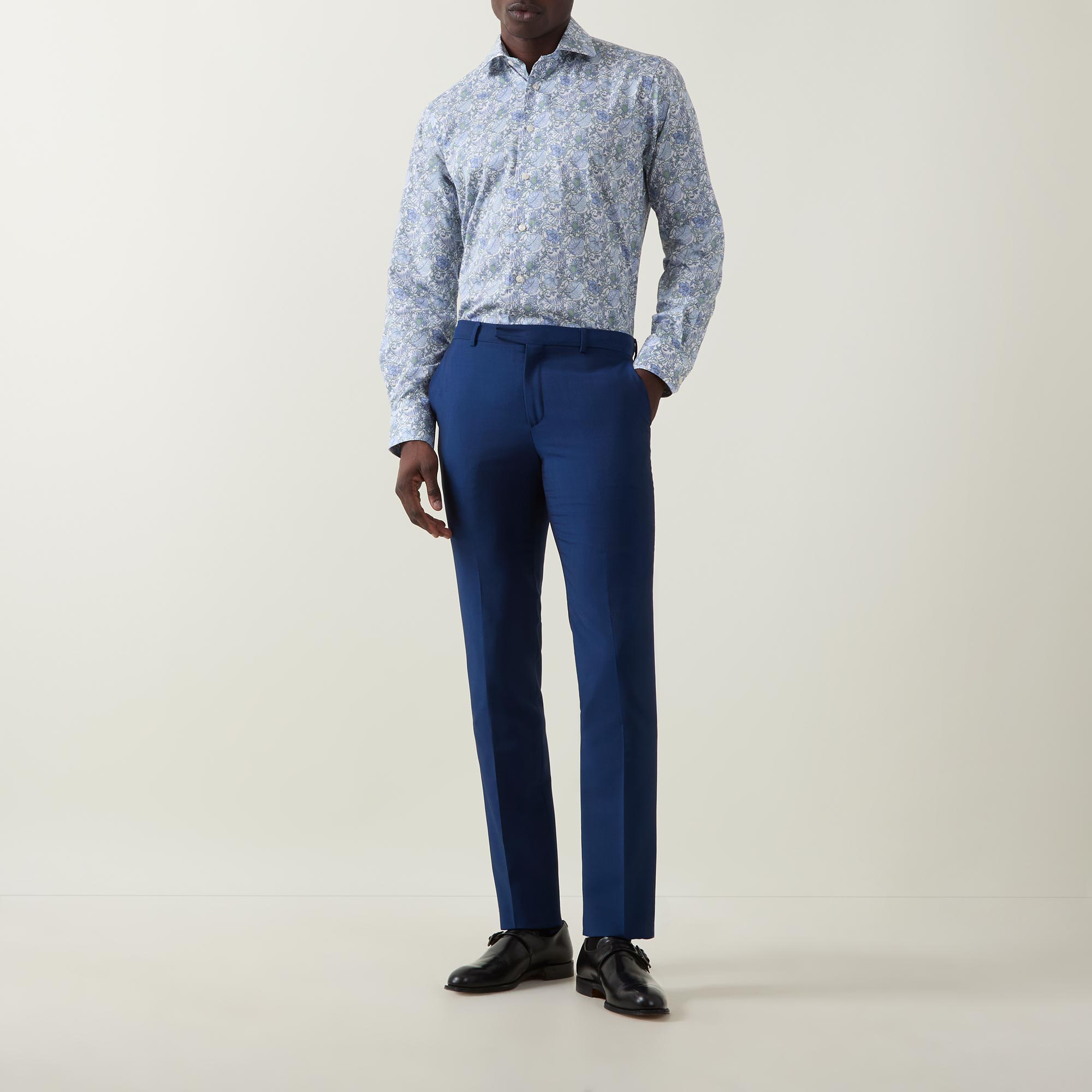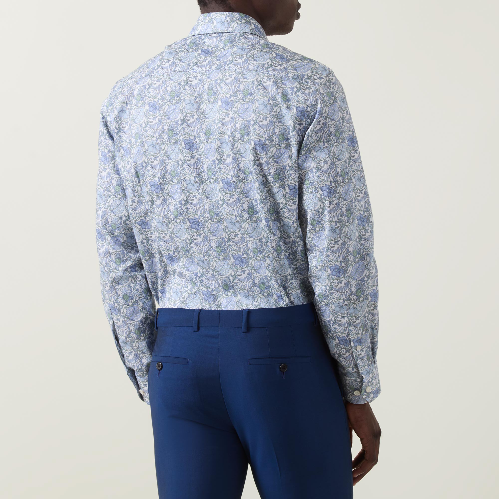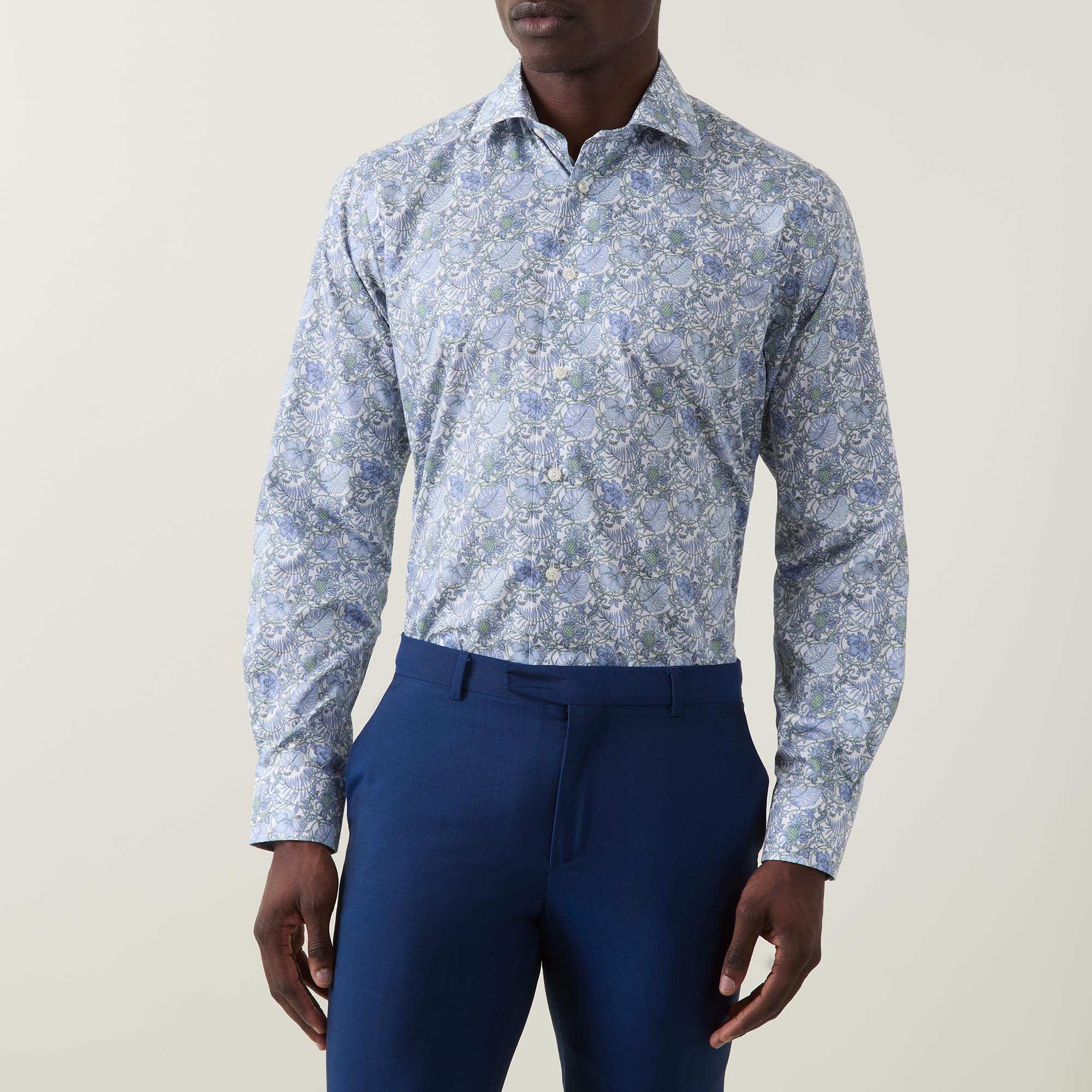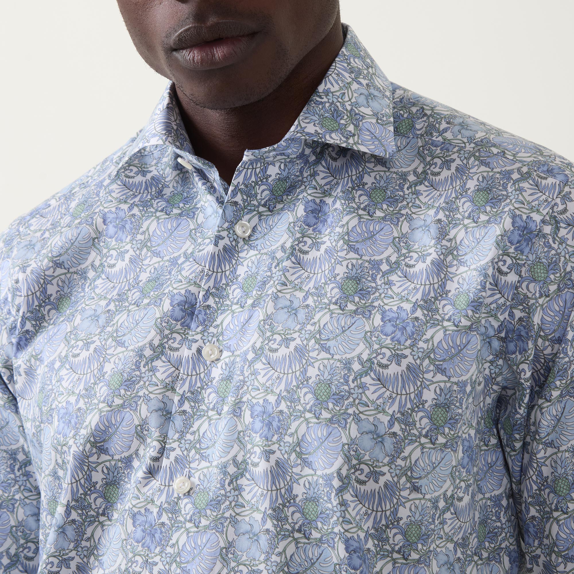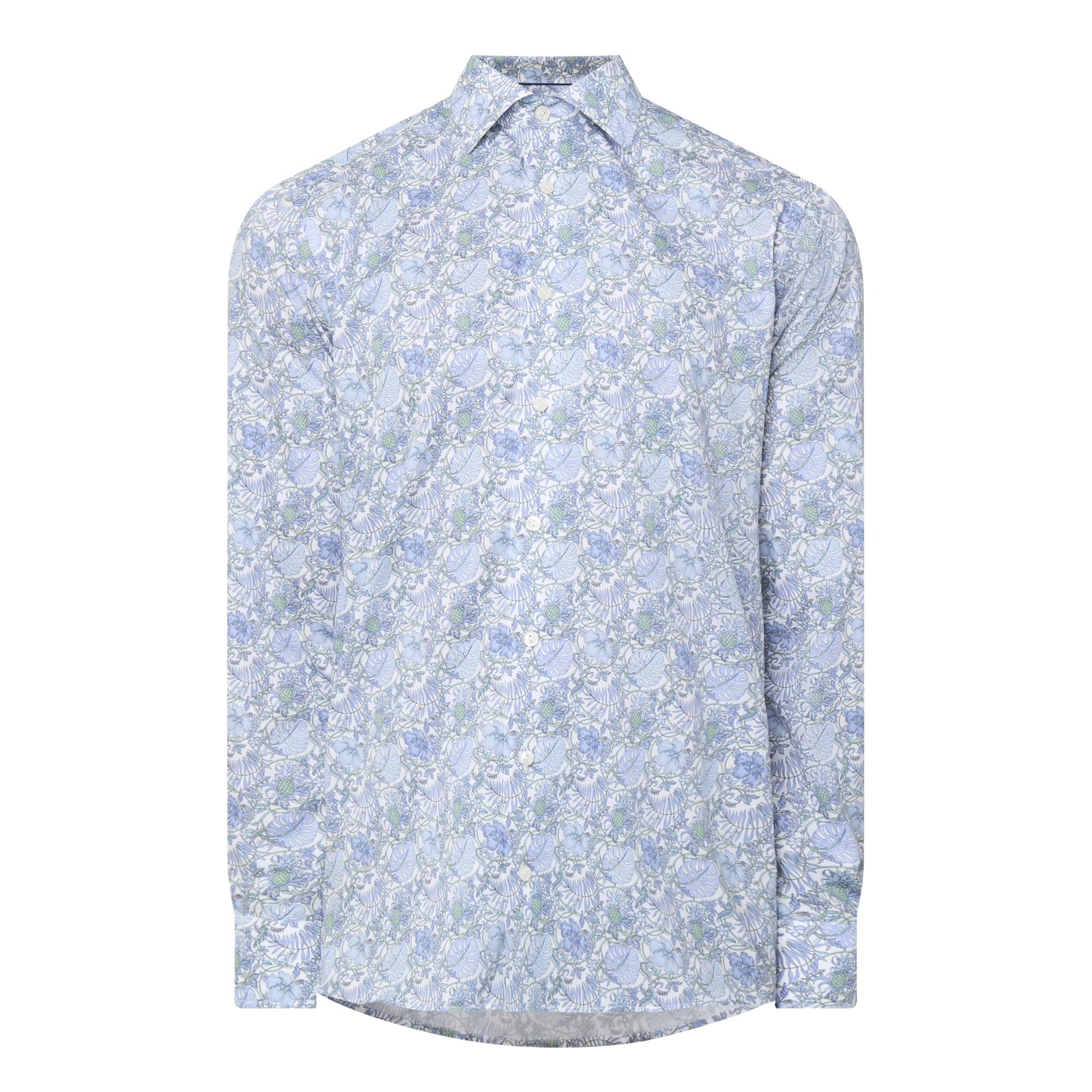 - Cut away collar, long sleeves, buttoned cuffs, front button placket, curved hem, tonal stitching, elegant floral pattern, twill finish