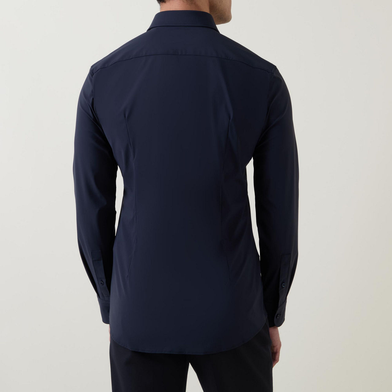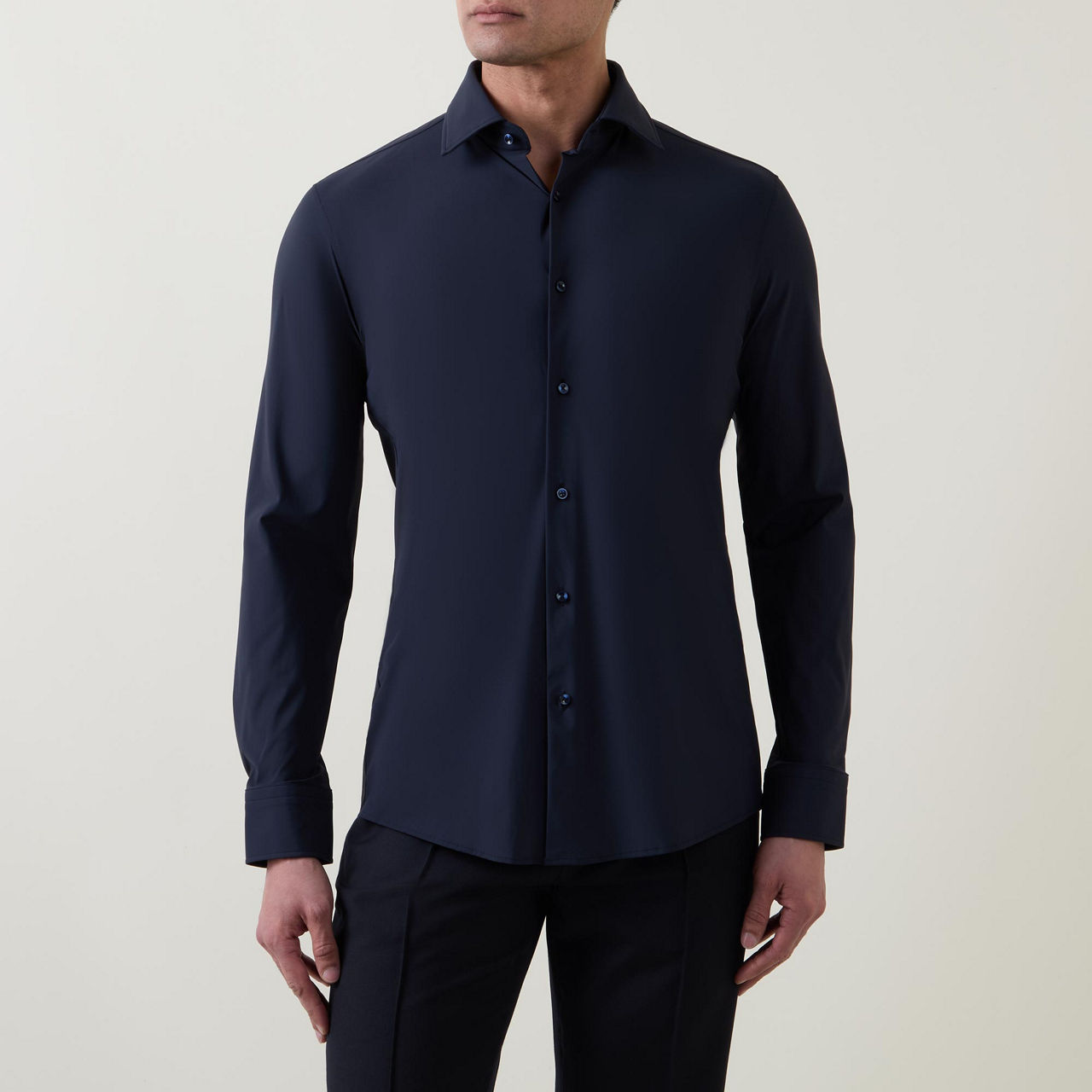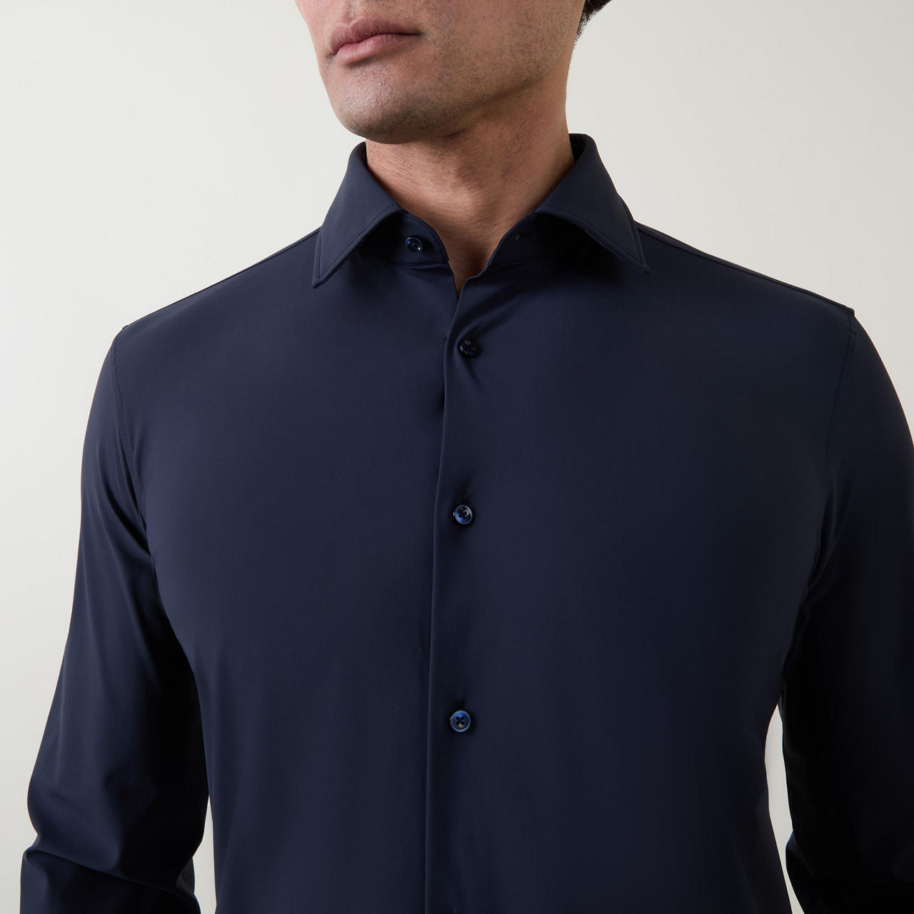 - Kent collar, long sleeves, round buttoned cuffs, front button fastening, curved hem, breathable, performance-stretch fabric