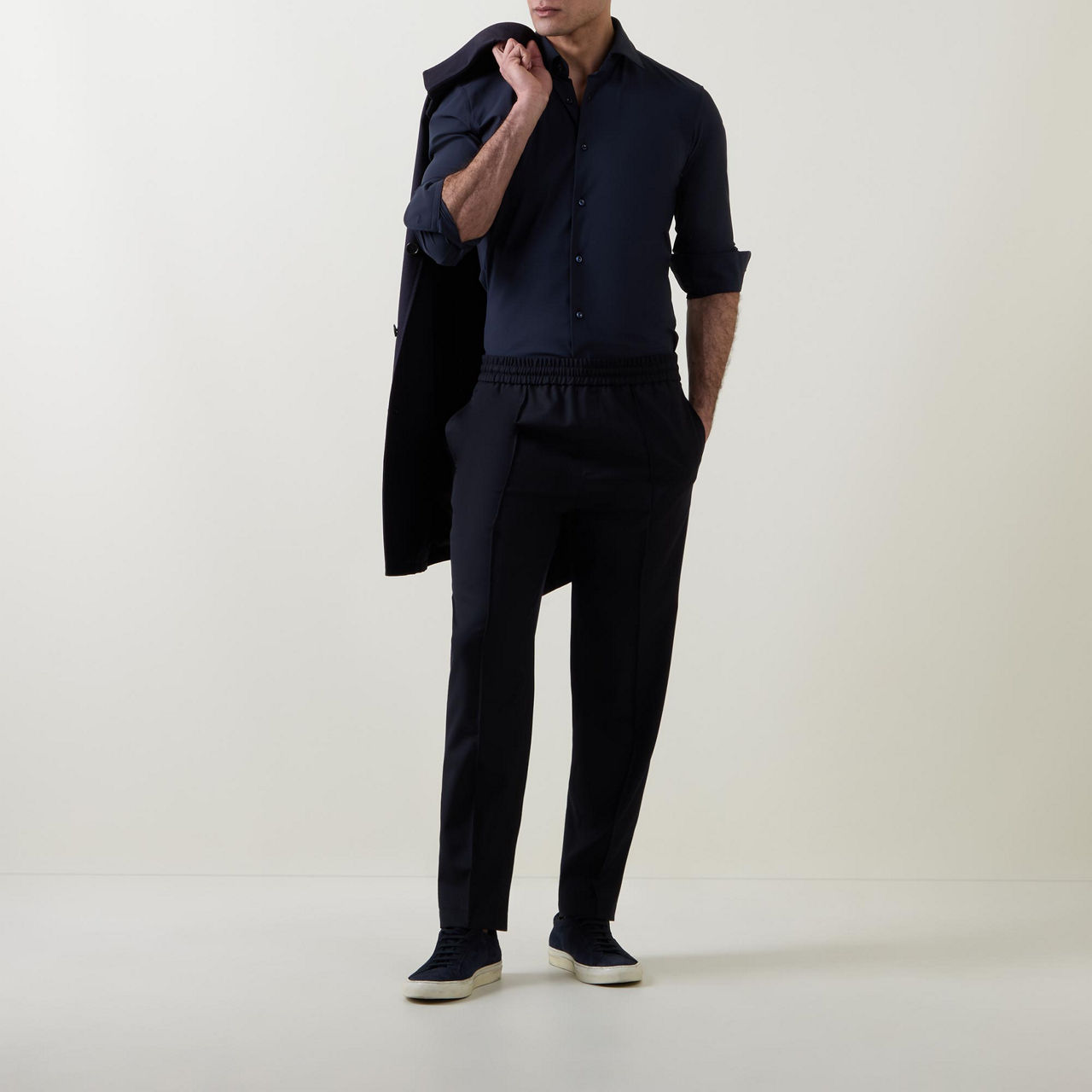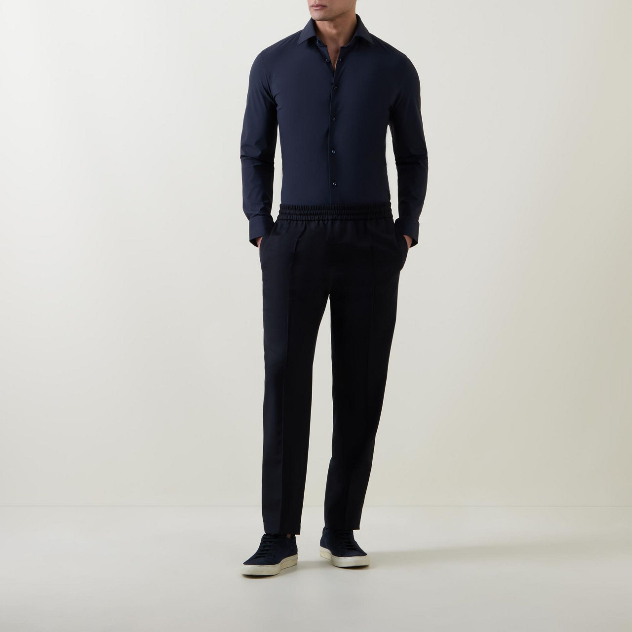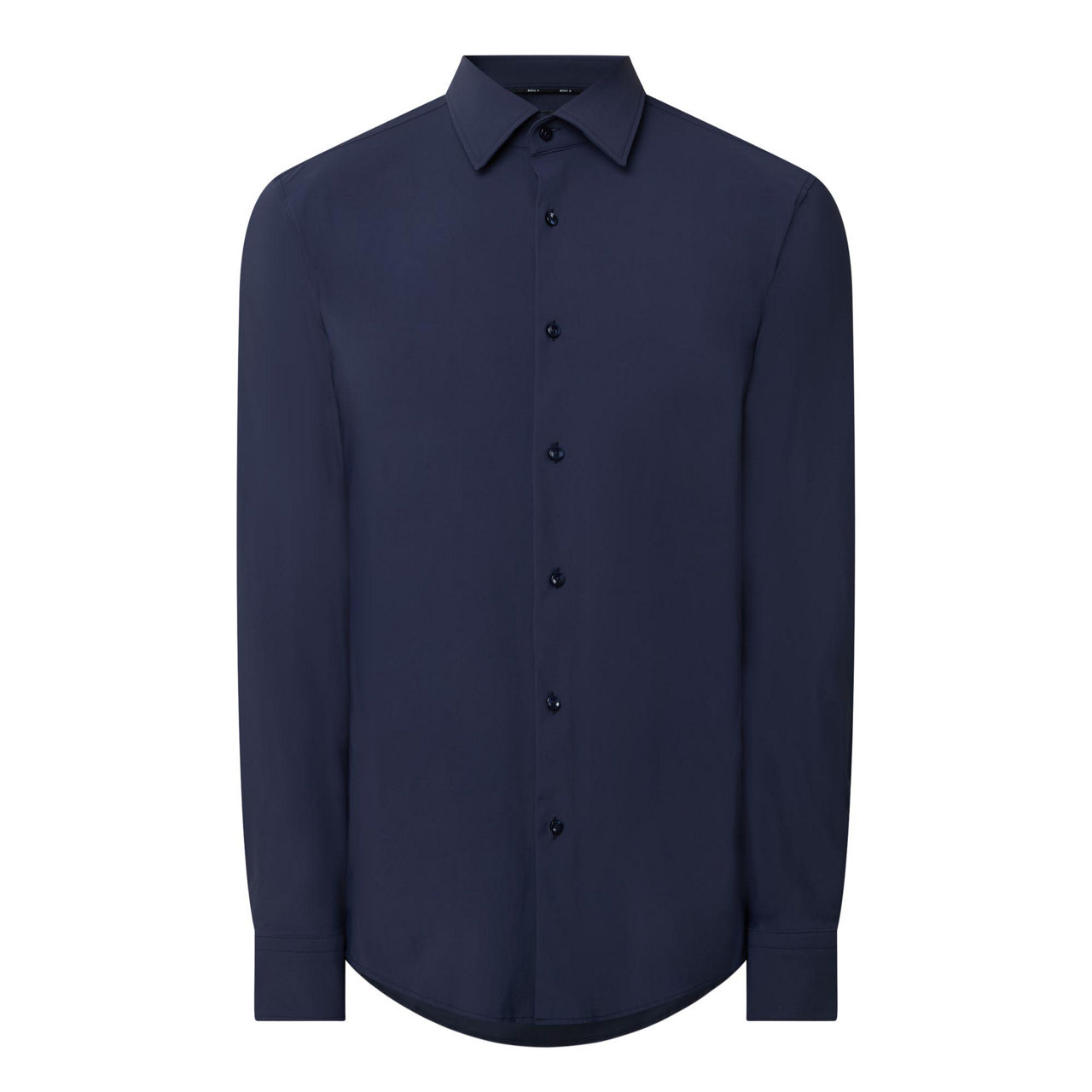 - Kent collar, long sleeves, round buttoned cuffs, front button fastening, curved hem, breathable, performance-stretch fabric