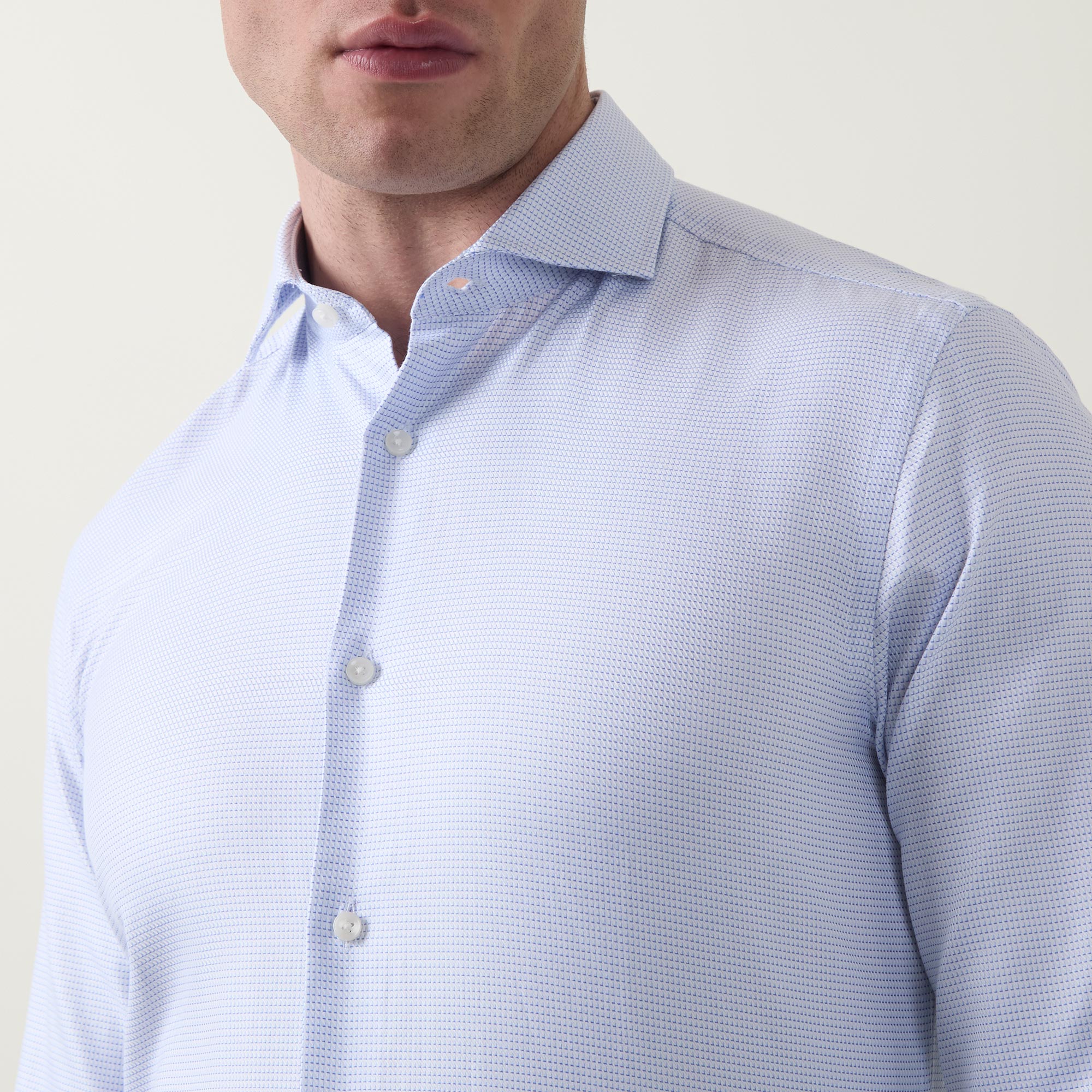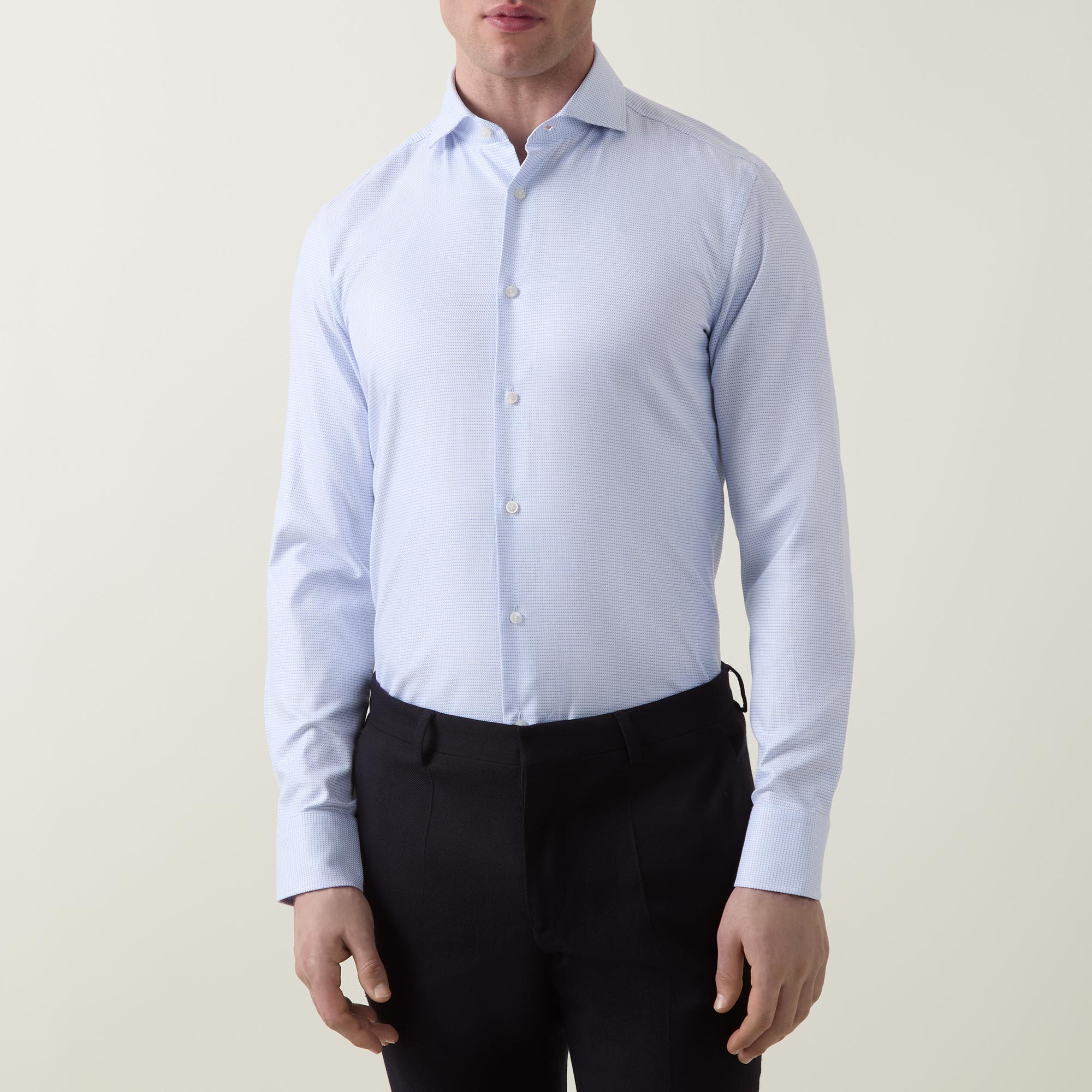 • Spread collar, long sleeves, buttoned cuffs, front button fastening, curved hem, tonal stitching, twill construction