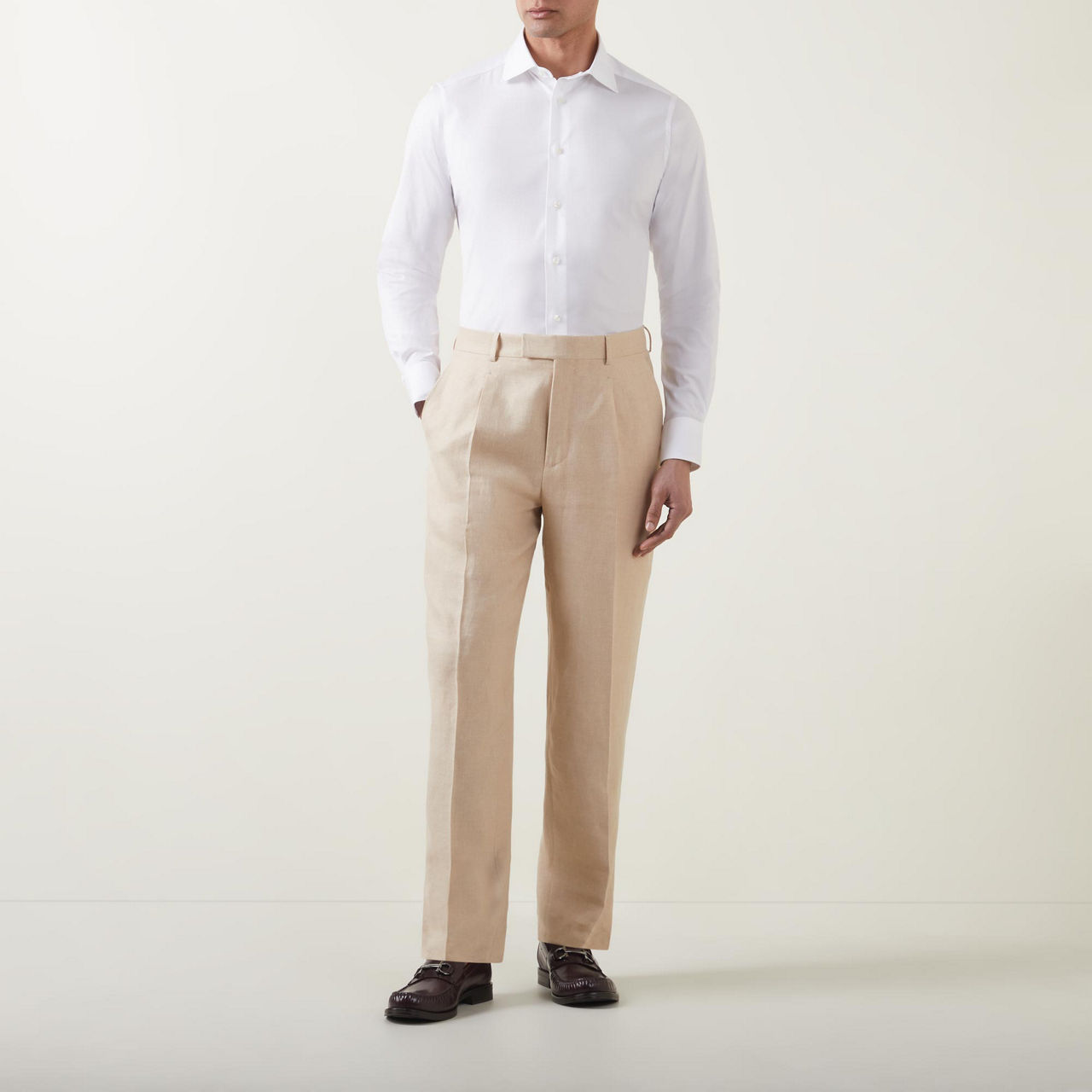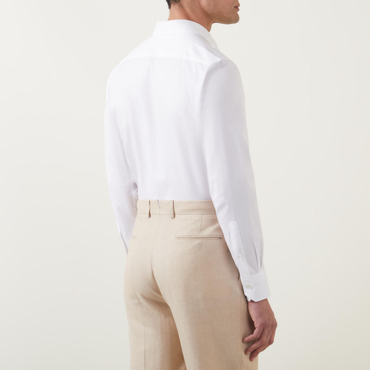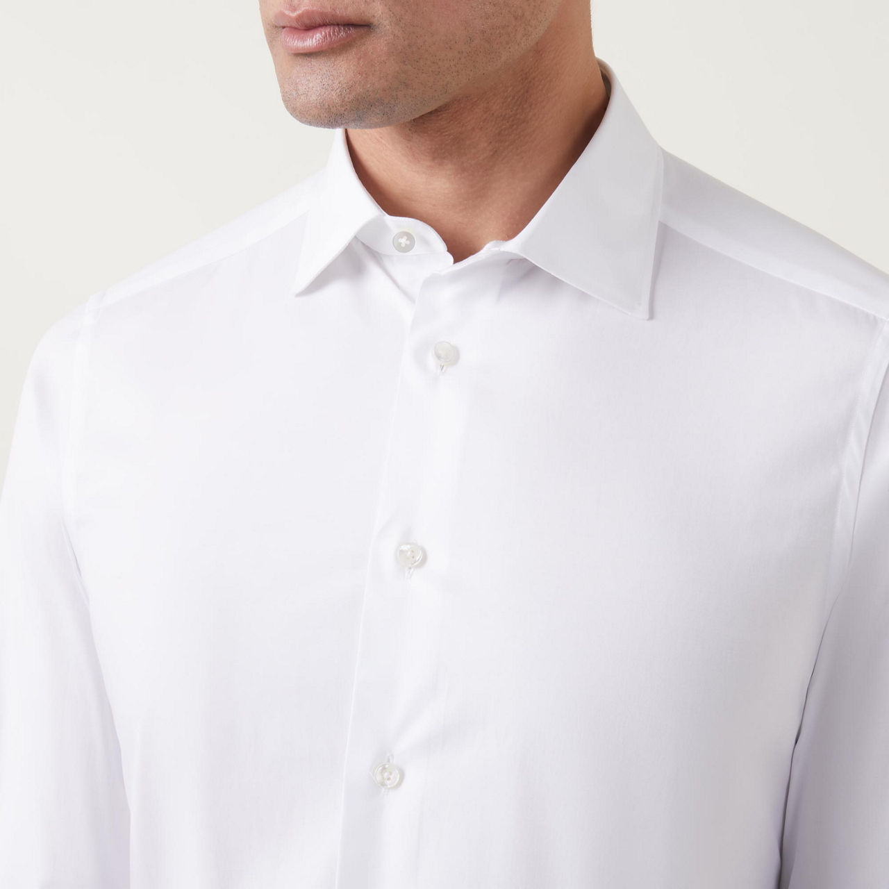 - Pointed collar, long sleeves, button placket, single-button cuffs, tonal stitching, straight hemline, smooth fabric
