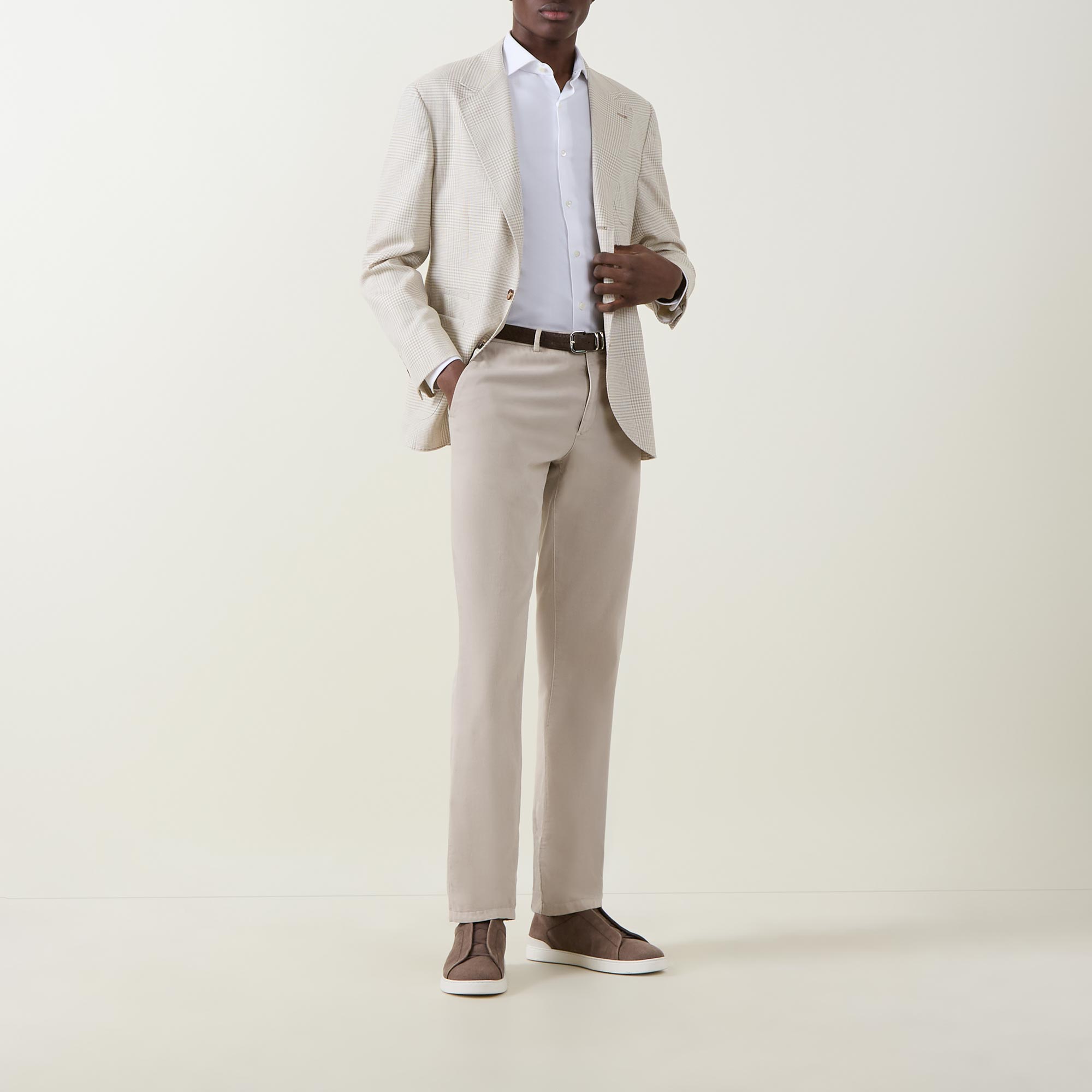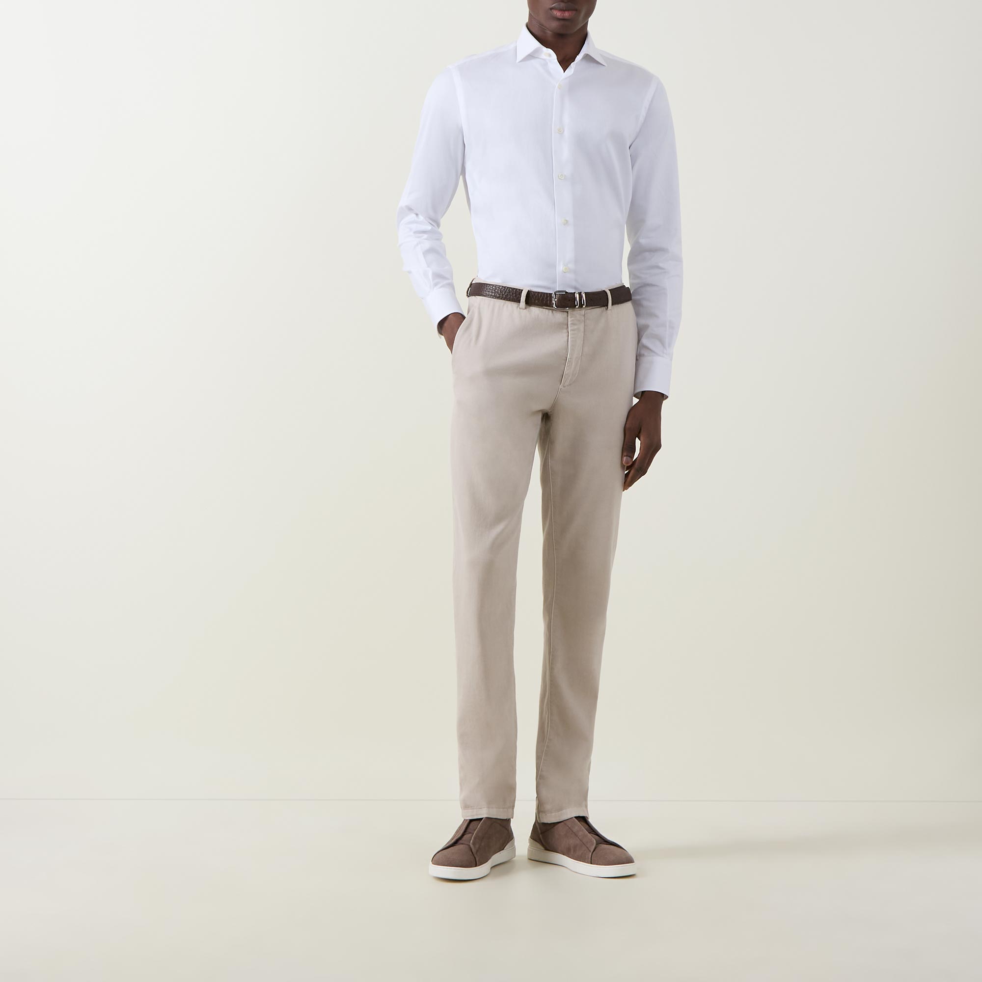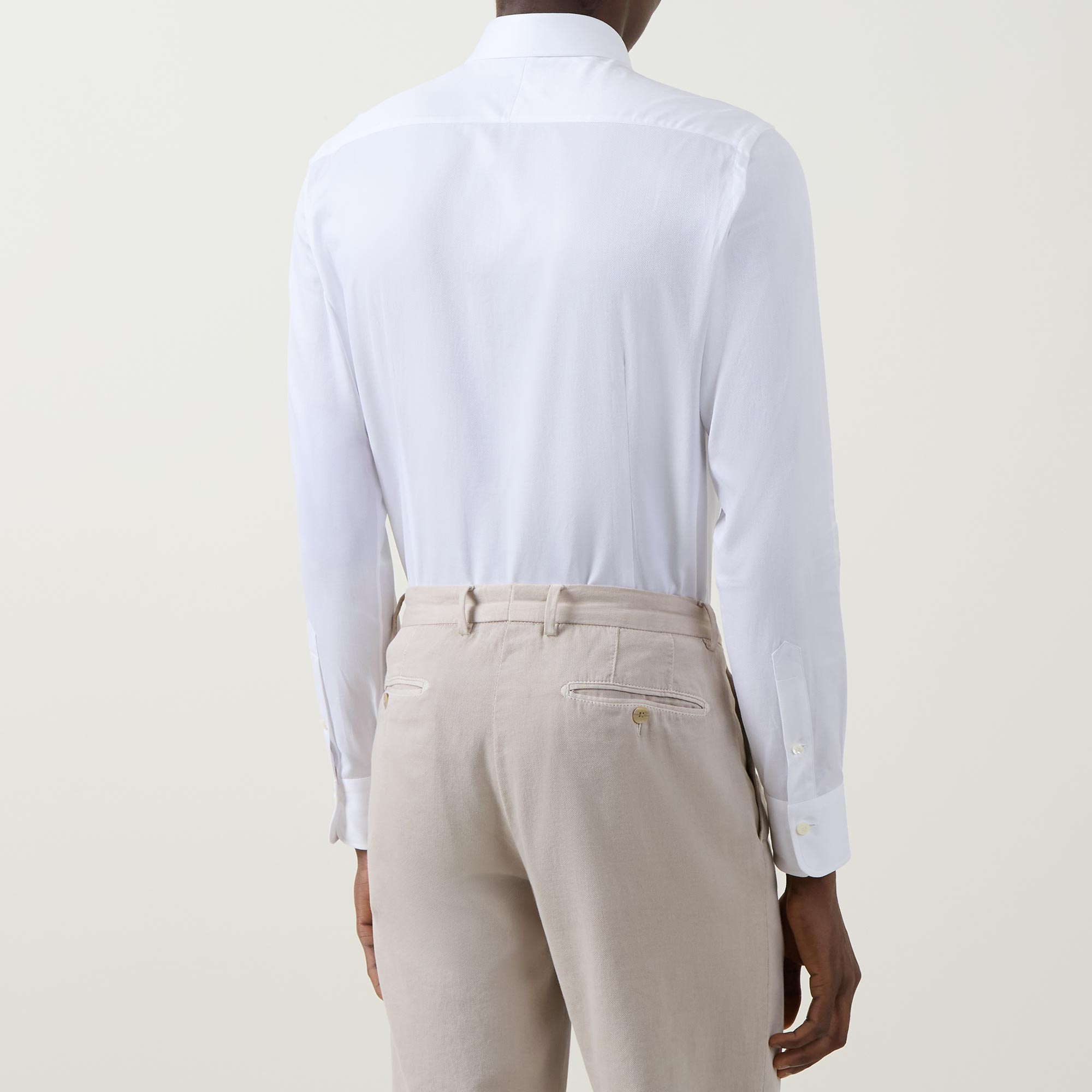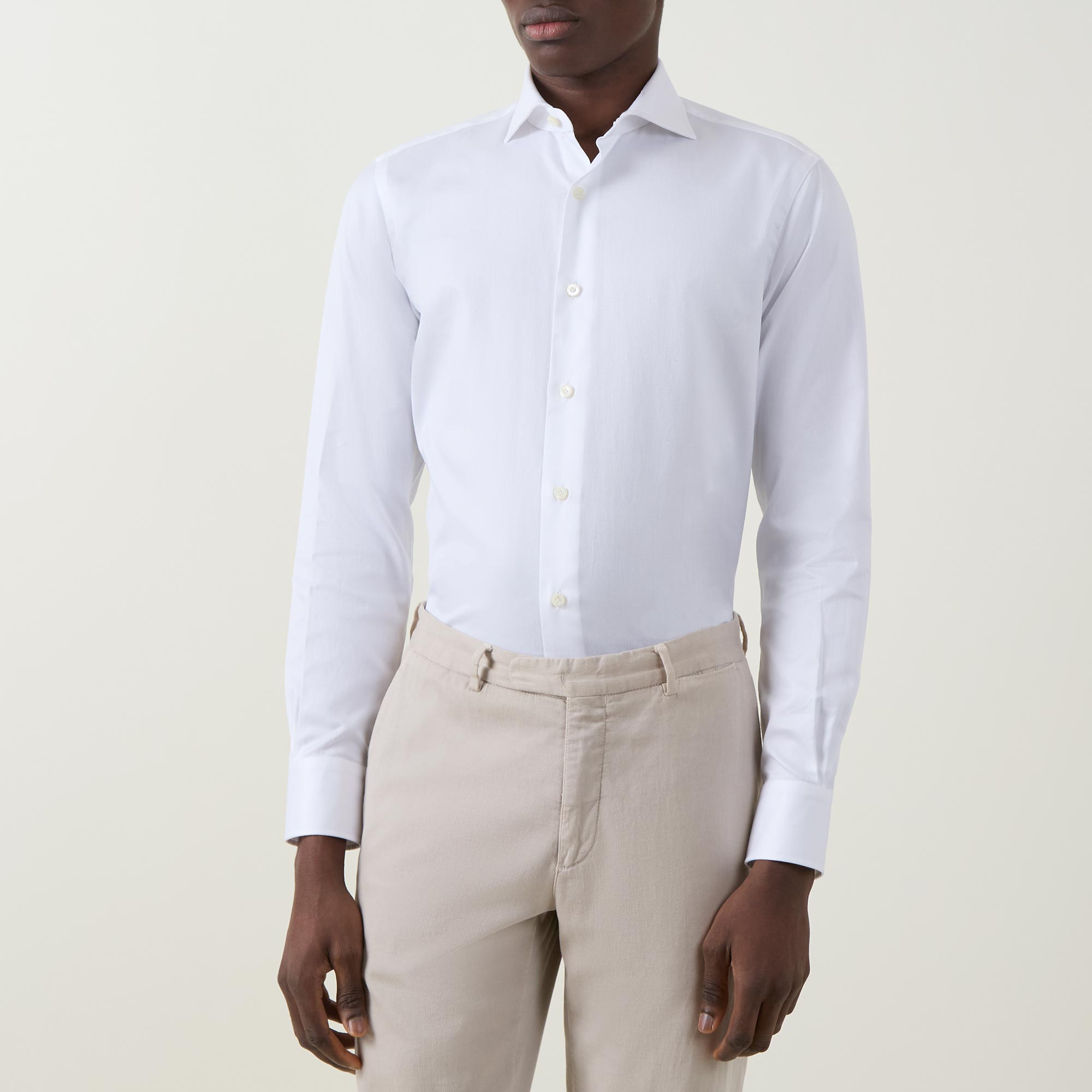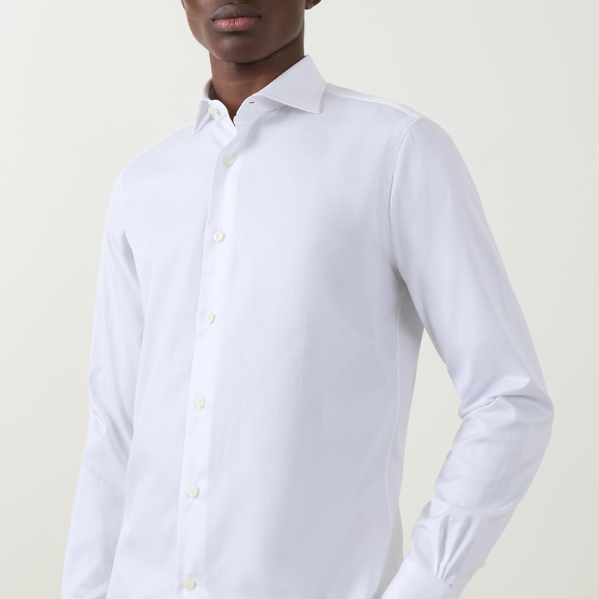 - Cut-away collar, long sleeves, single-cuff, curved hemline, dobby fabric