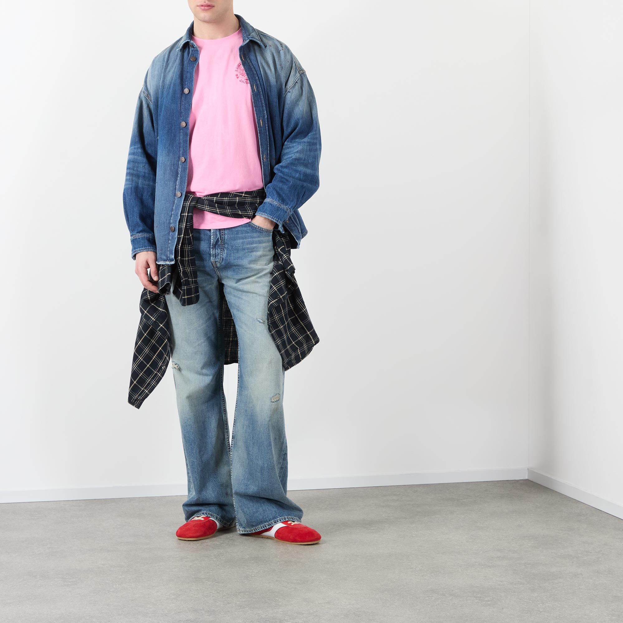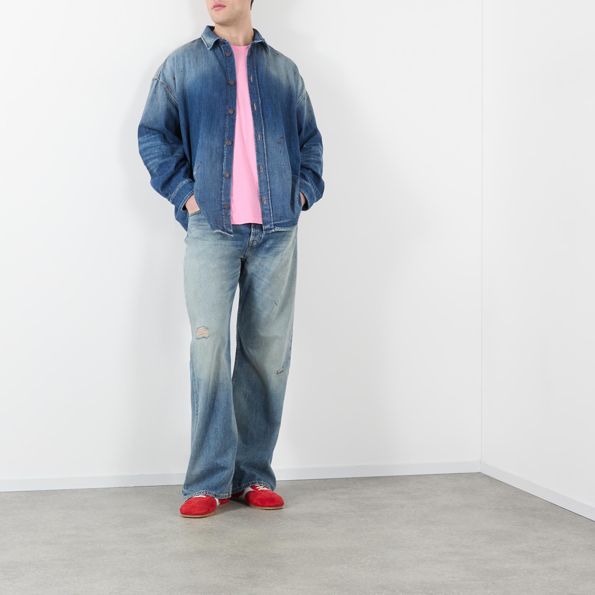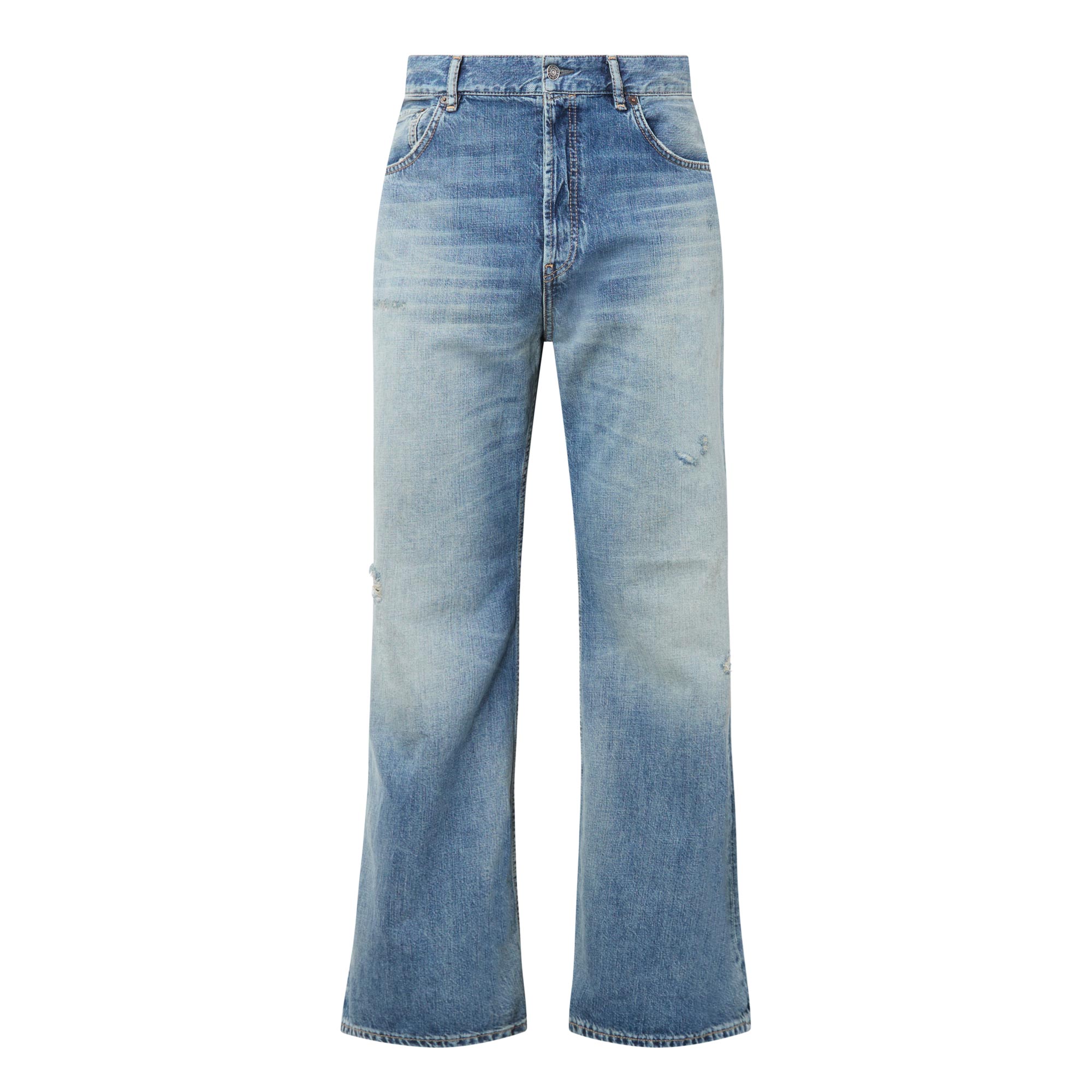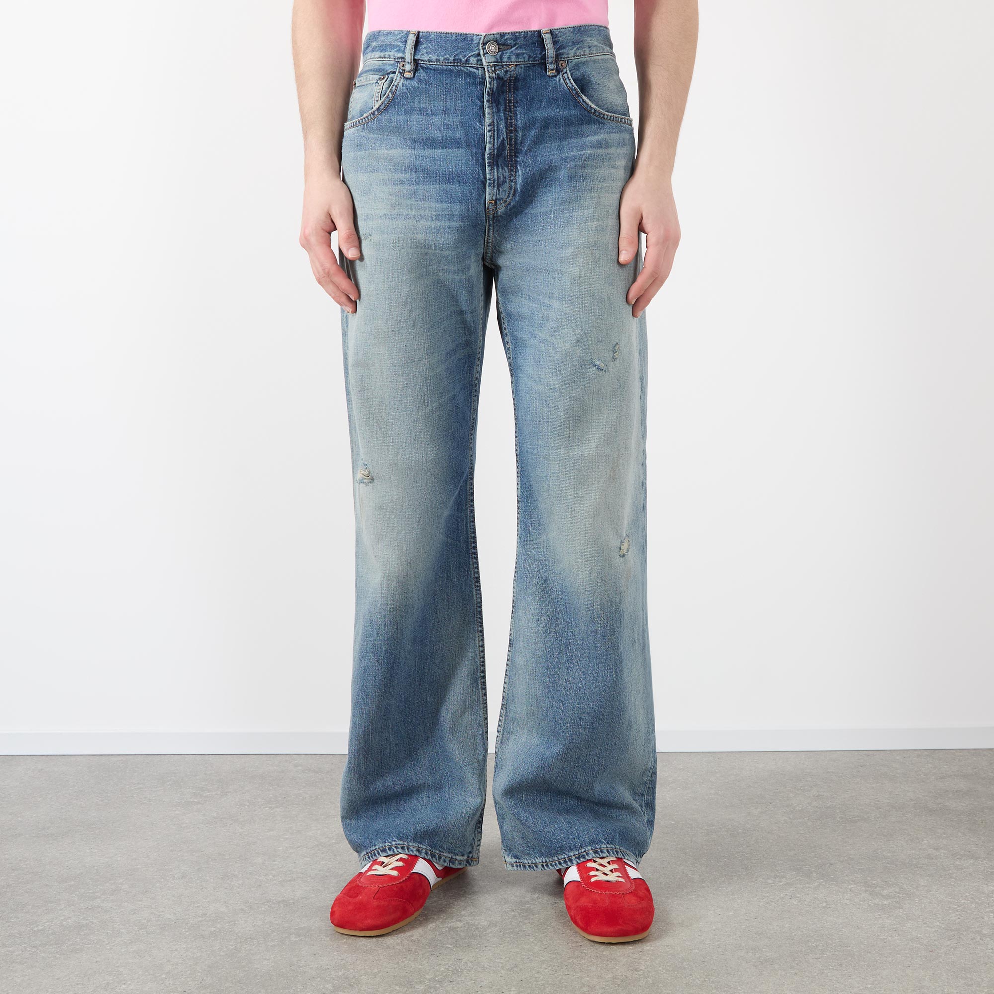 - Button and fly zip fastening, belt loops, five-pocket style, hand distressing, logo badge, whiskering and faded details