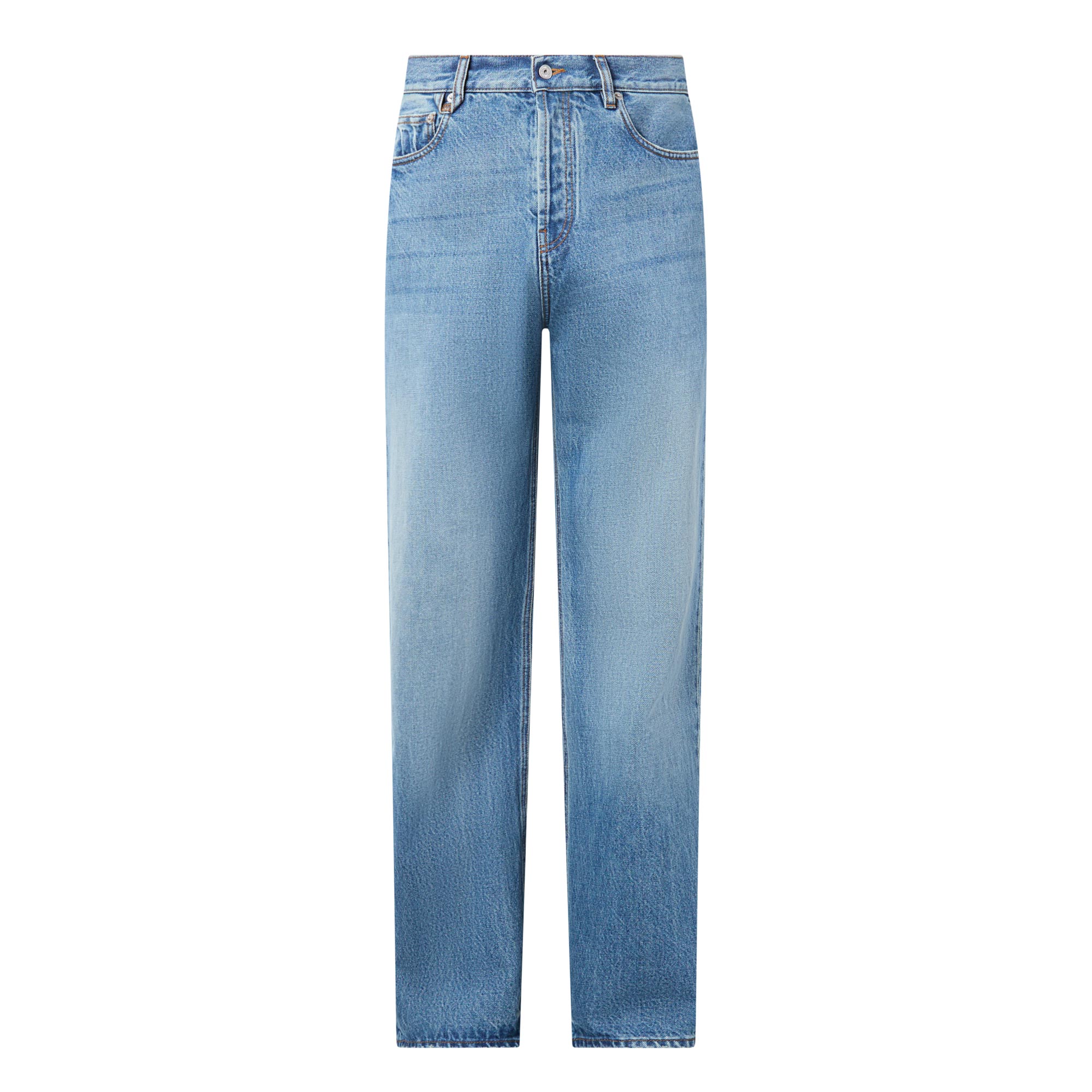 - Button and fly zip fastening, belt loops, five-pocket style, monogram belt loops, rivet embellishment, logo badge at rear, faded and whispering finish, branding details