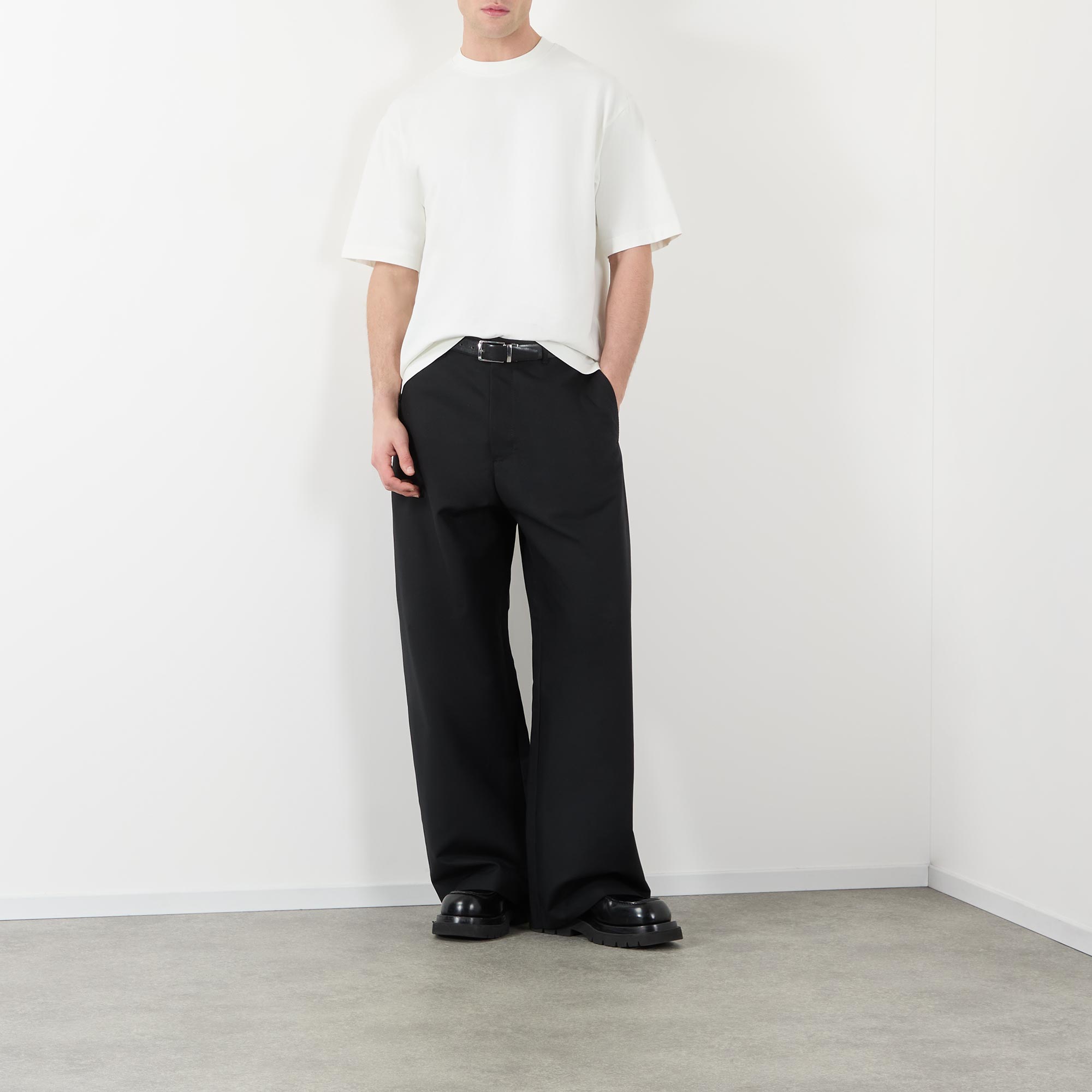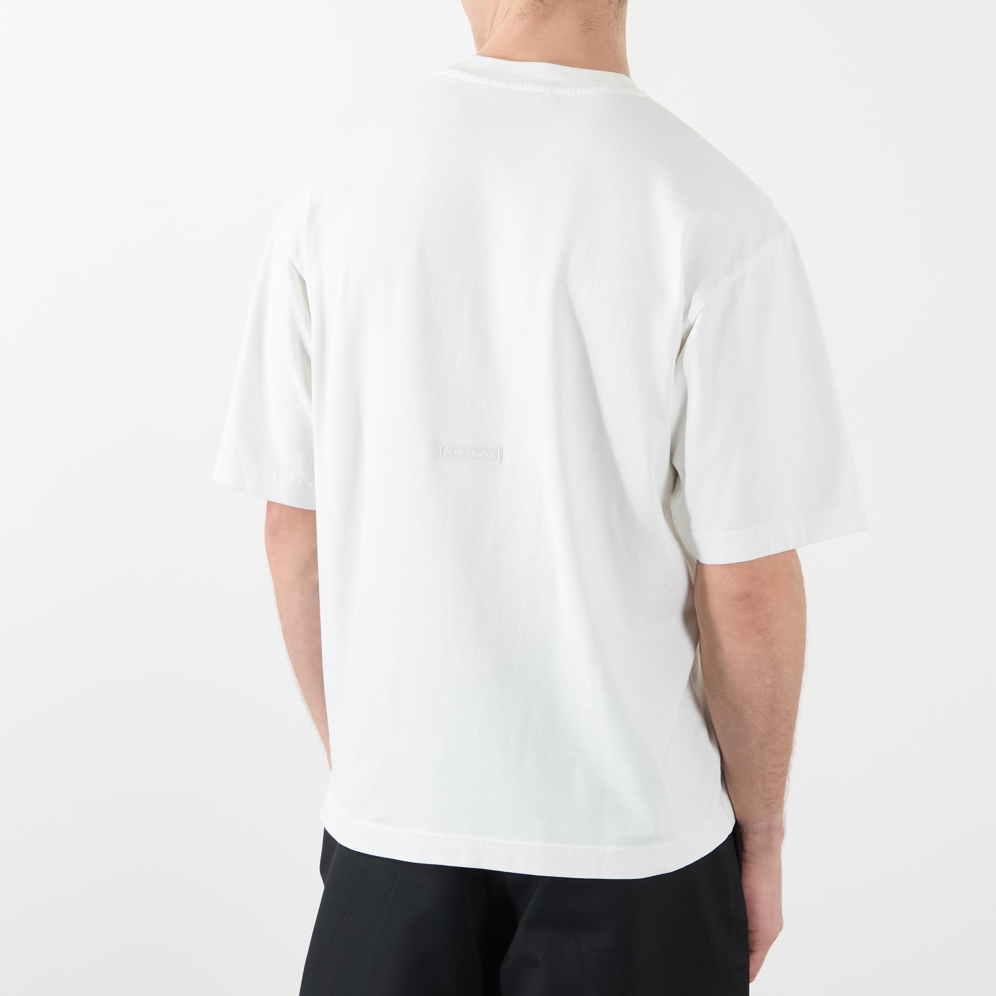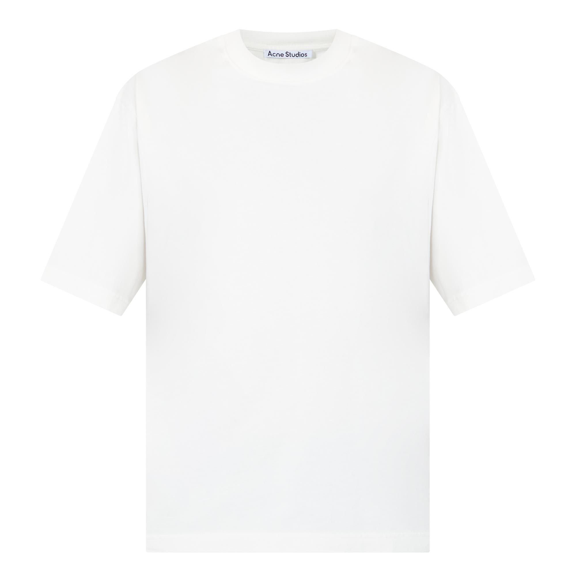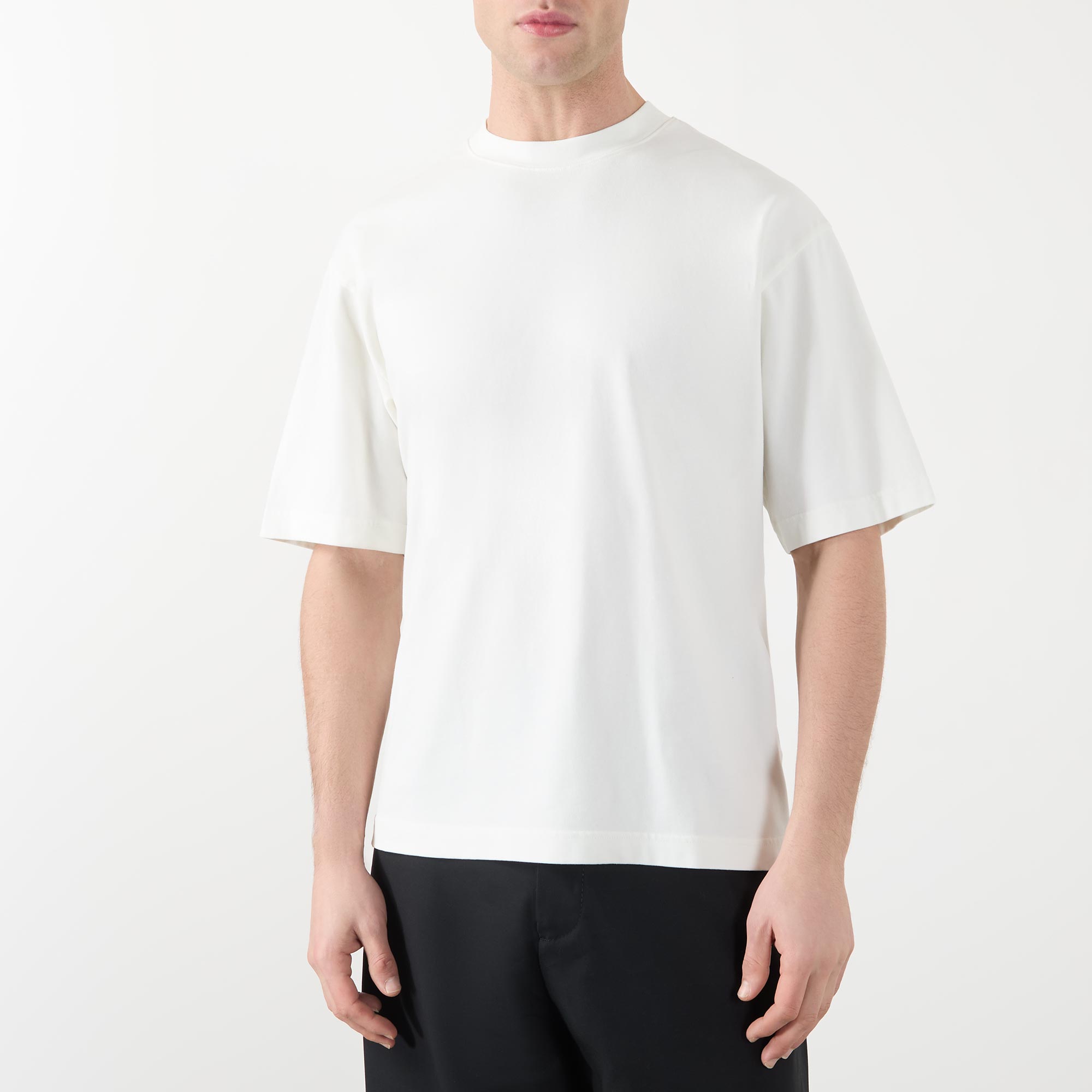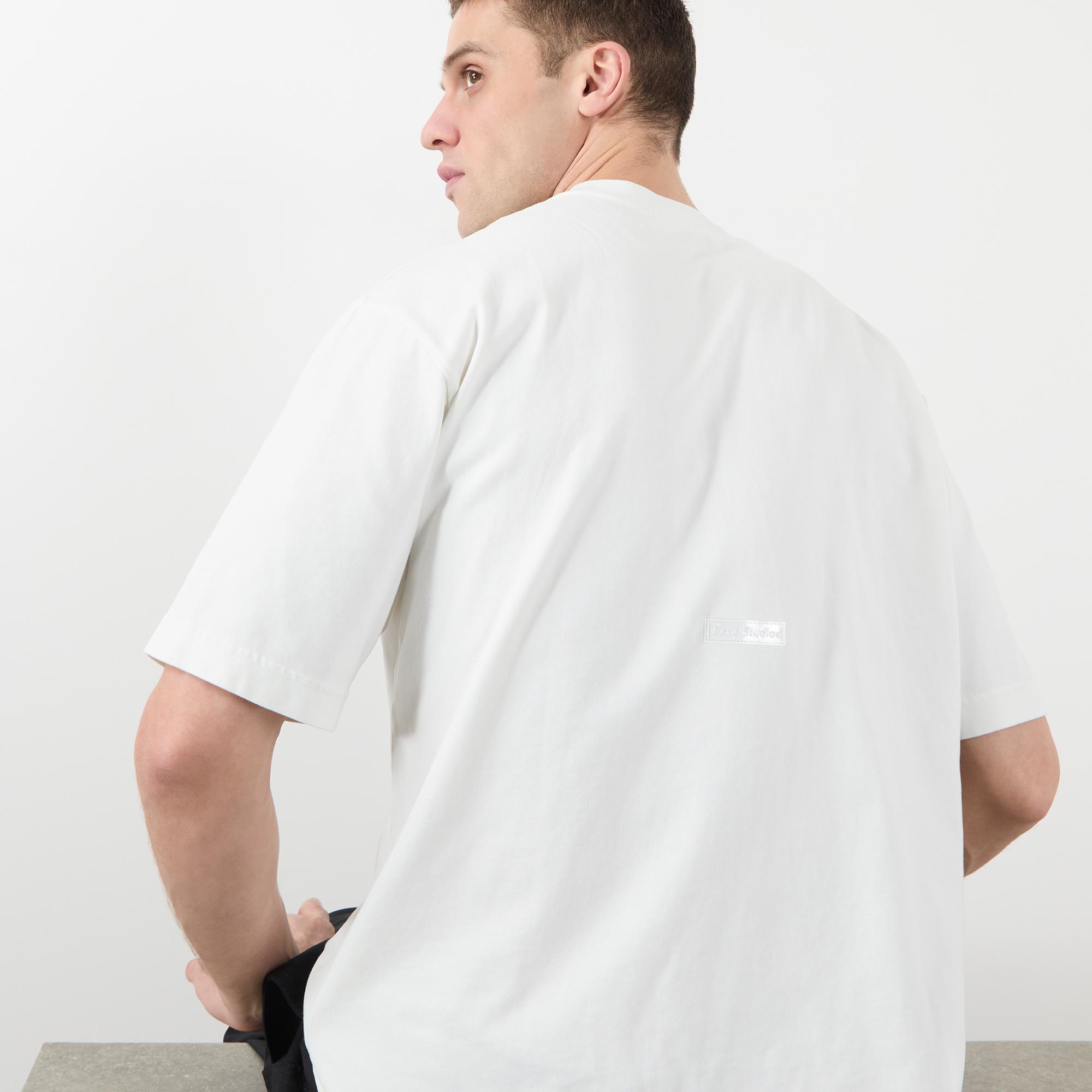 - Short sleeves, crew neckline, dropped shoulders, rear logo branding, tonal stitching, straight hemline, smooth fabric