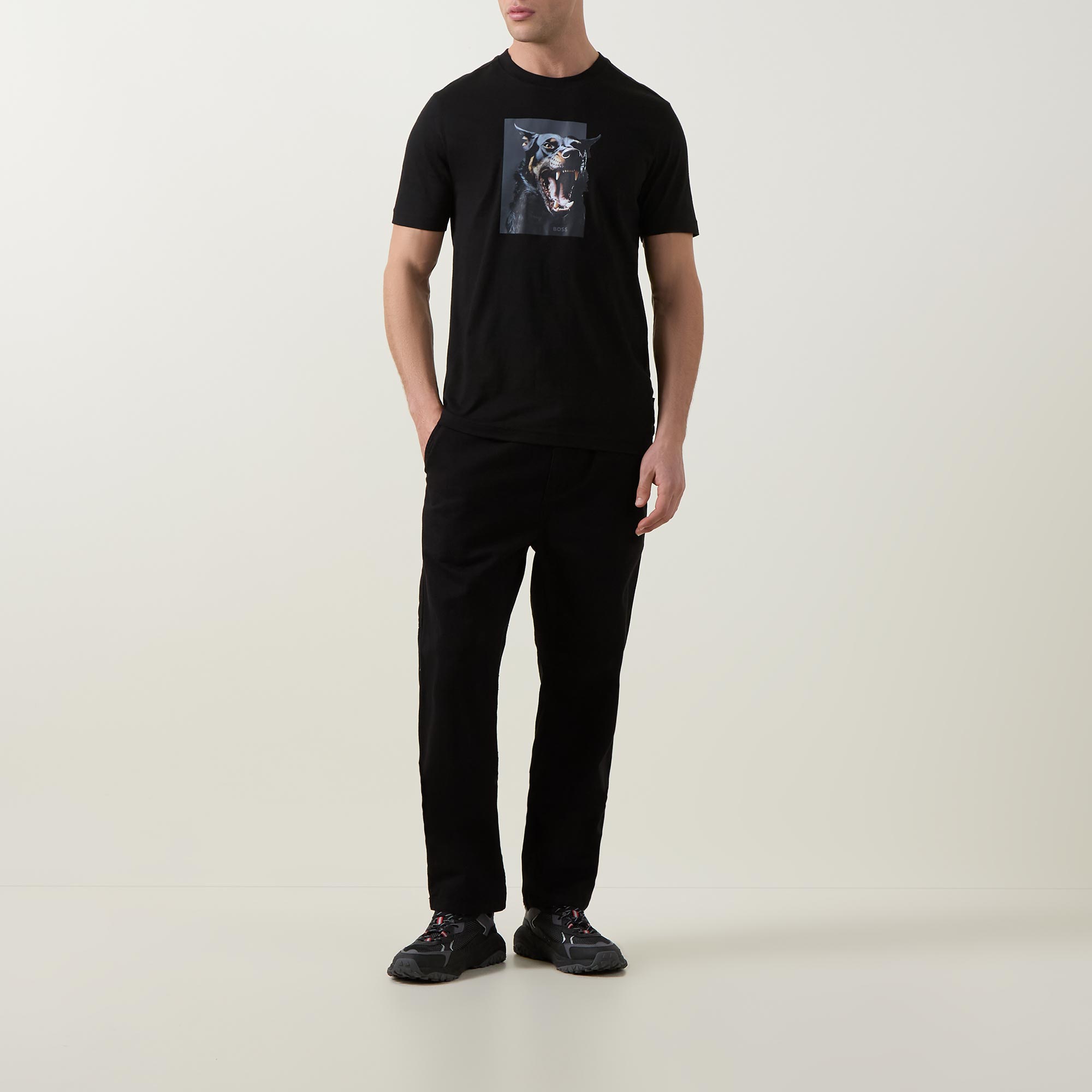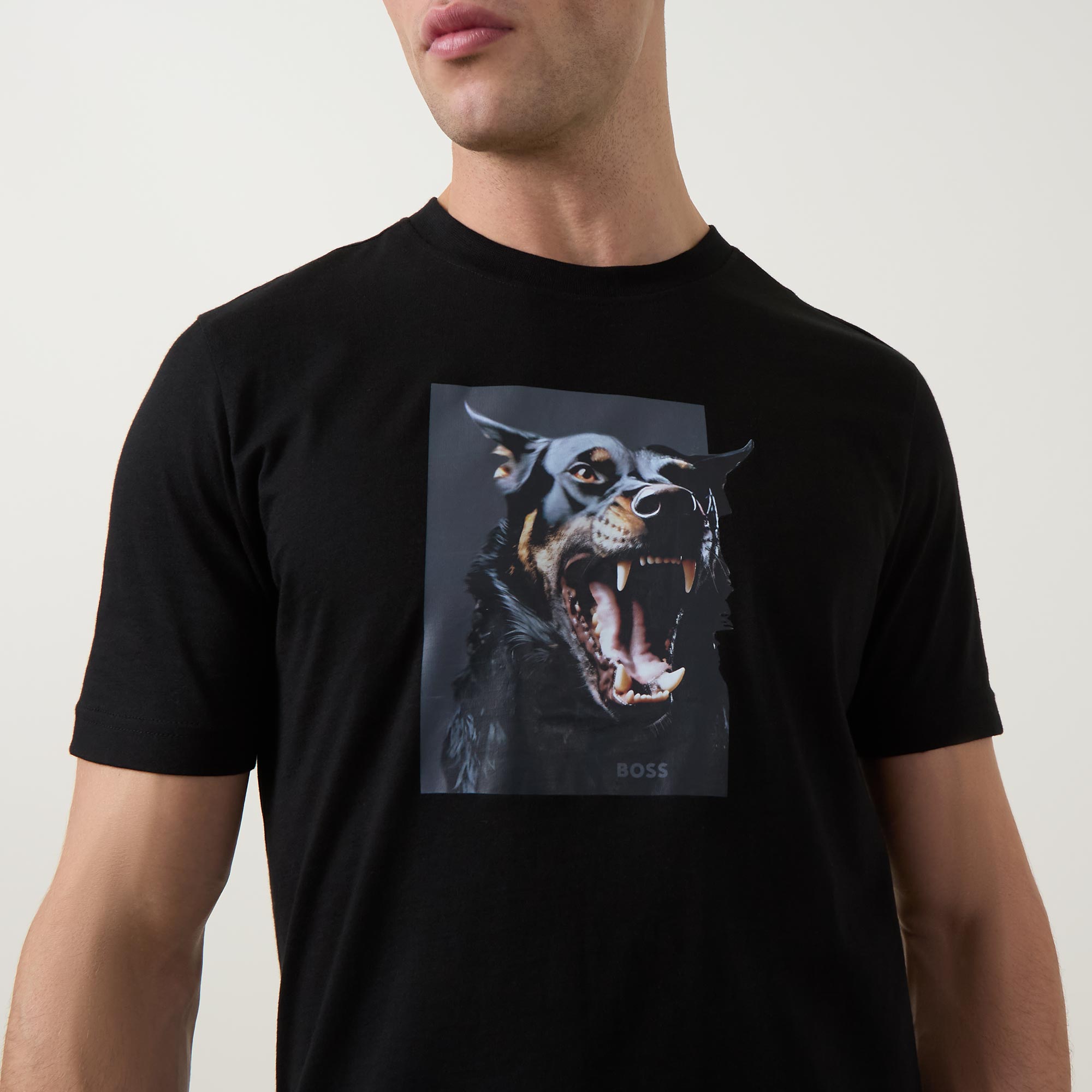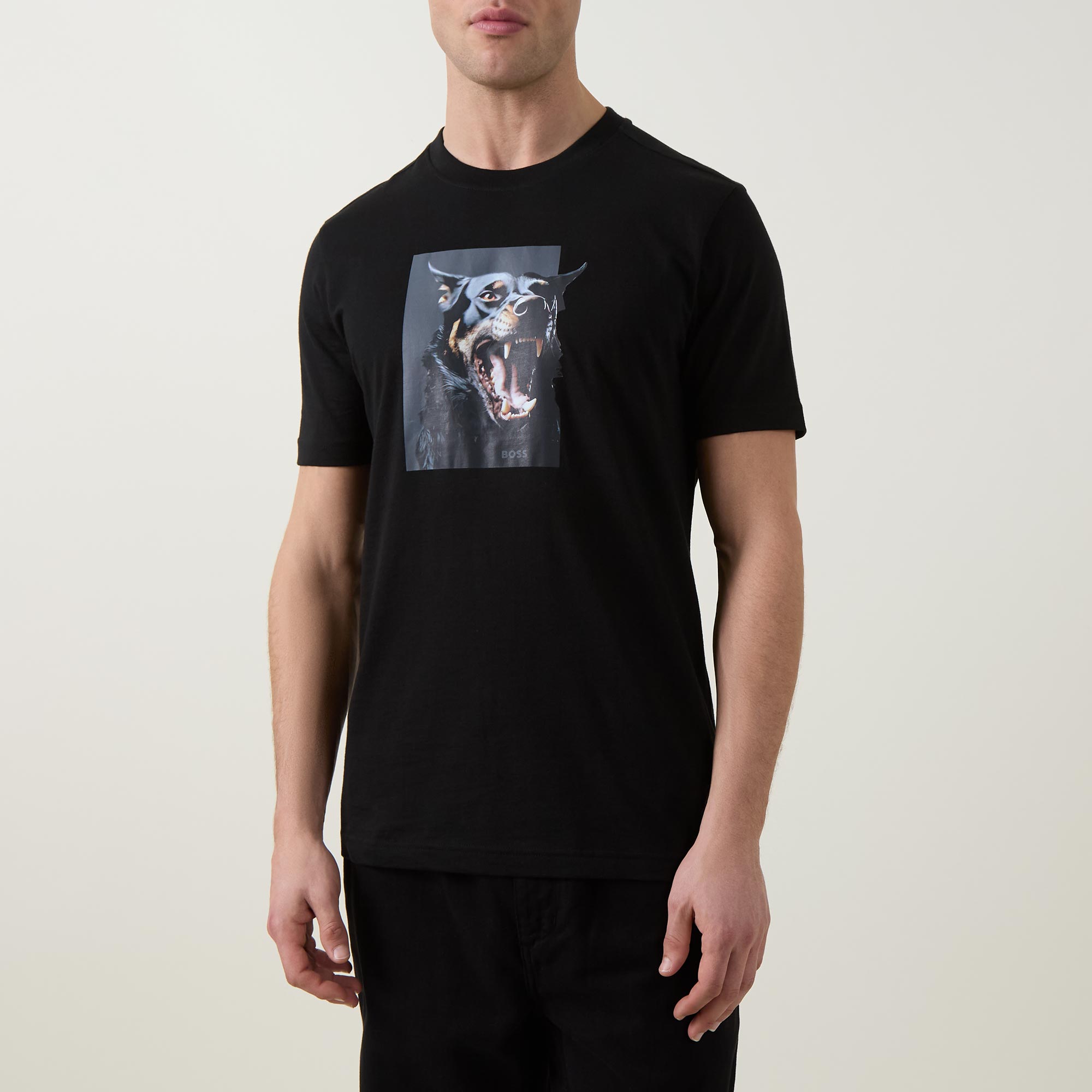 - Round neckline, short sleeves, straight hemline, logo details, dobermann print, breathable jersey fabric