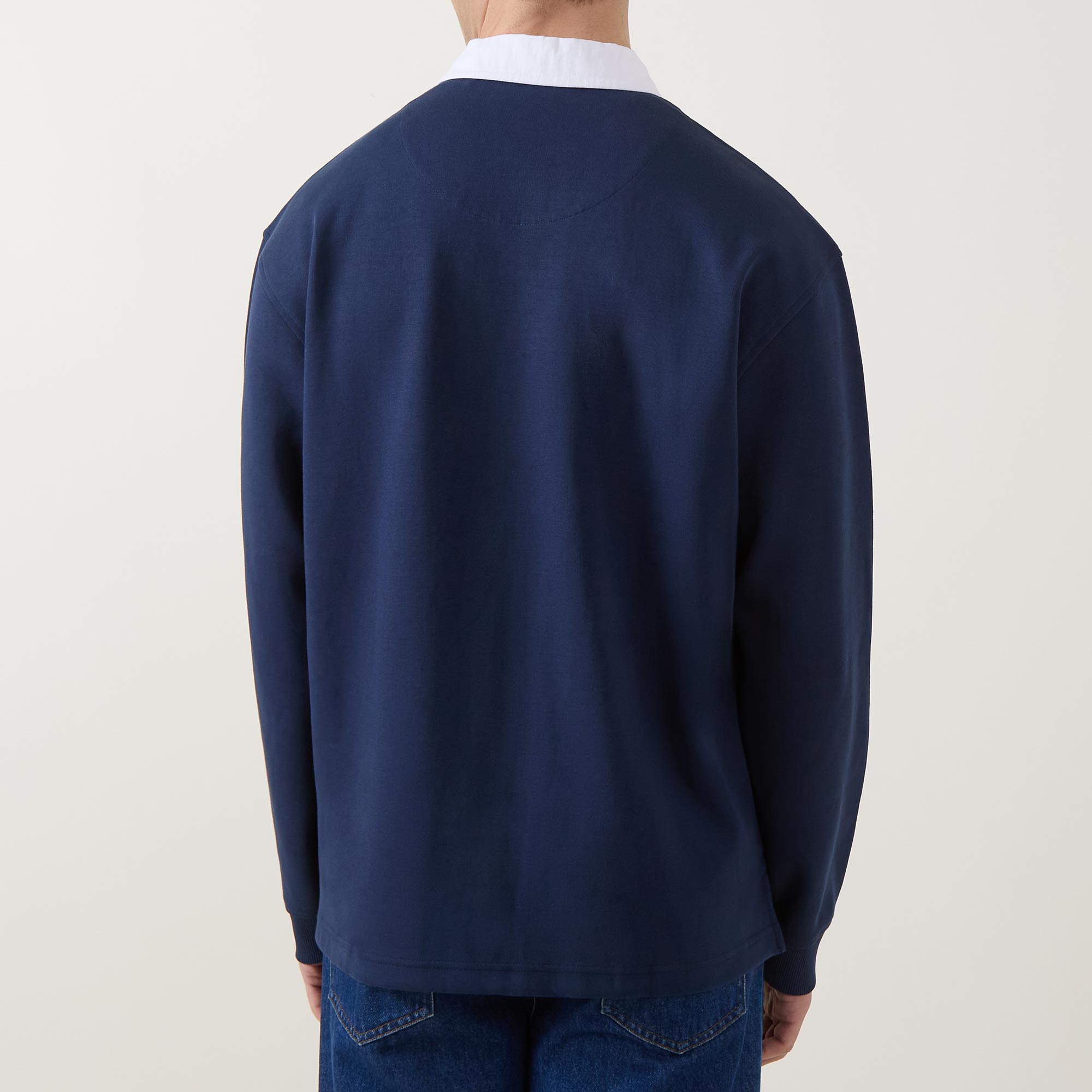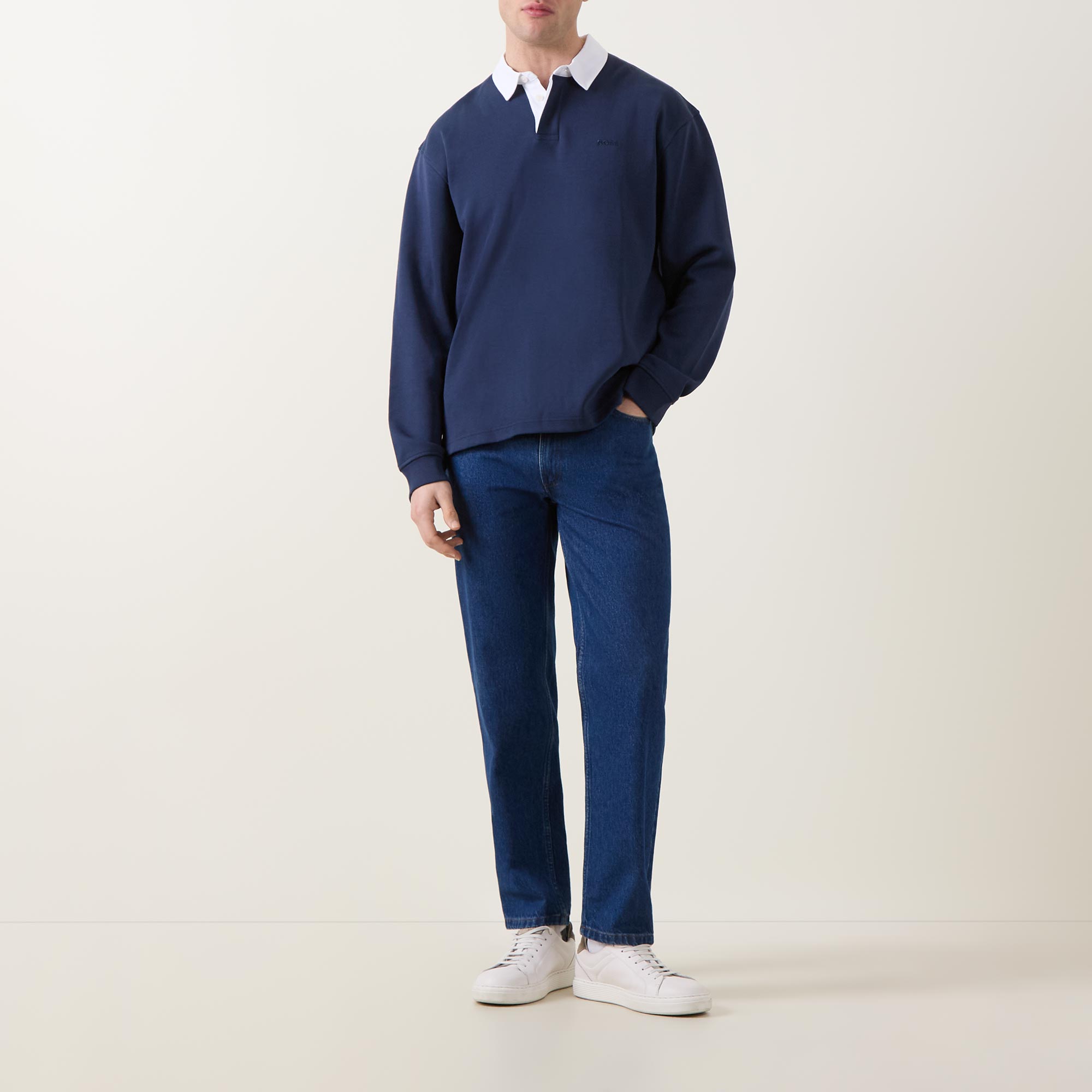 • Contrasting point collar, long sleeves, dropped shoulders, concealed button placket, tonal logo detail on chest, straight hemline, stretch cuffs, smooth fabric