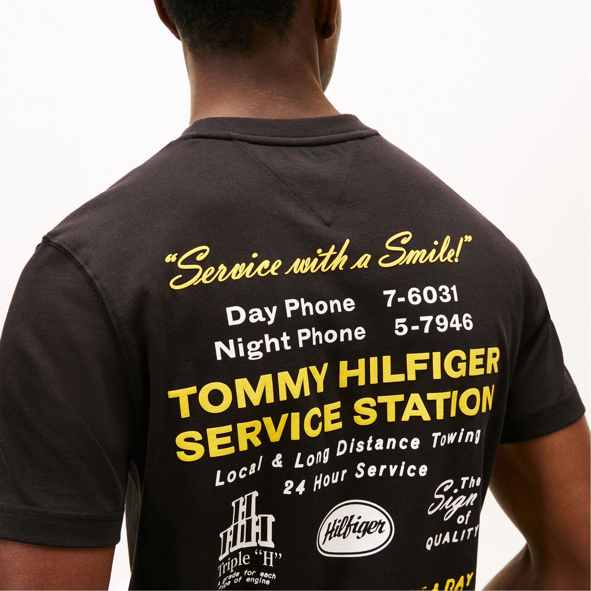- Crew neck, signature tape inside neckline, service station graphic on back, script logo on chest, logo detail