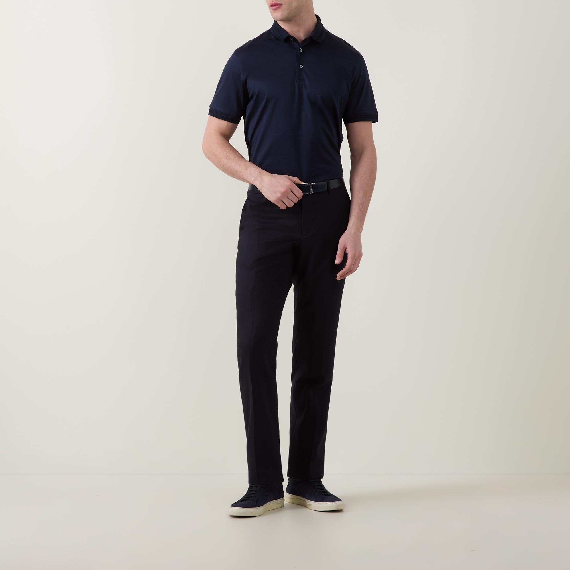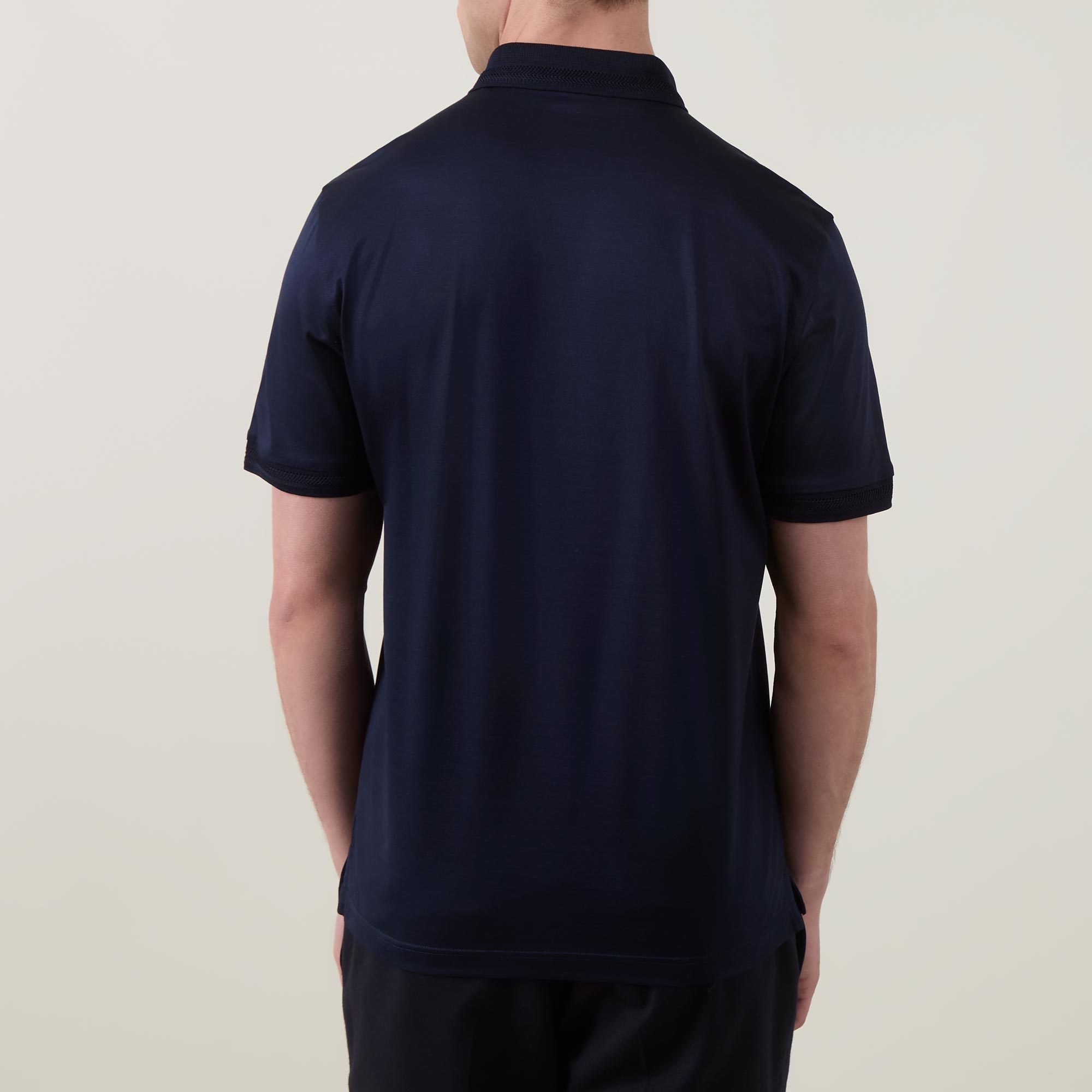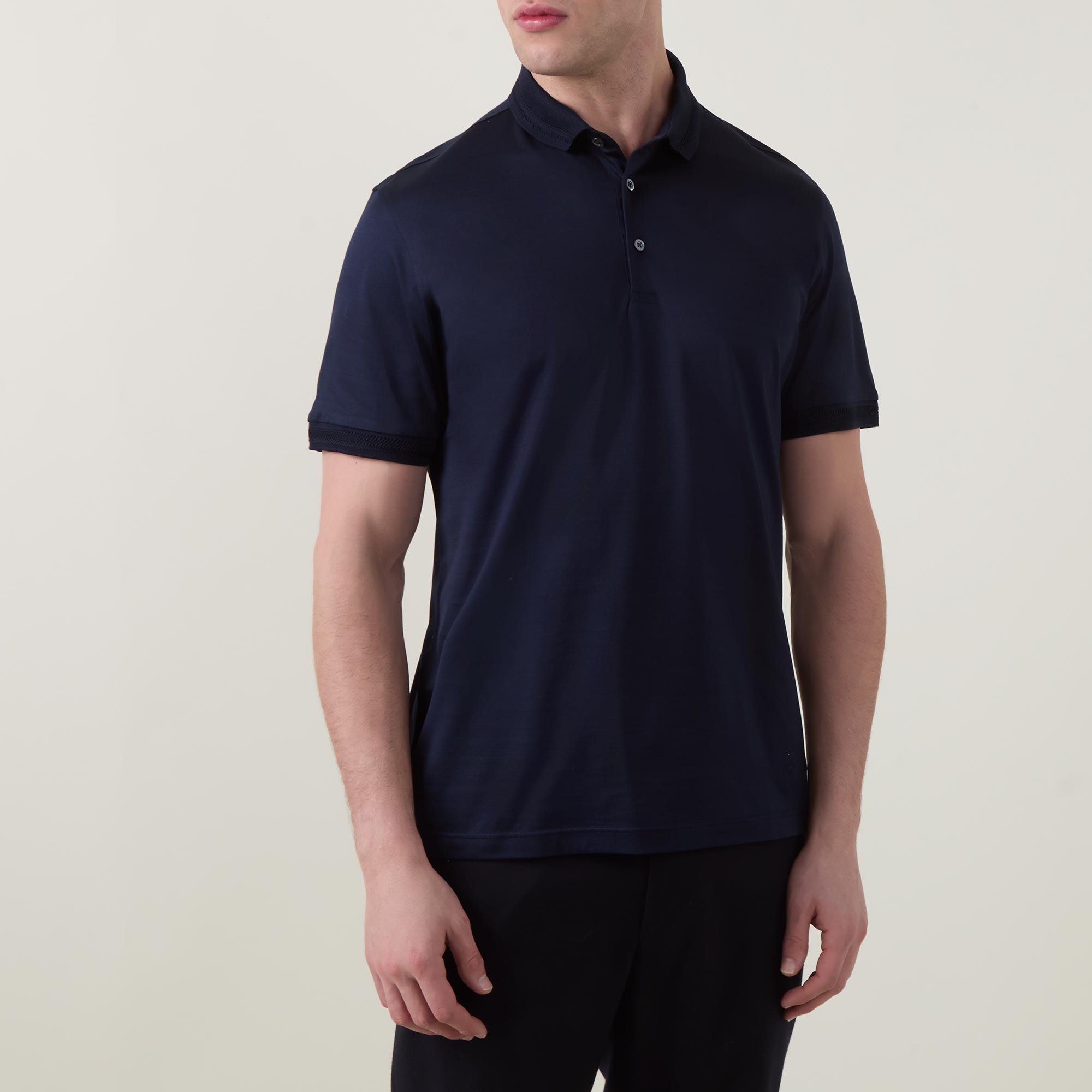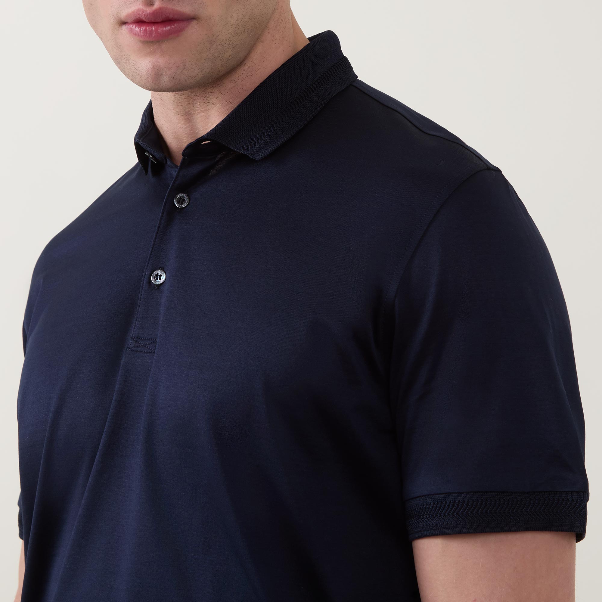 • Polo collar, short sleeves, three-button placket, tonal stitching, straight hemline, smooth fabric