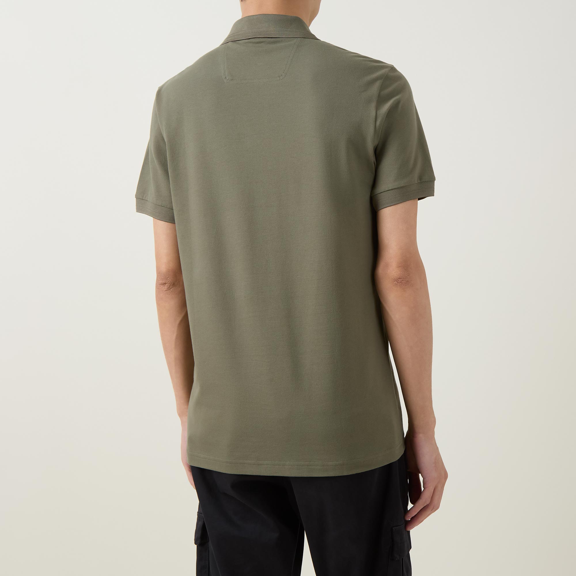 - Polo collar, short sleeves, straight hemline, logo detail, button fastenings