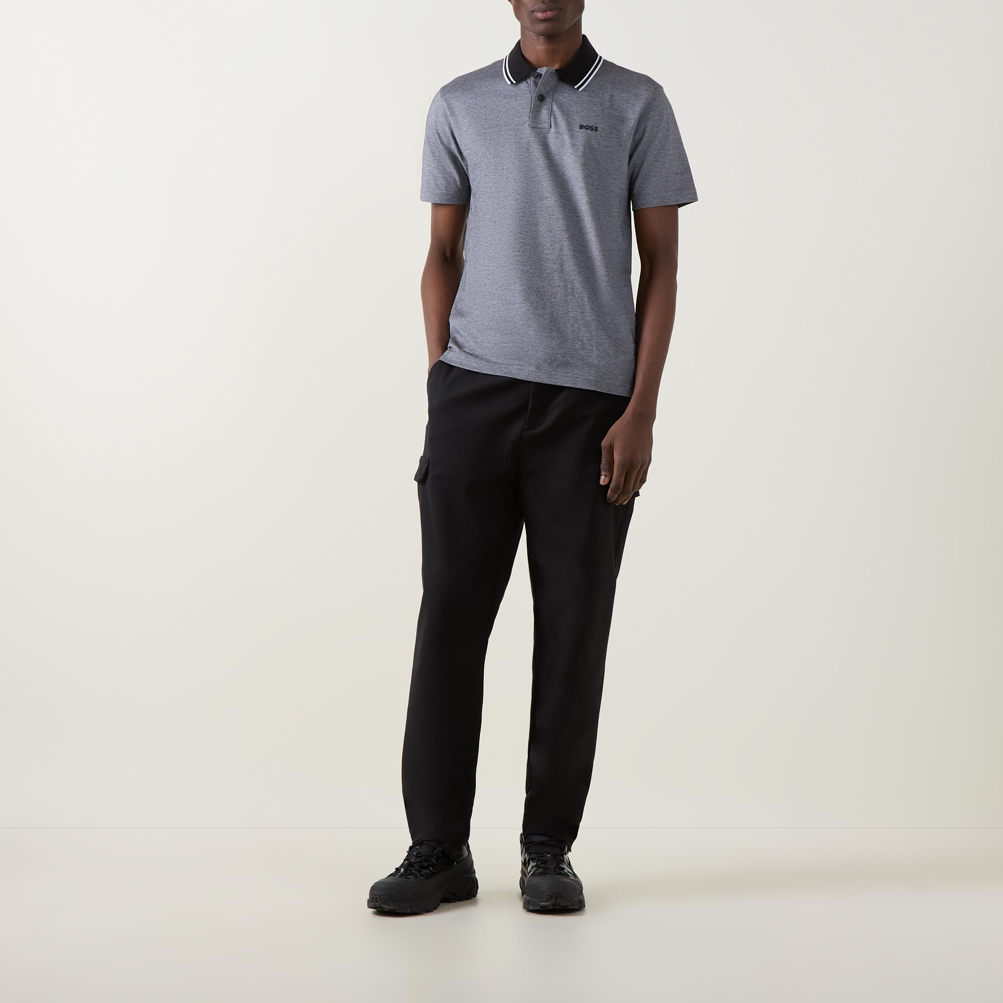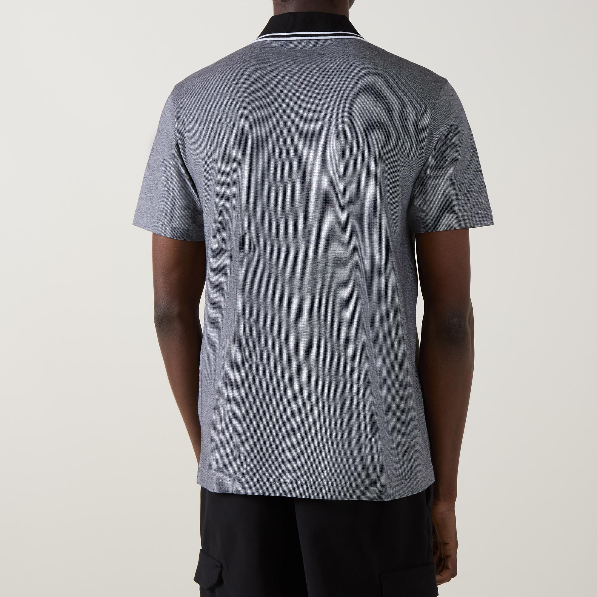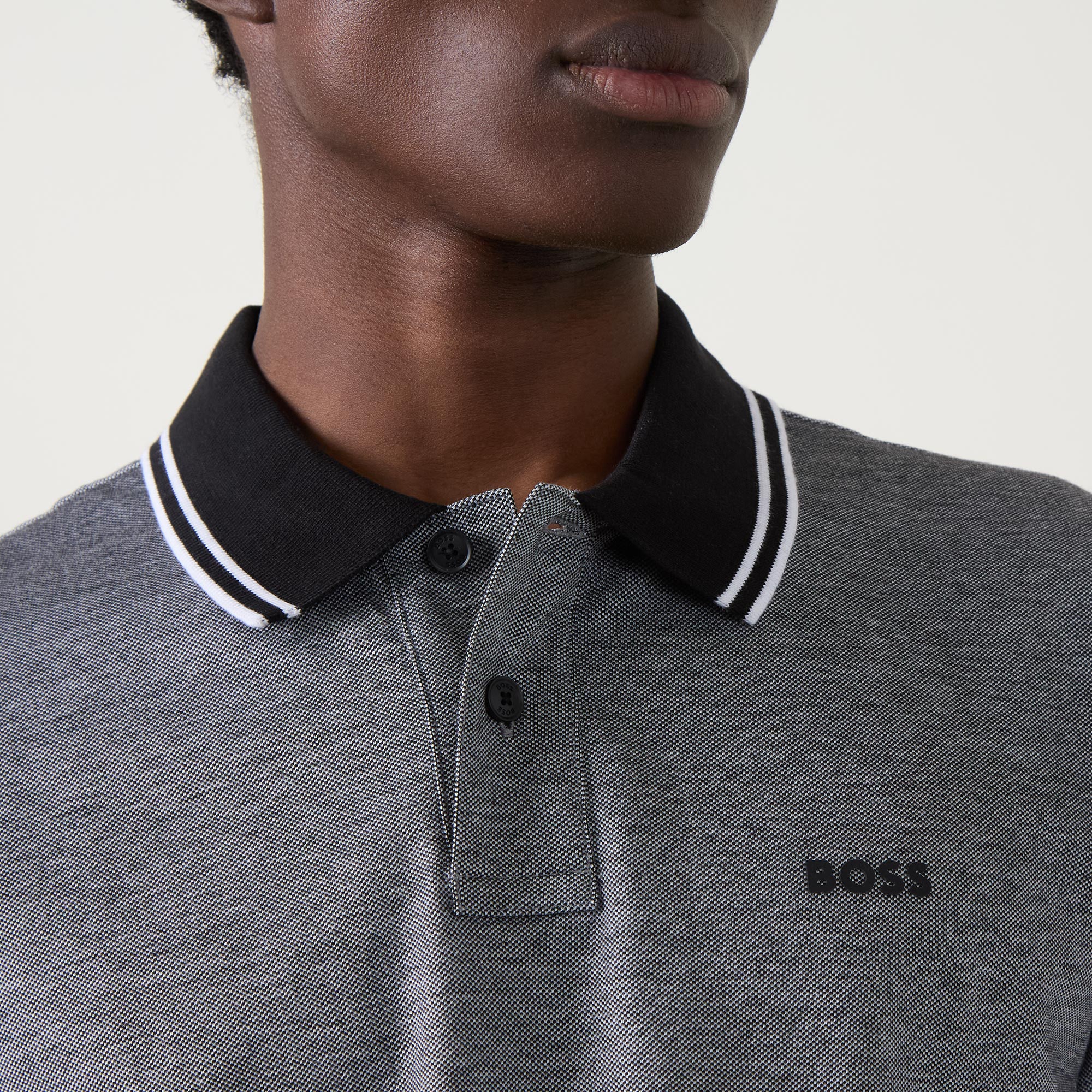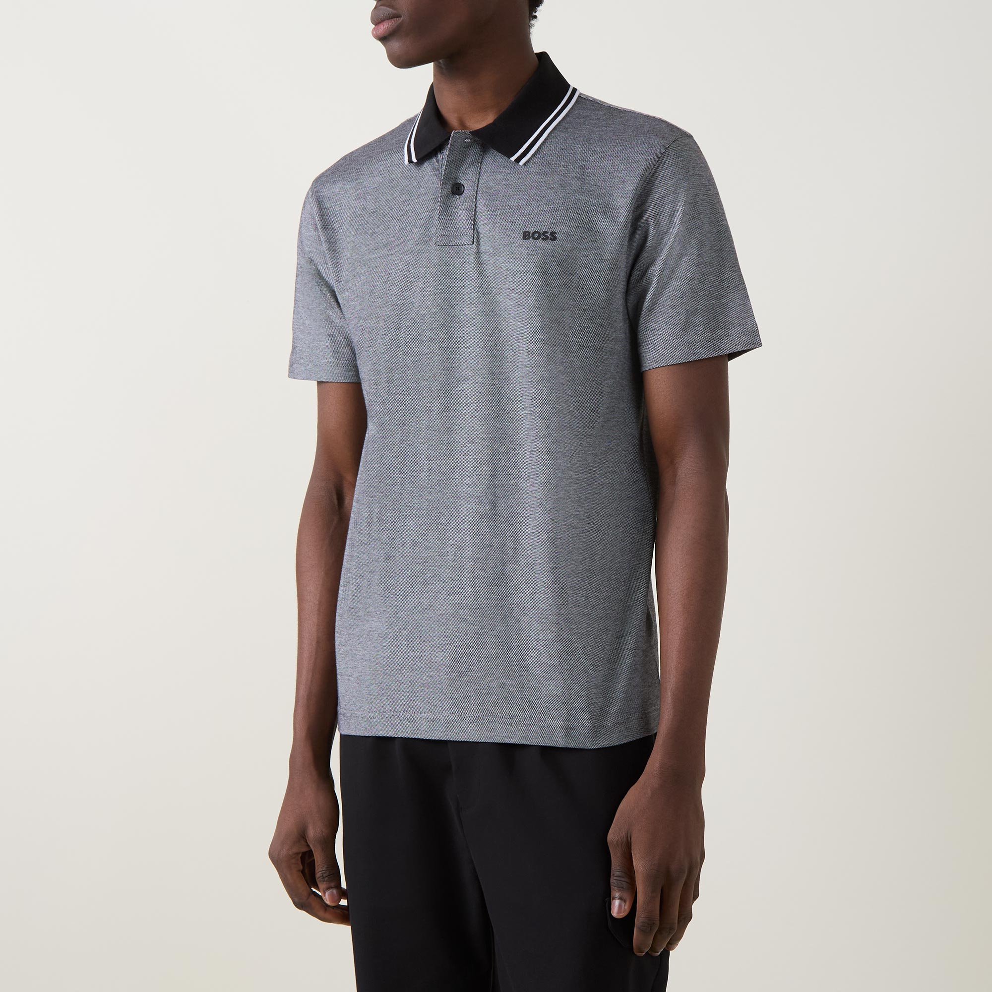 - Tipped trims, polo collar, short sleeves, logo detail, straight hemline, button fastenings