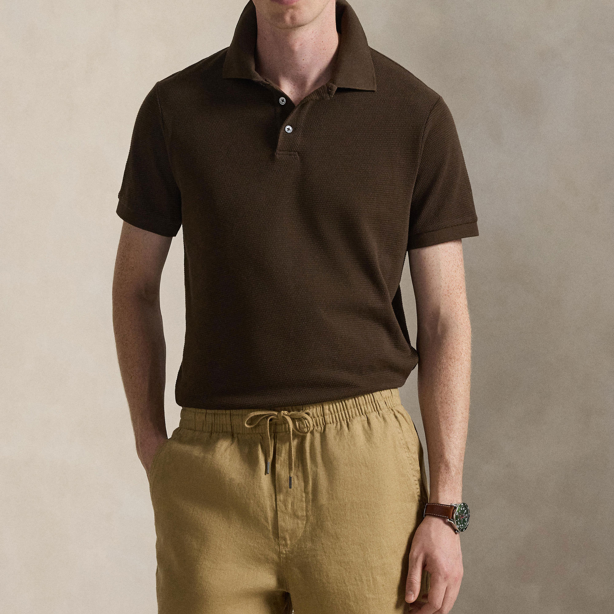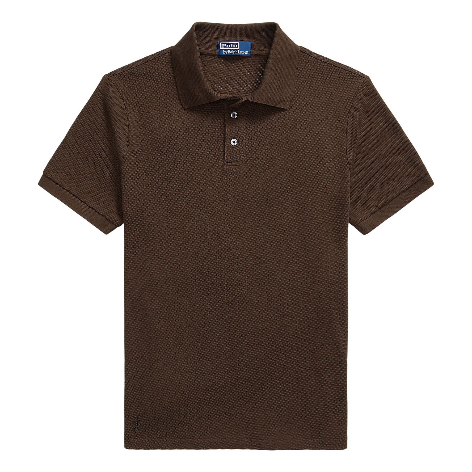 - Ribbed polo collar, three-button placket, mother-of-pearl logo buttons, short sleeves, ribbed armbands, even vented hem, signature embroidered Pony logo, pointelle-textured fabric