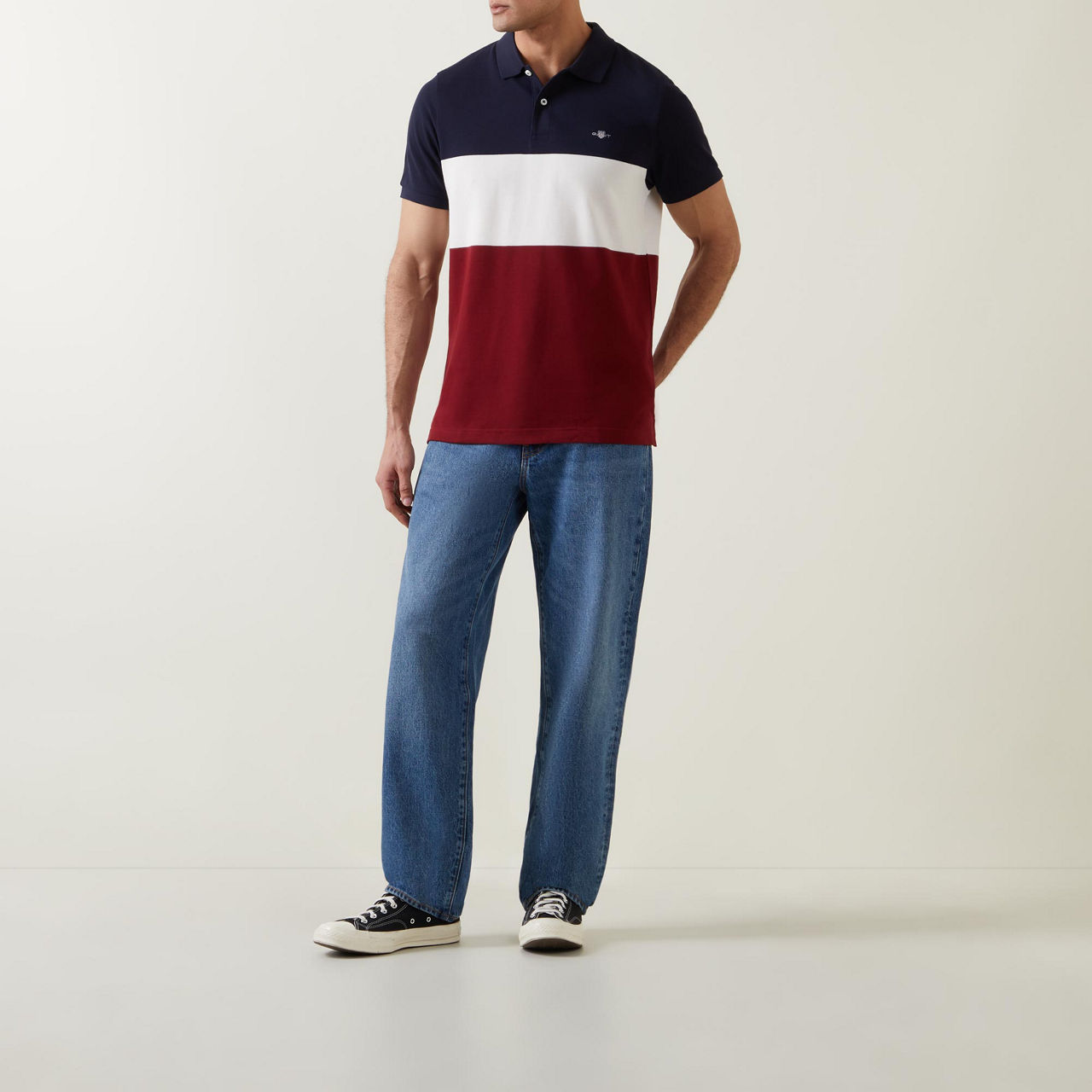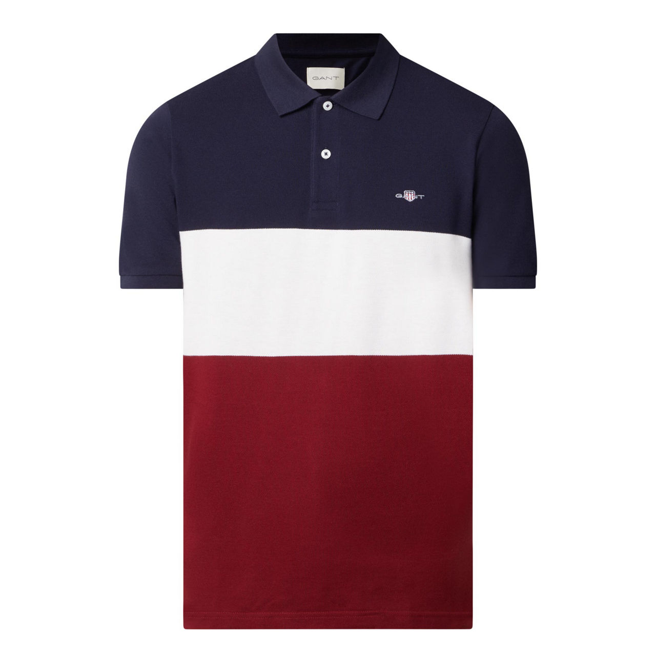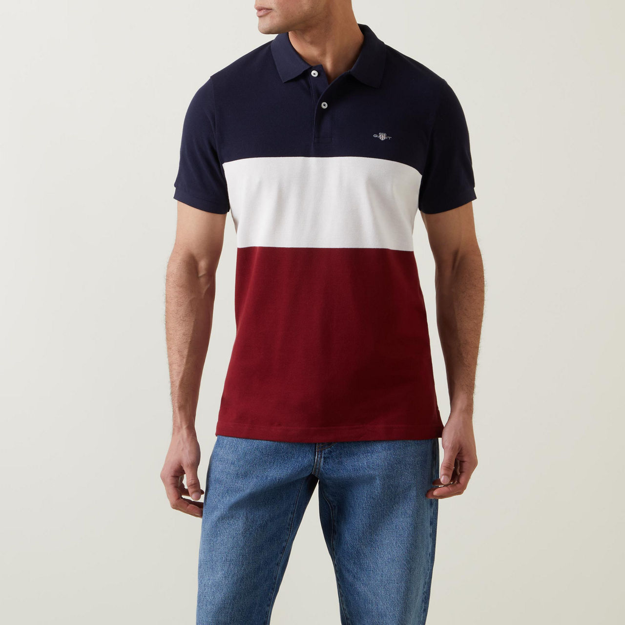 - Shield logo, striped, polo collar, button fastenings, straight hemline, short sleeves