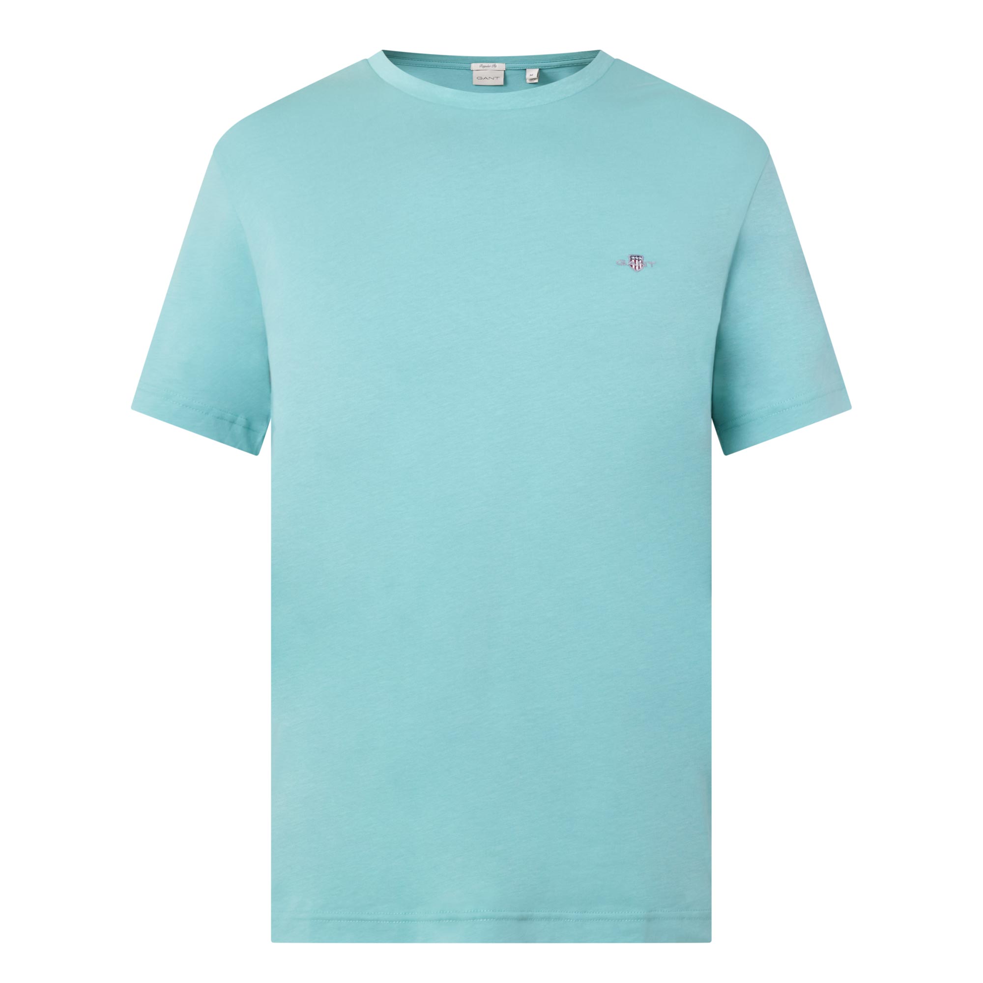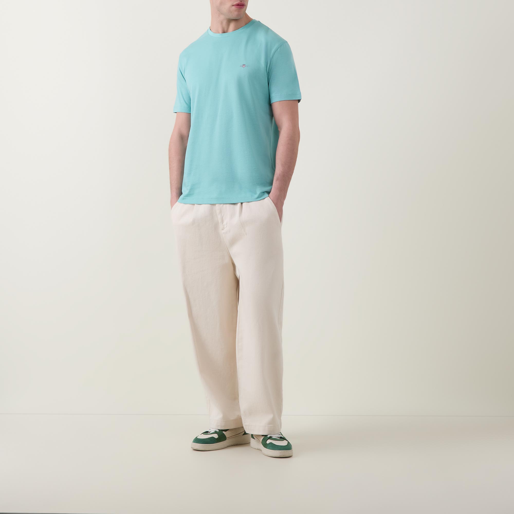 - Crew neckline, short sleeves, slightly dropped shoulders, shield logo embroidery, tonal stitching, straight hemline, smooth fabric