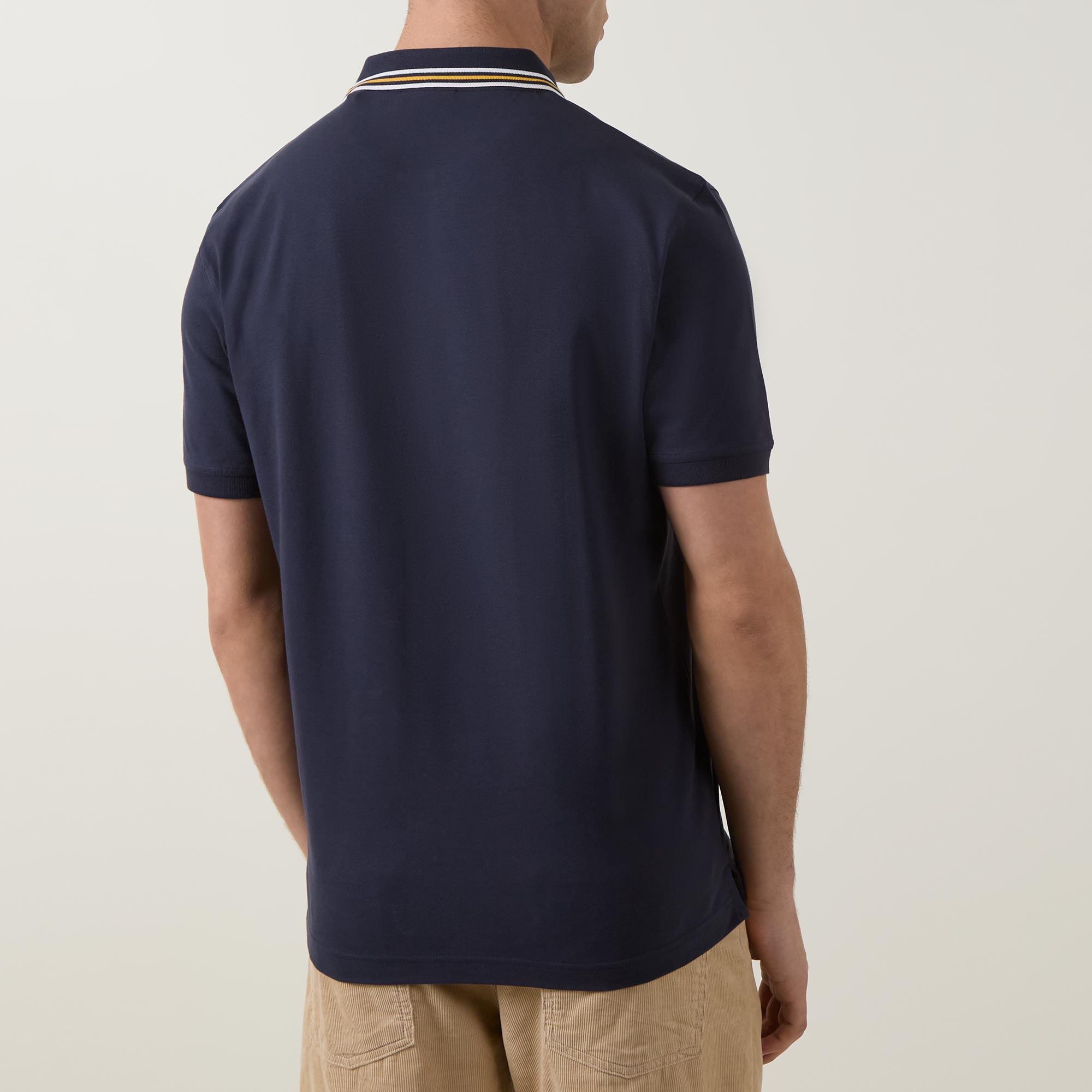 - Polo collar, short sleeves, shield logo, straight hemline, tipped trims