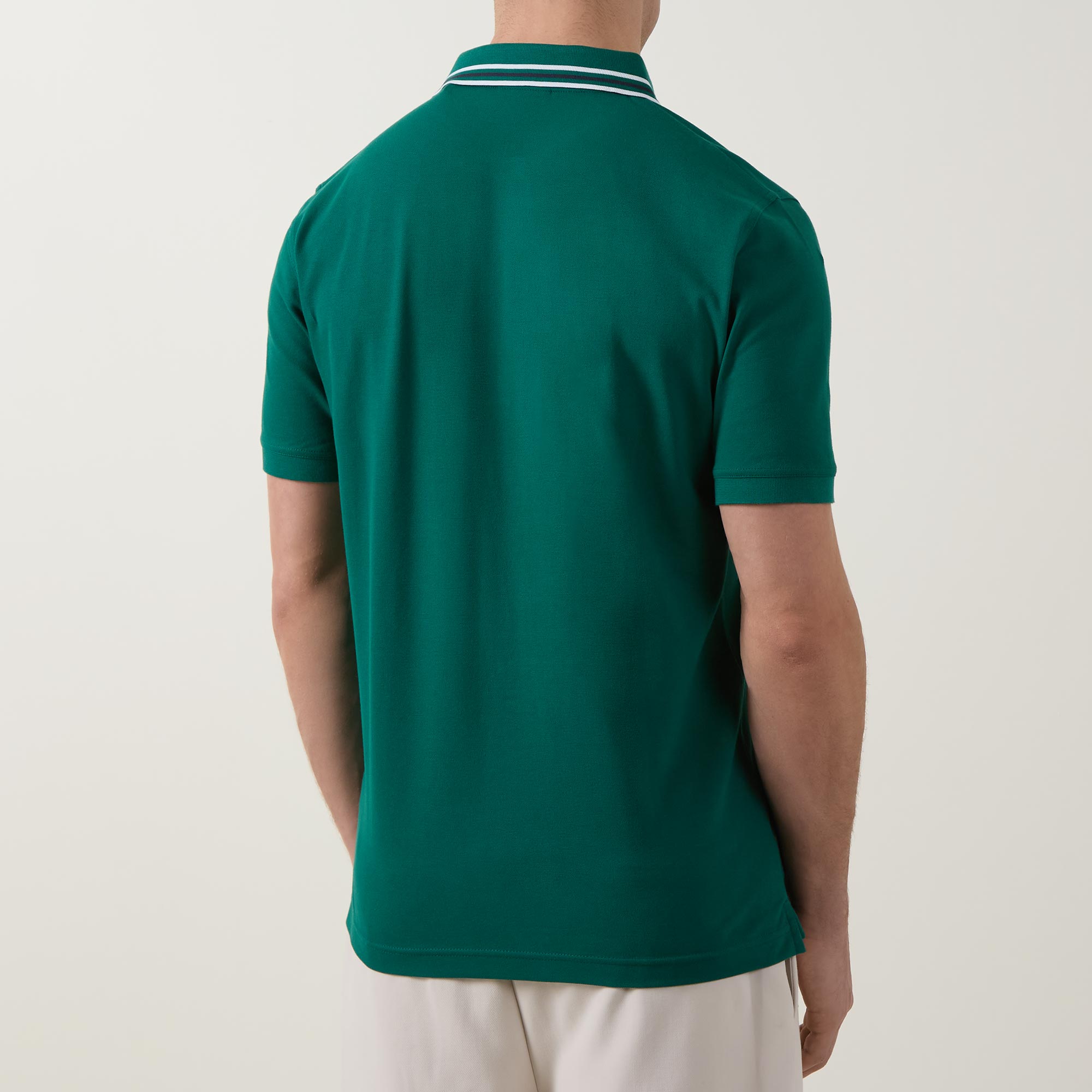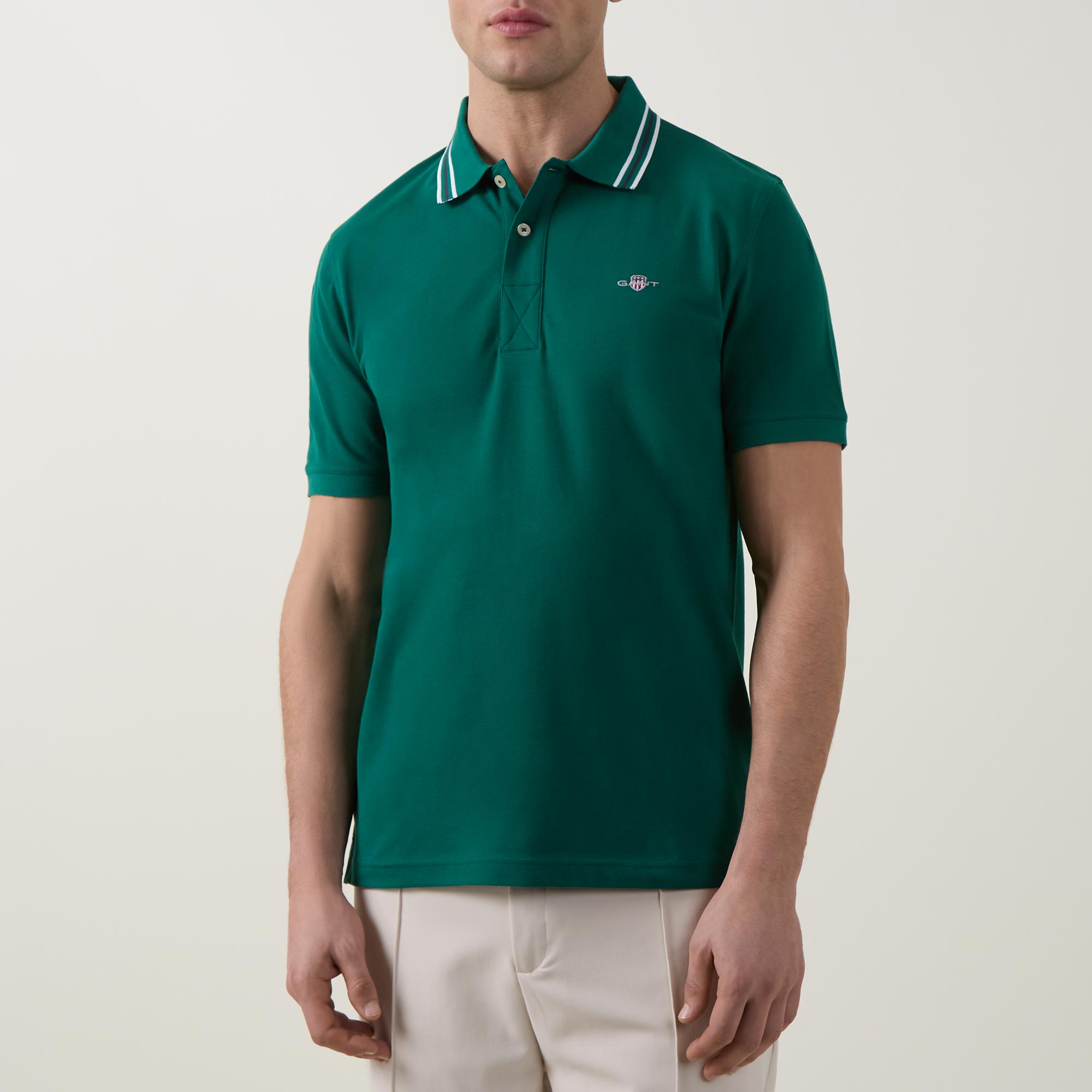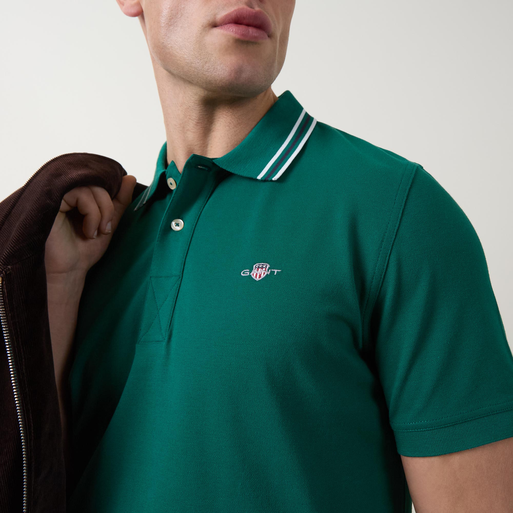 - Polo collar, short sleeves, shield logo, straight hemline, tipped trims