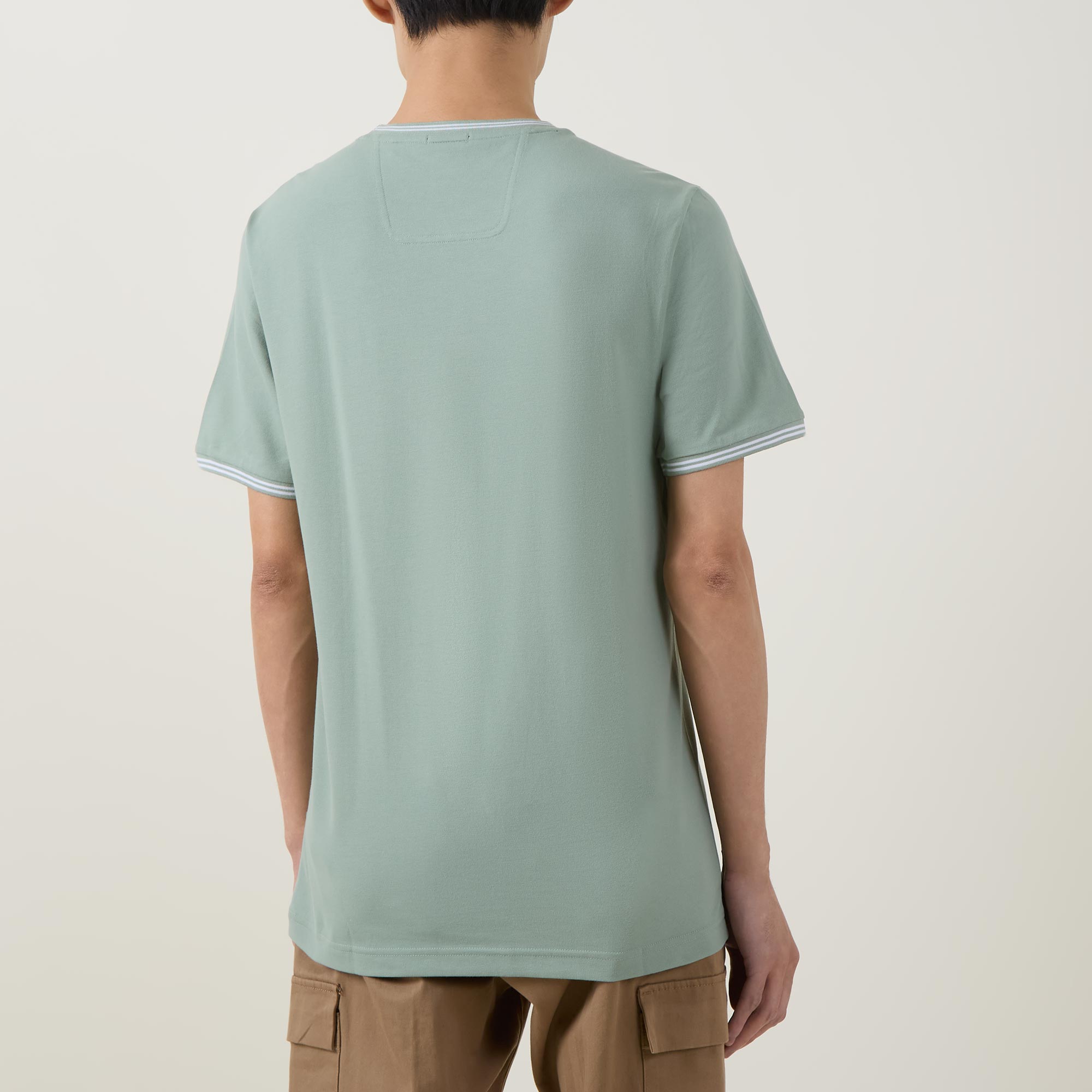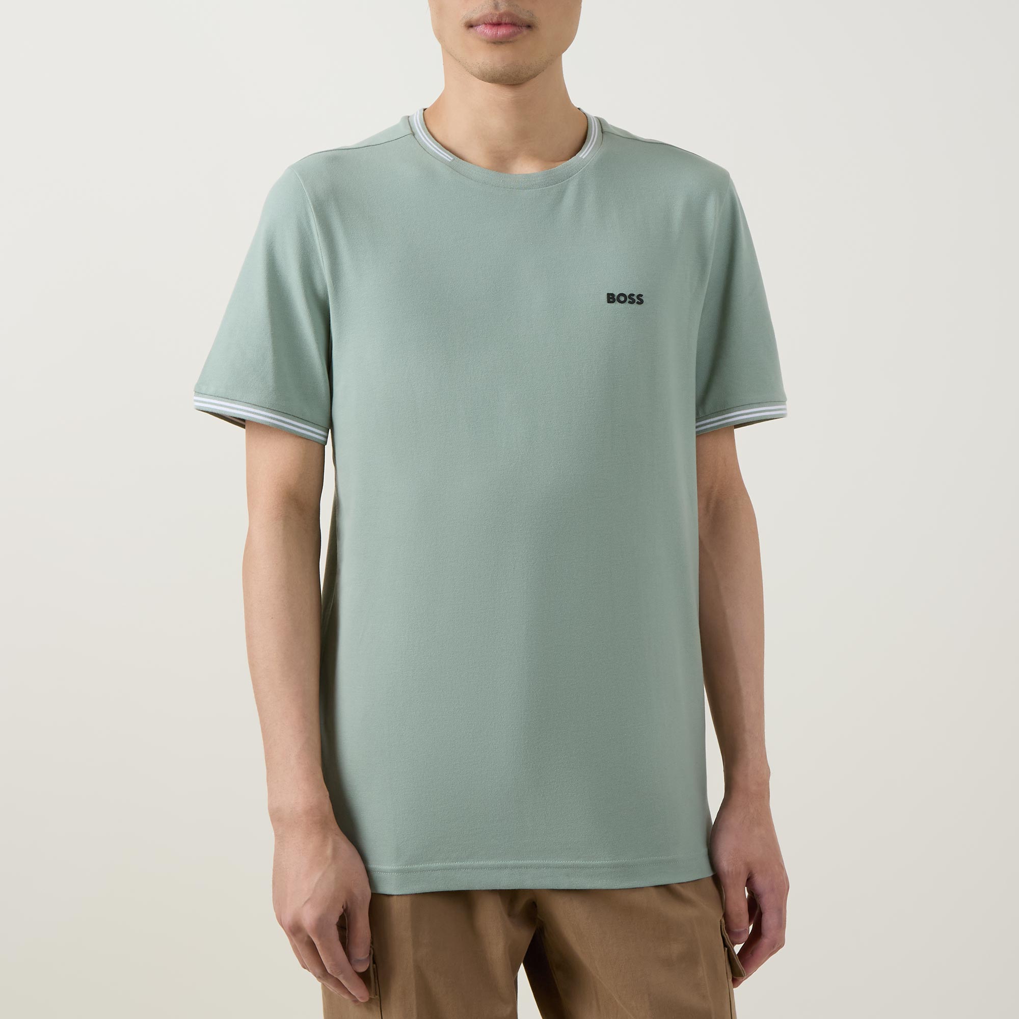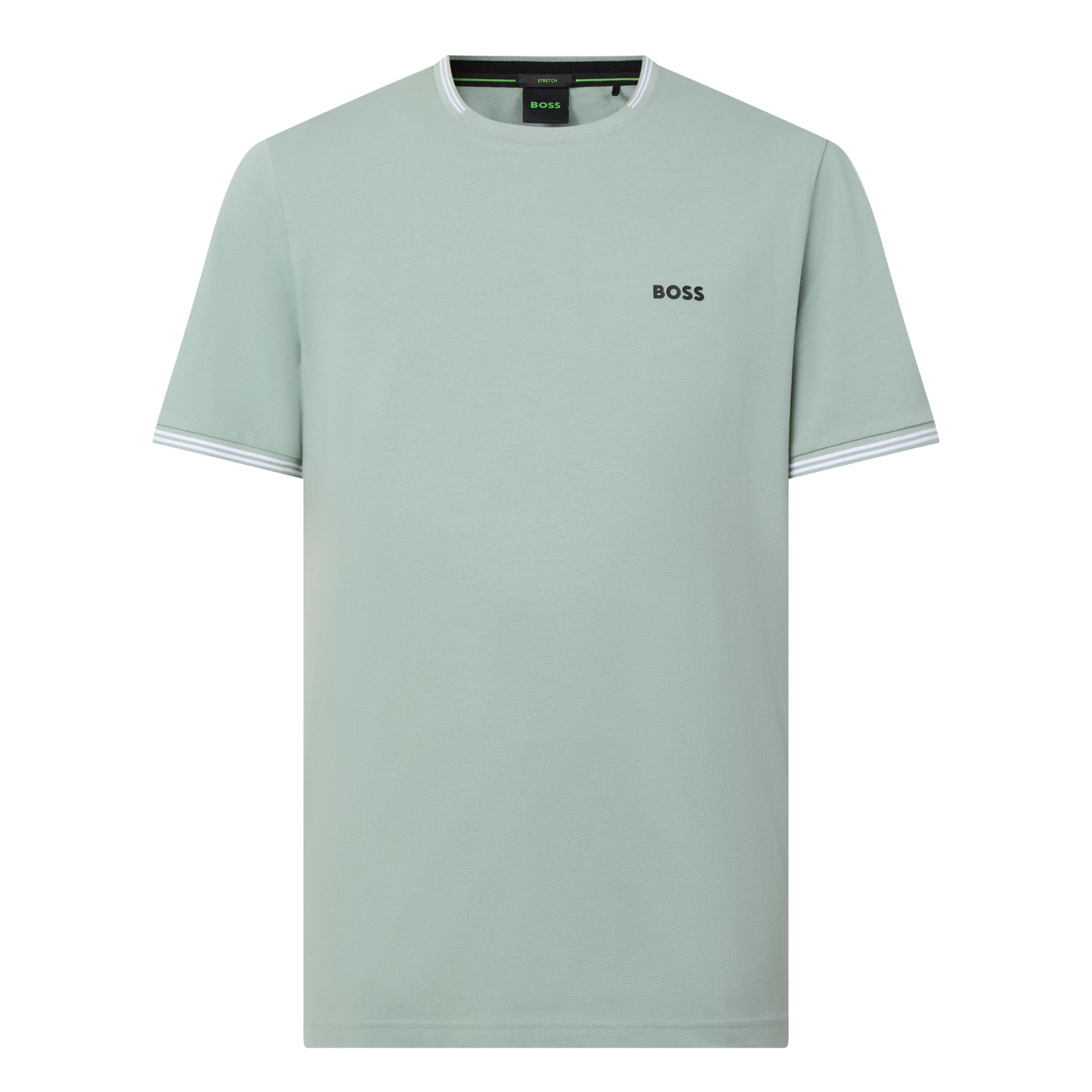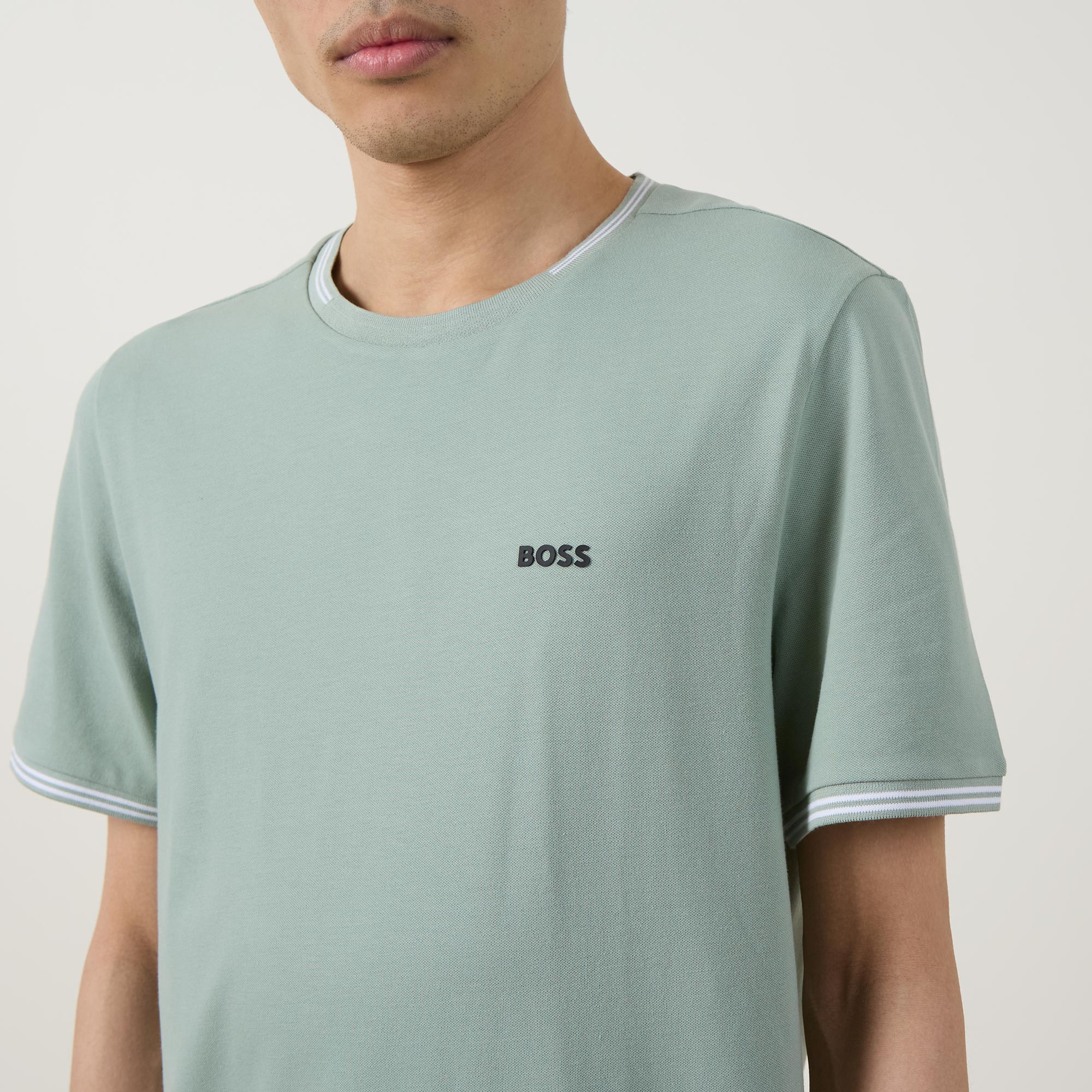 - Crew neck, short sleeves, tipped trims, straight hem, contrast logo detail on the chest, tonal stitching, stretch fabric, smooth finish