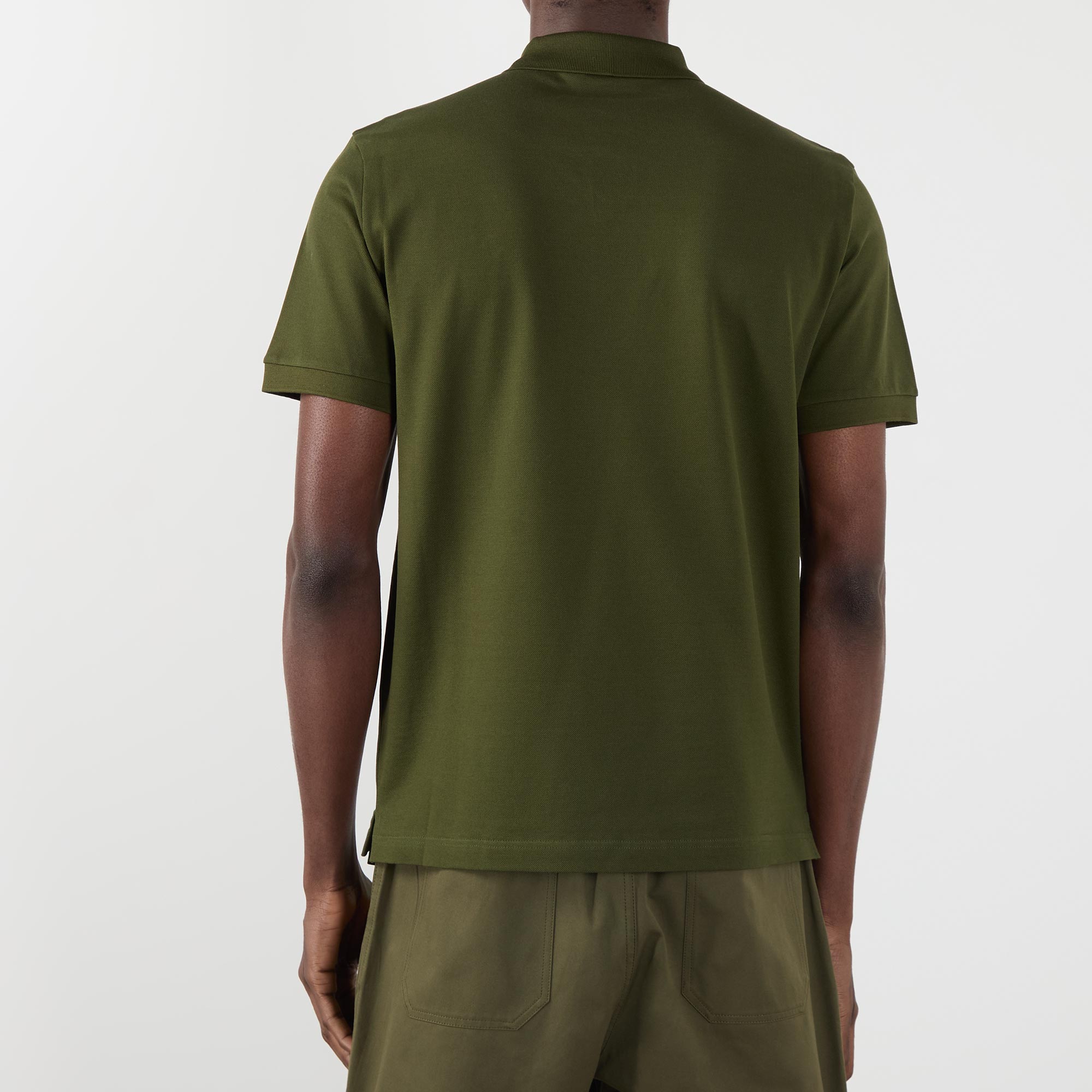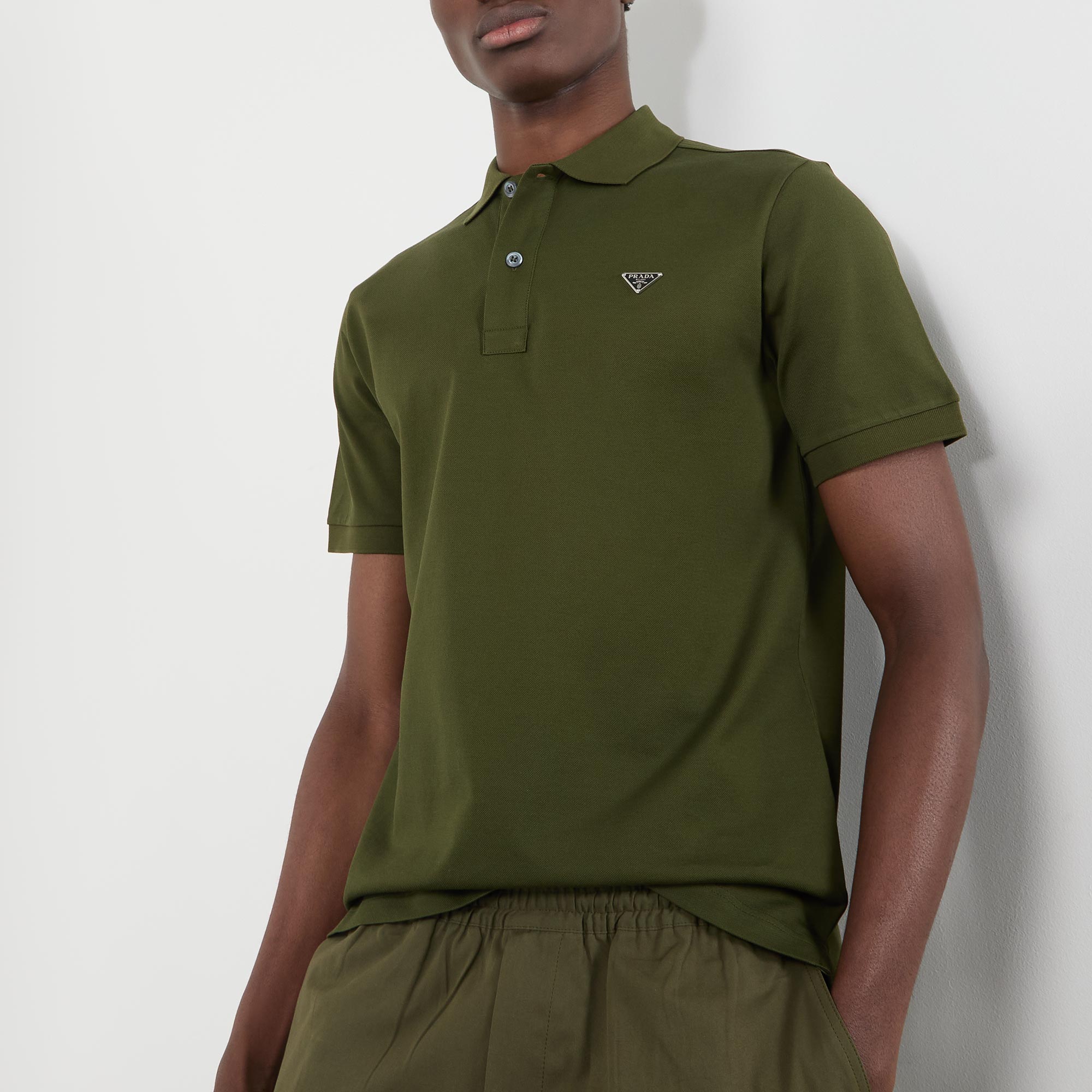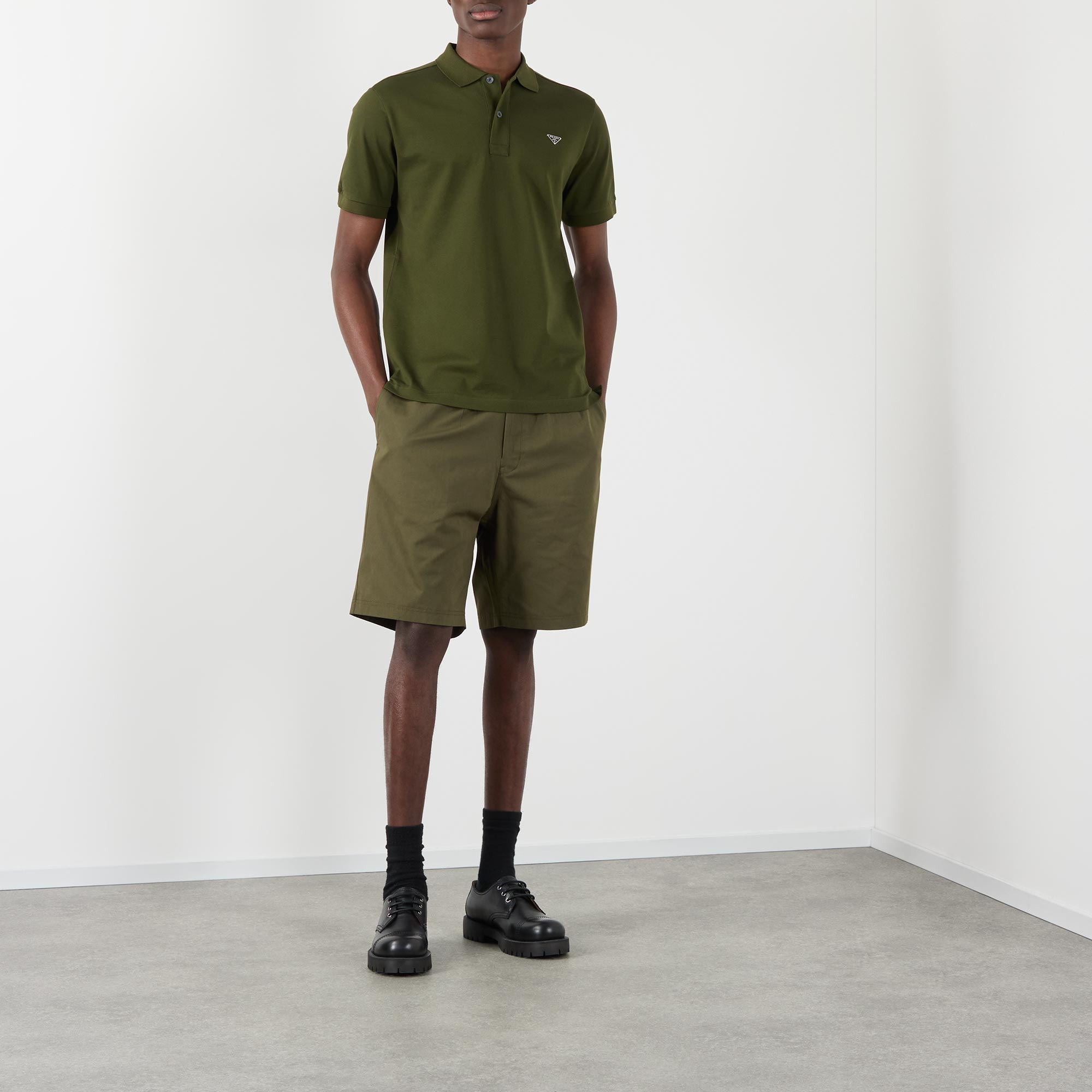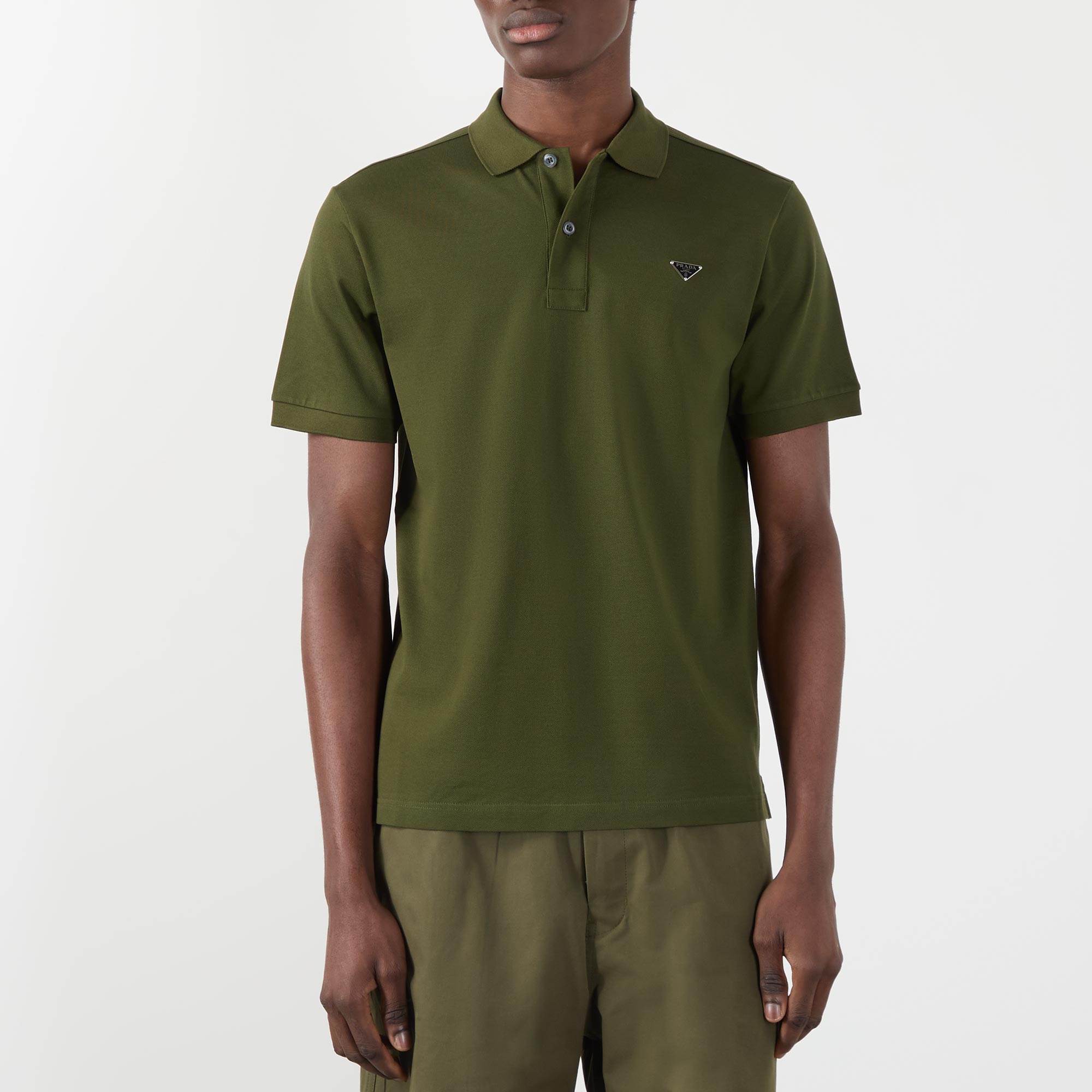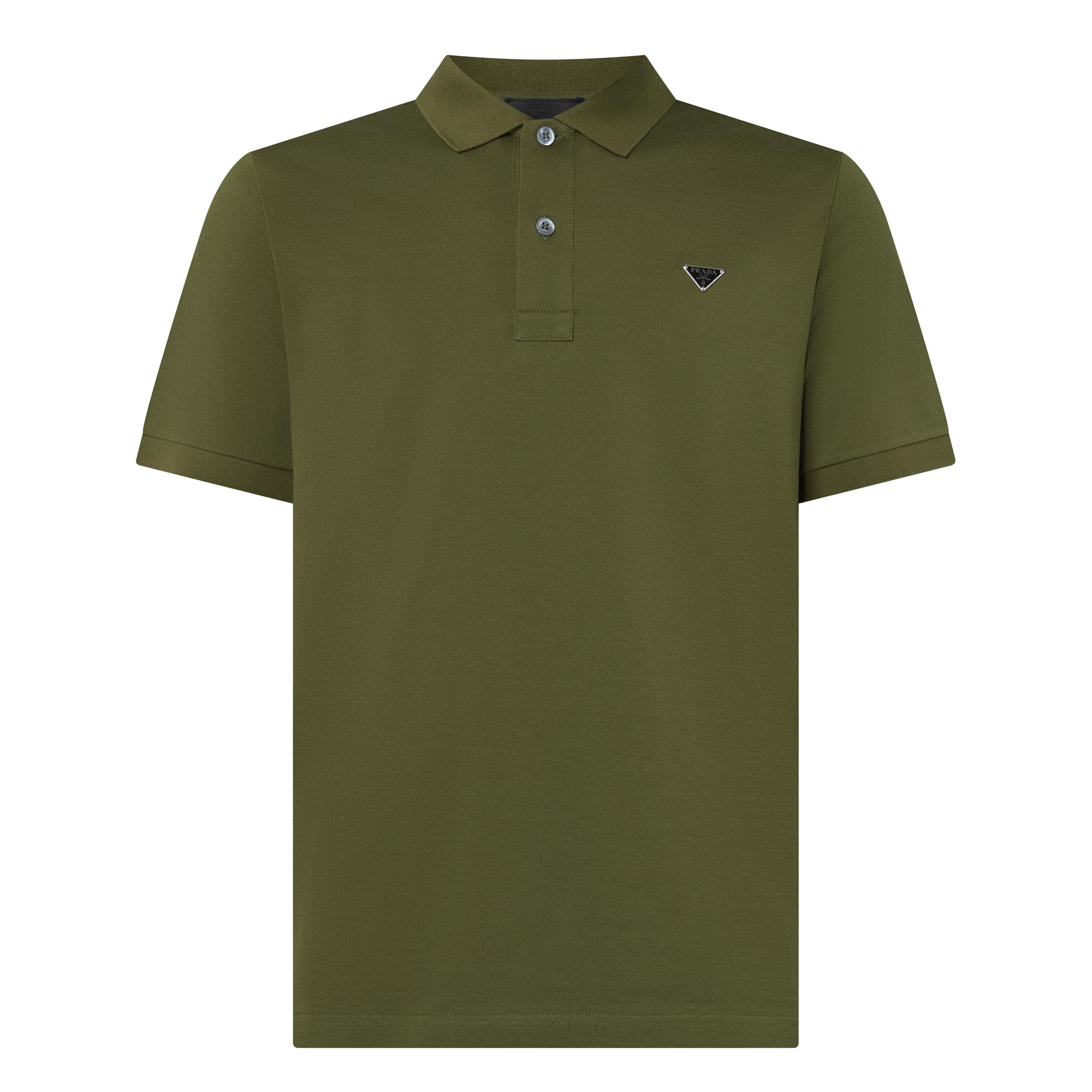 - Polo collar, two button placket, short sleeves, straight hem, side split detailing, tonal stitching, triangle logo hardware, smooth finish