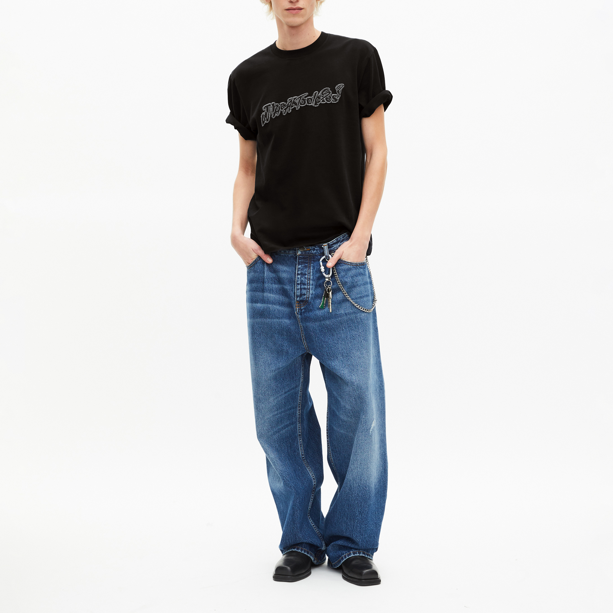 - Washed finish, screen-printed denim patch, straight silhouette, round neckline, short sleeves