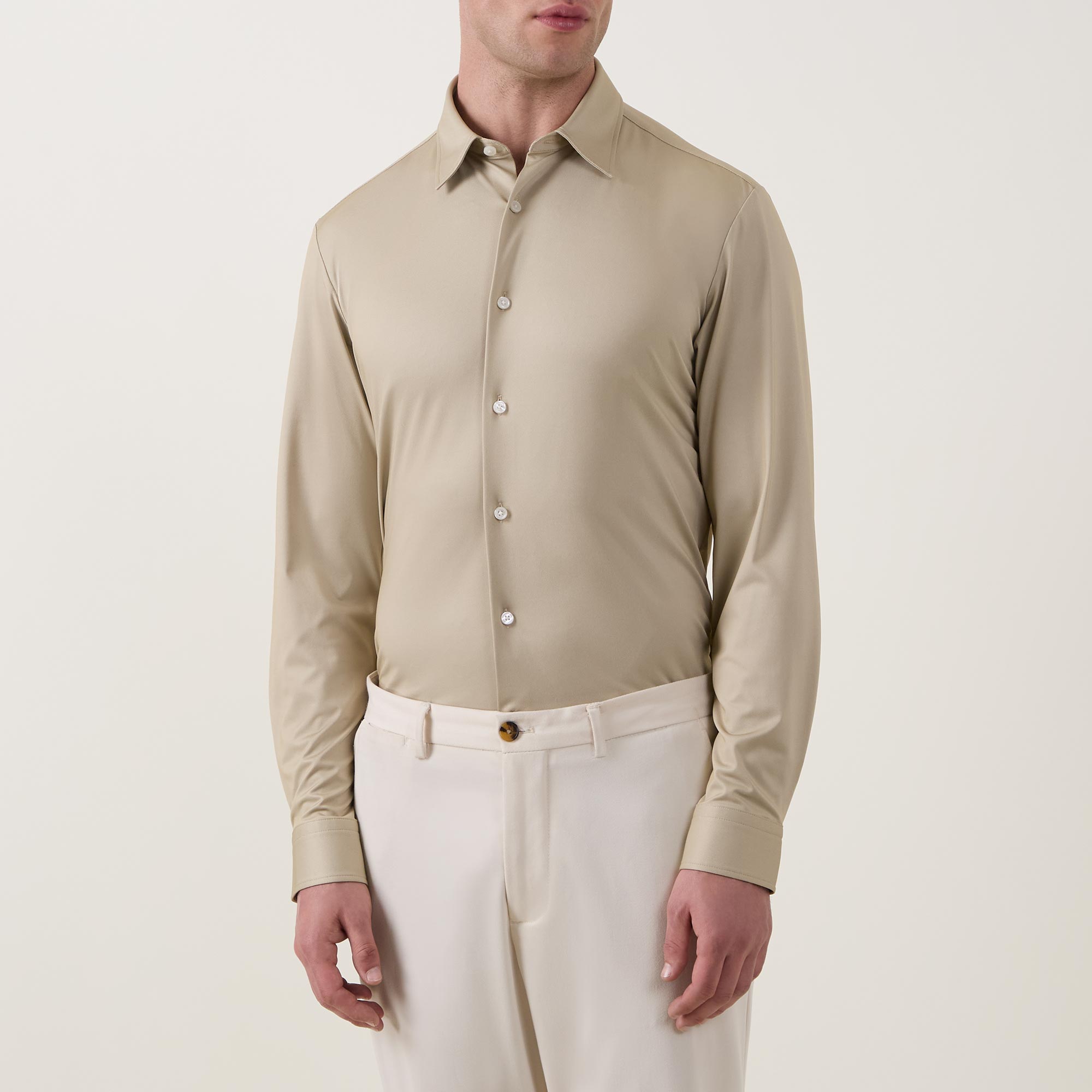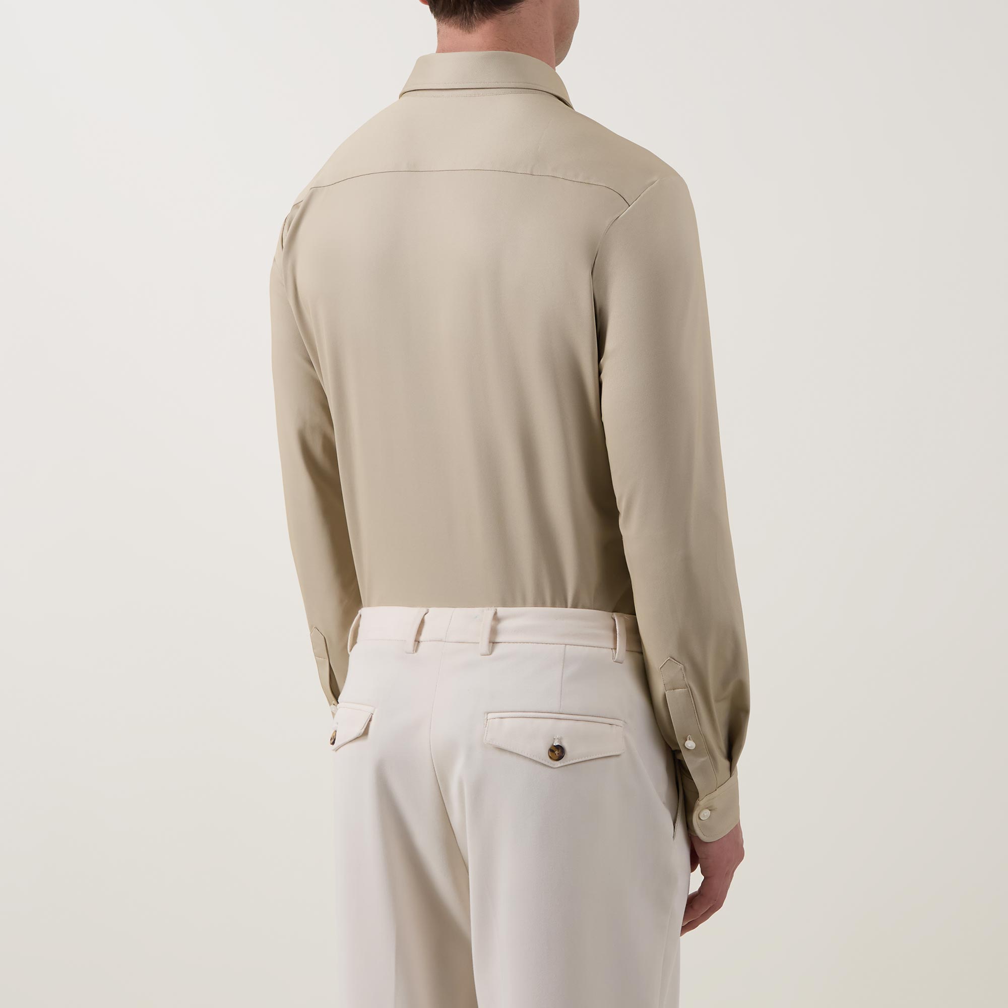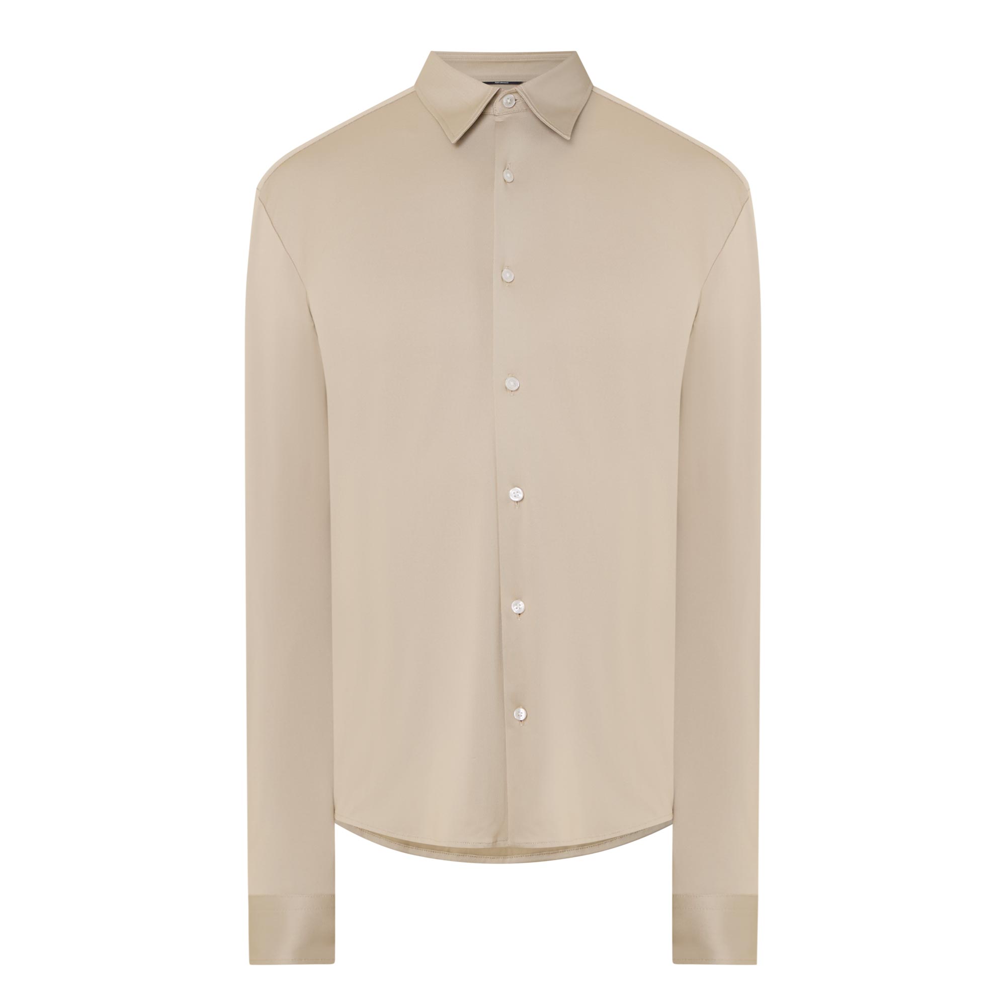 - Stretch design, pointed collar, long sleeves, button fastenings, curved hemline