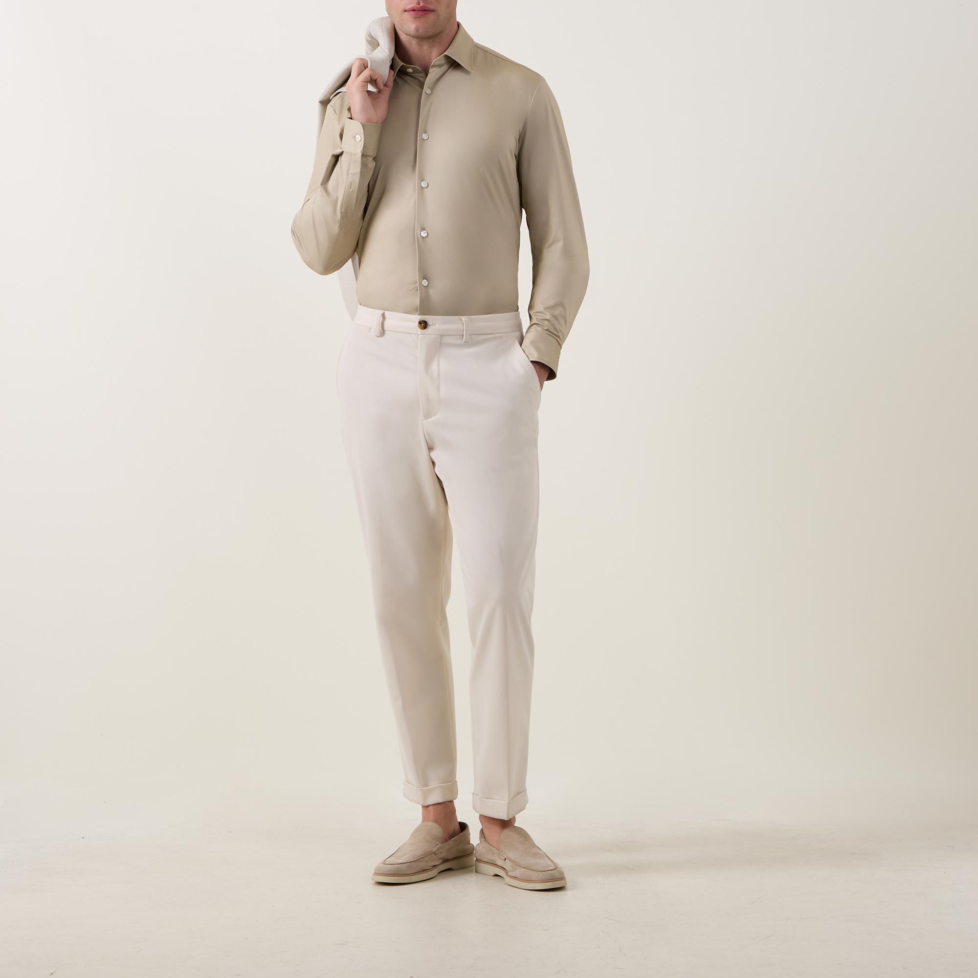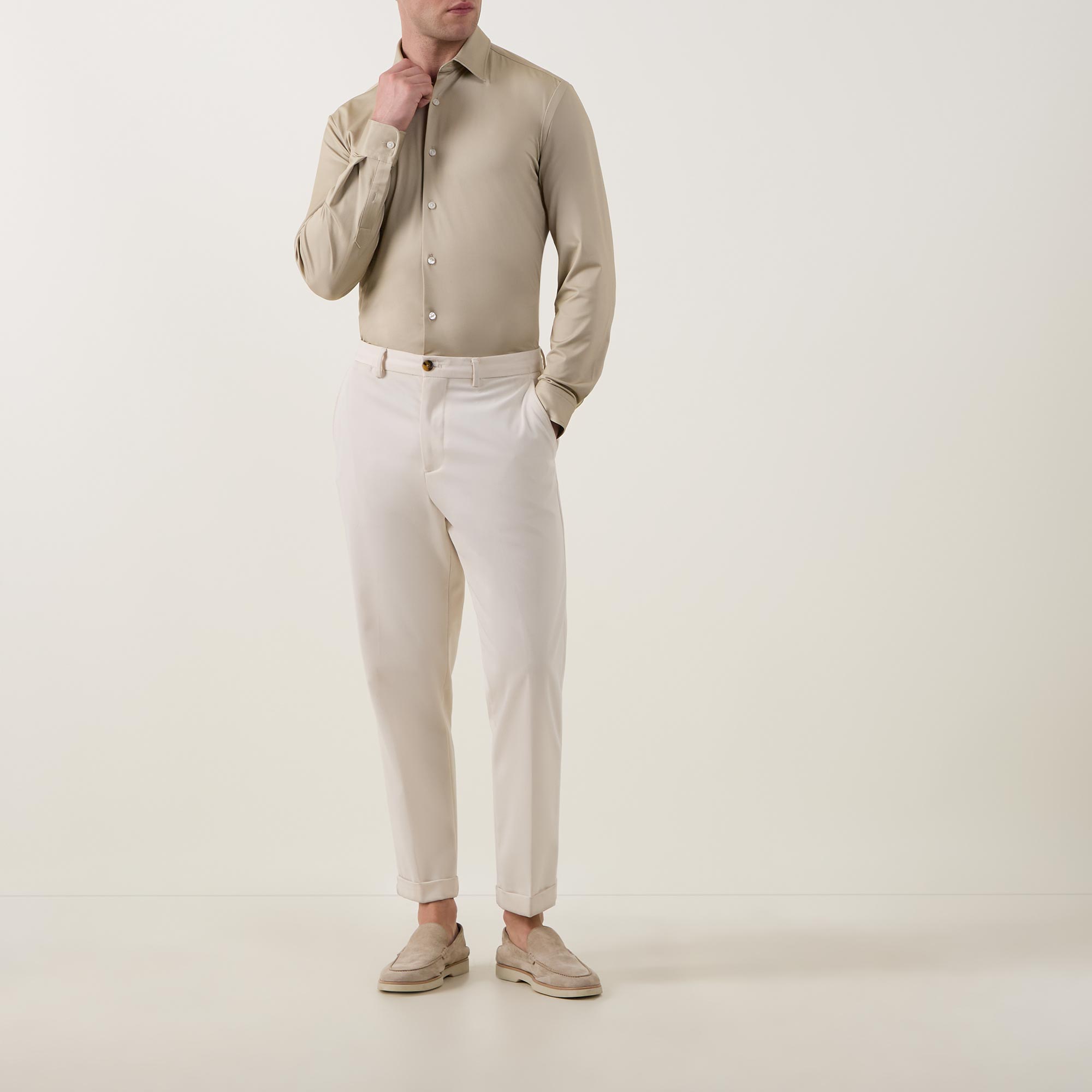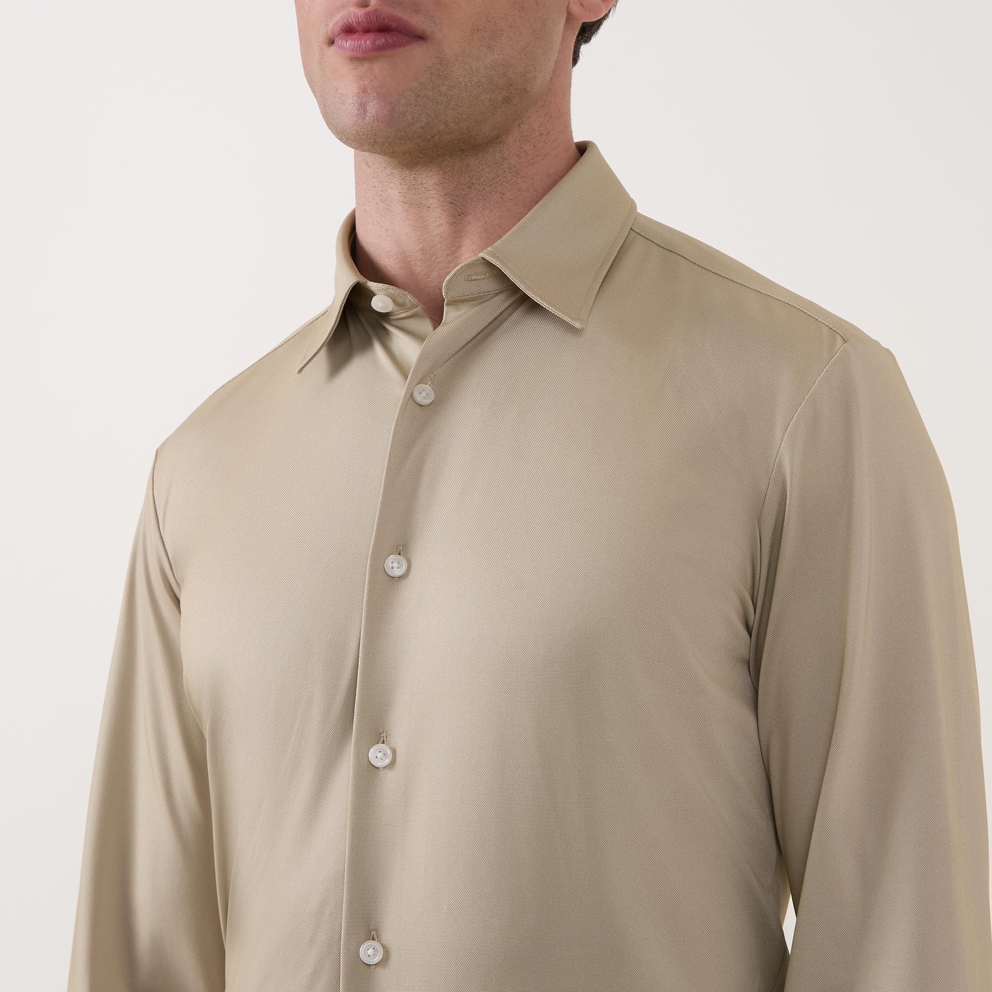 - Stretch design, pointed collar, long sleeves, button fastenings, curved hemline