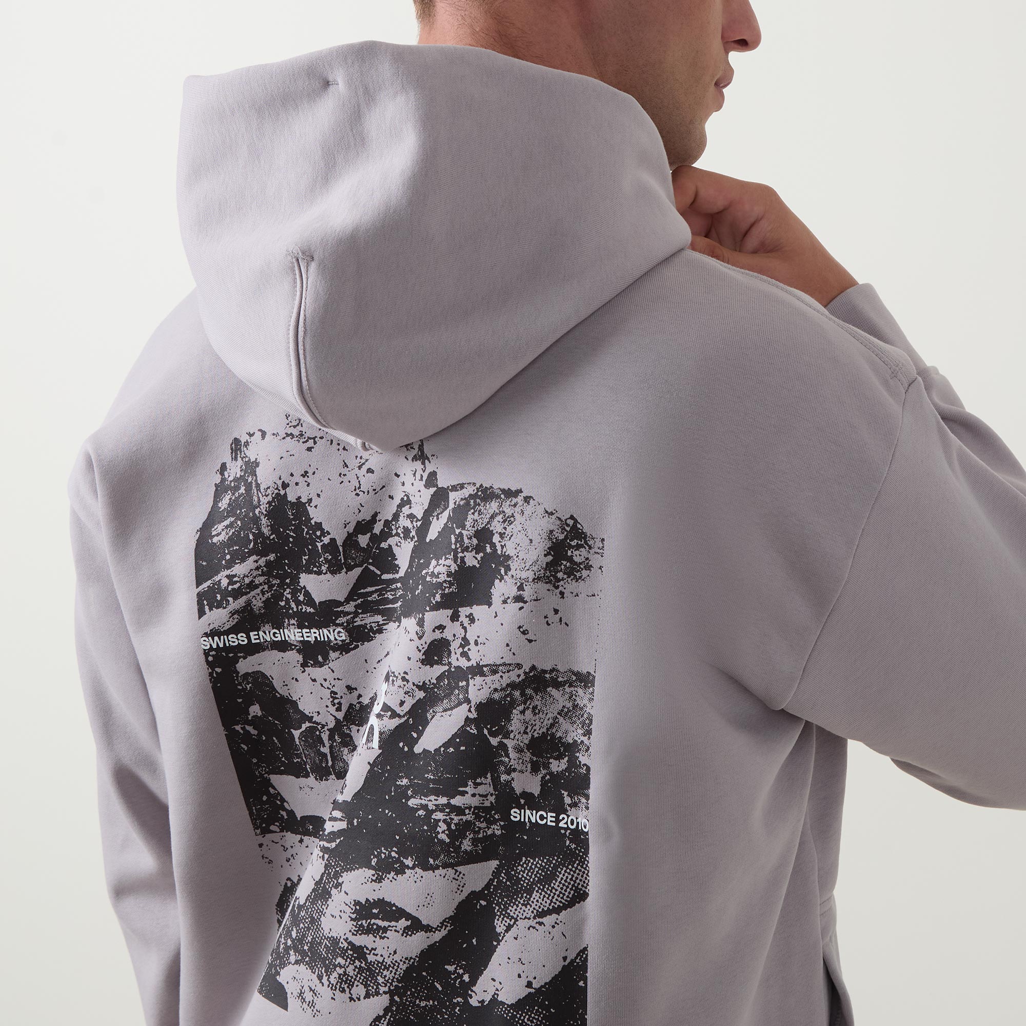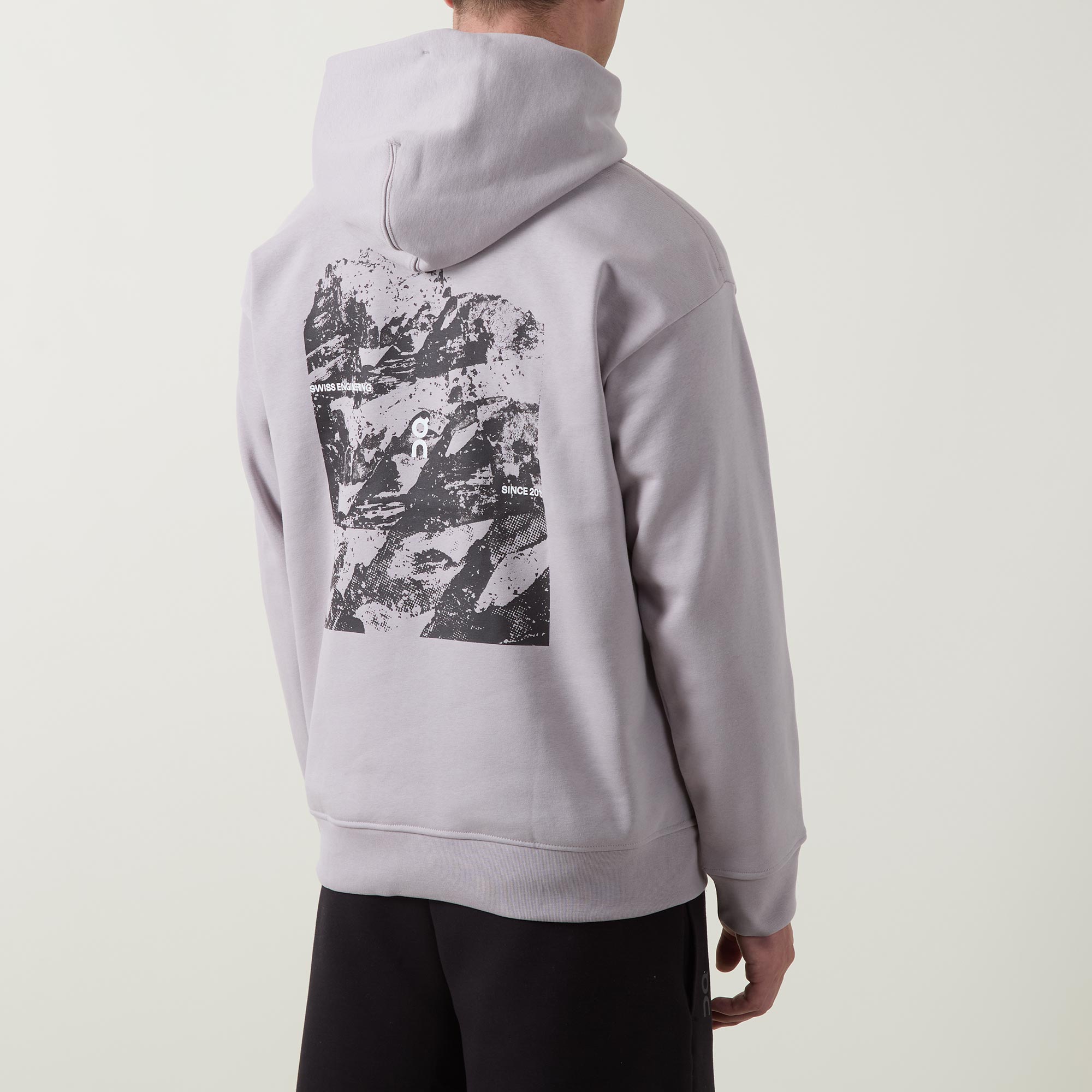 - Hood with drawstring adjustable fit, ribbed trims, heavyweight fabric, soft and brushed interior, mountain graphic print, logo details